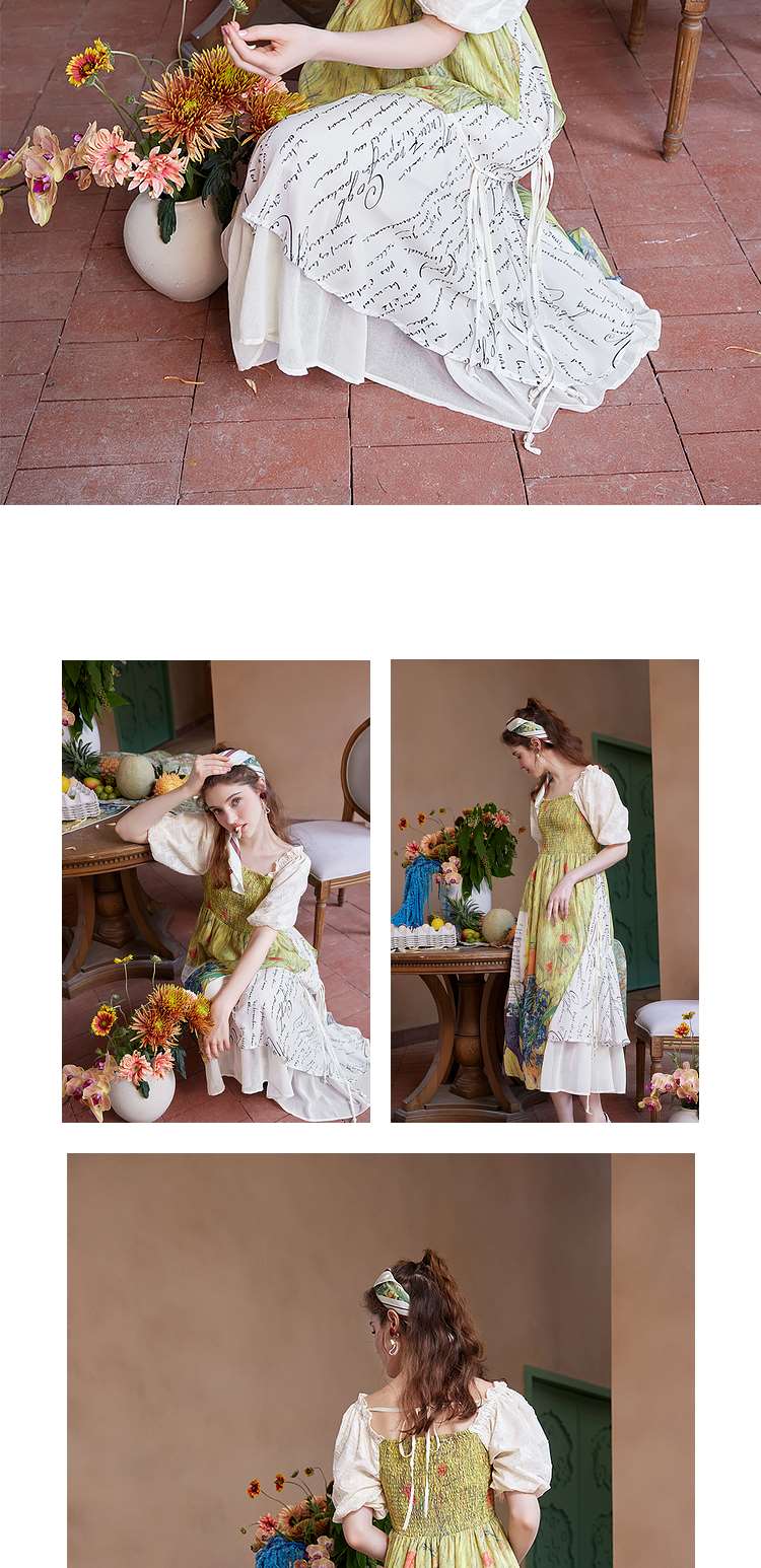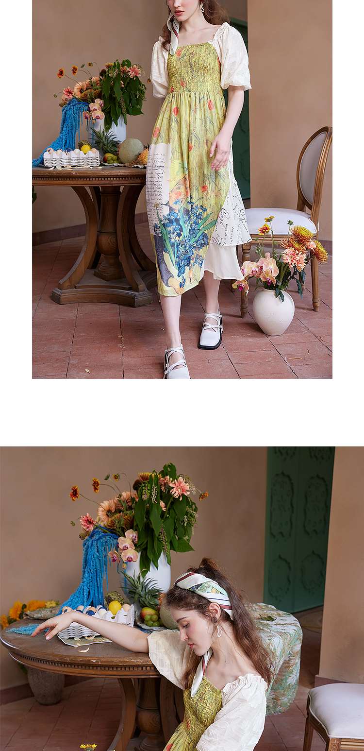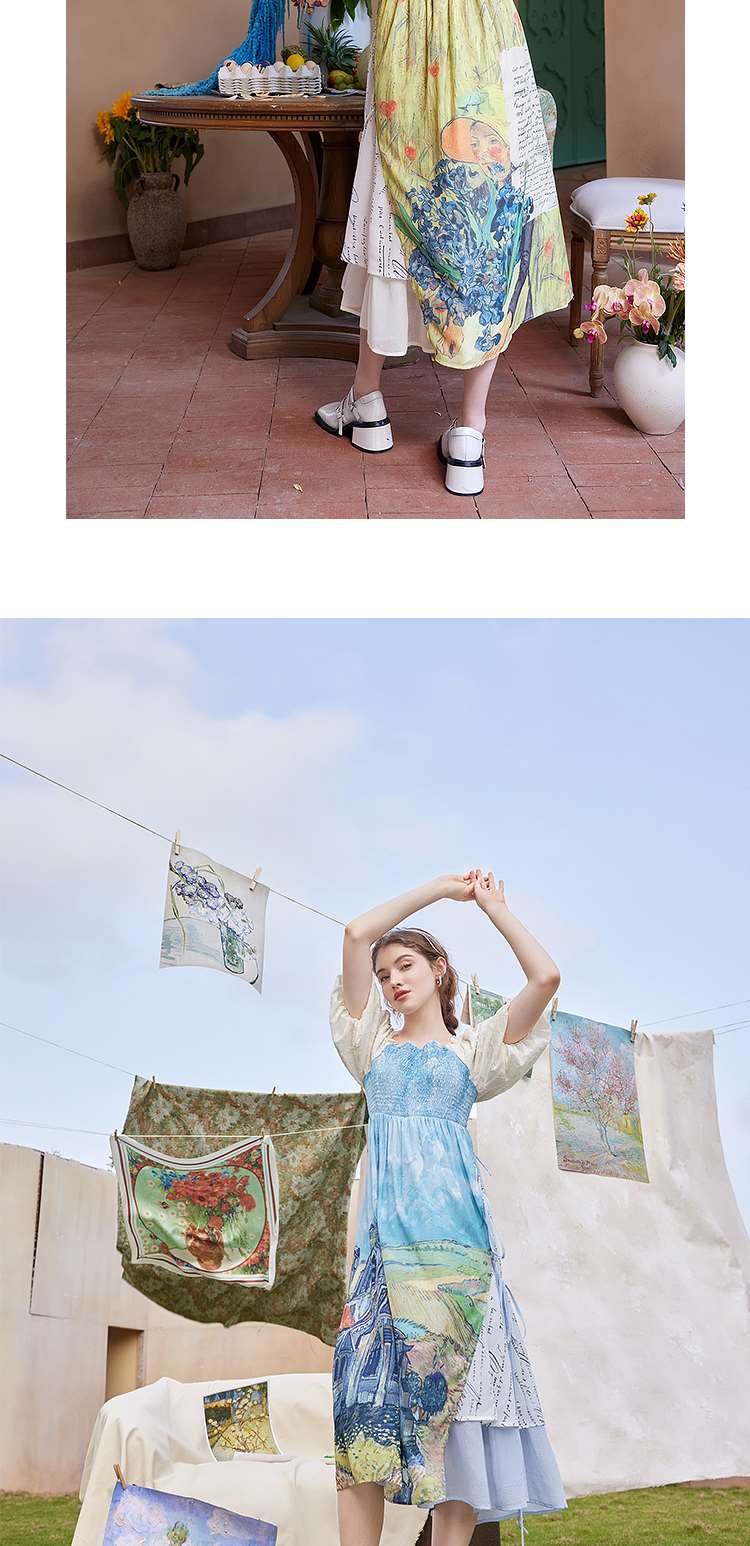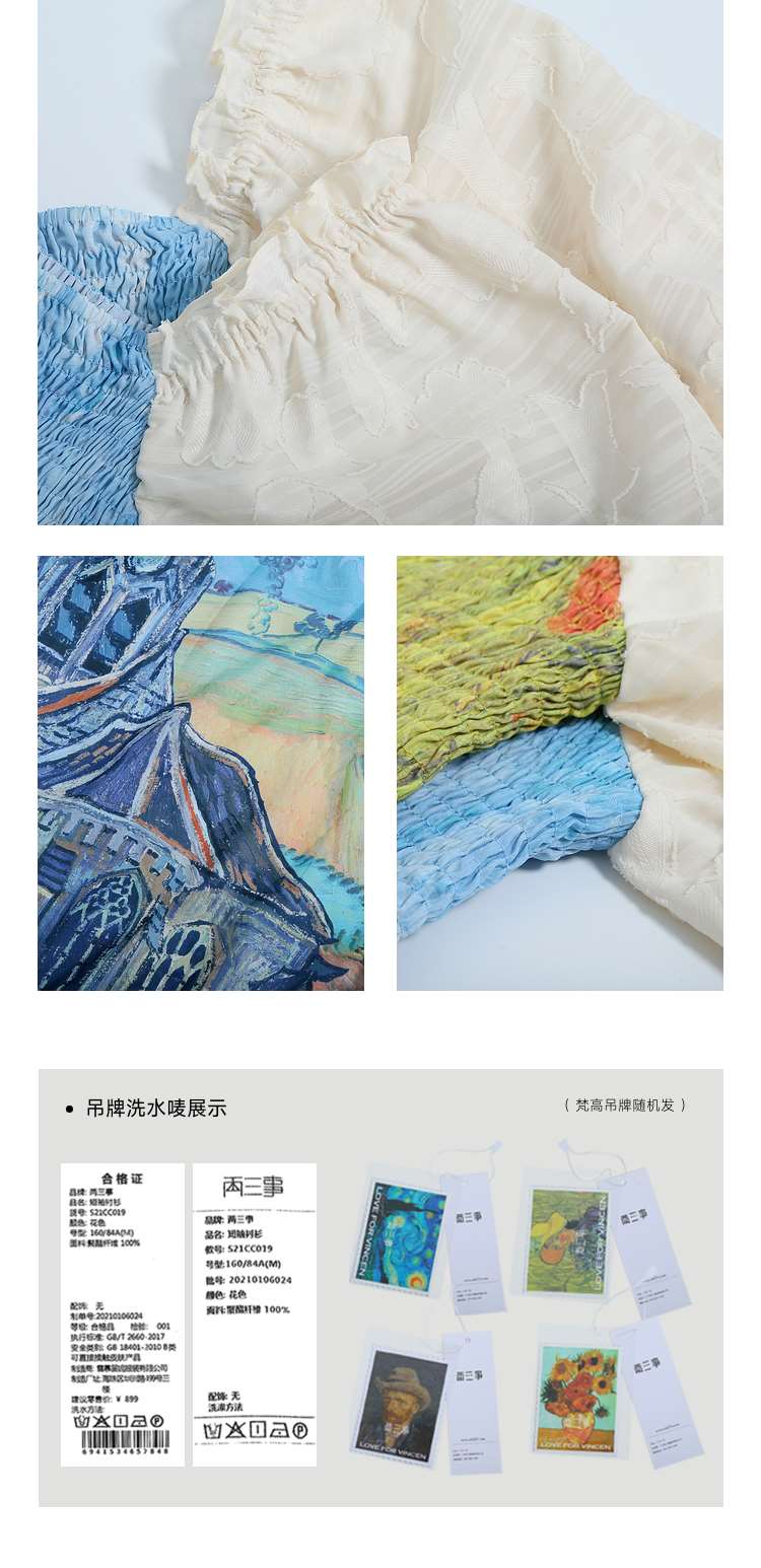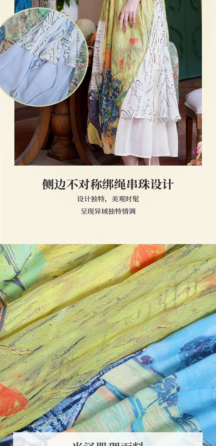 两三事梵高艺术荷以清凉夏季田园风泡泡袖印花绑带连衣裙