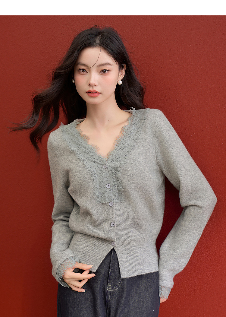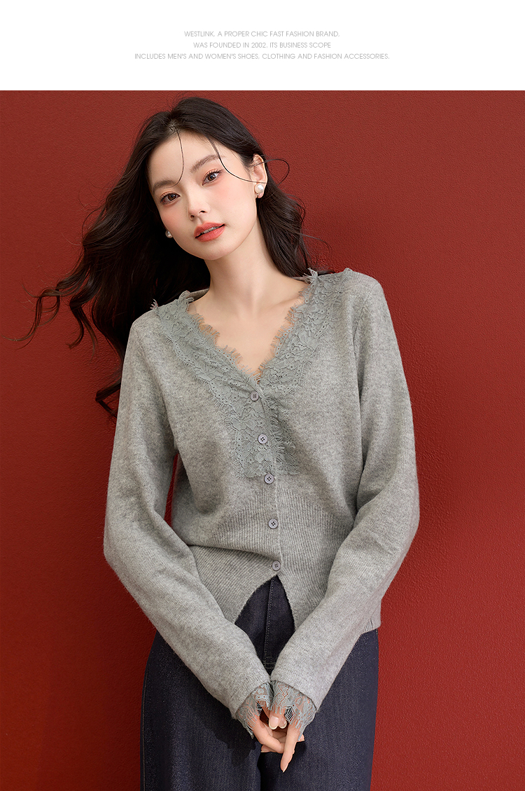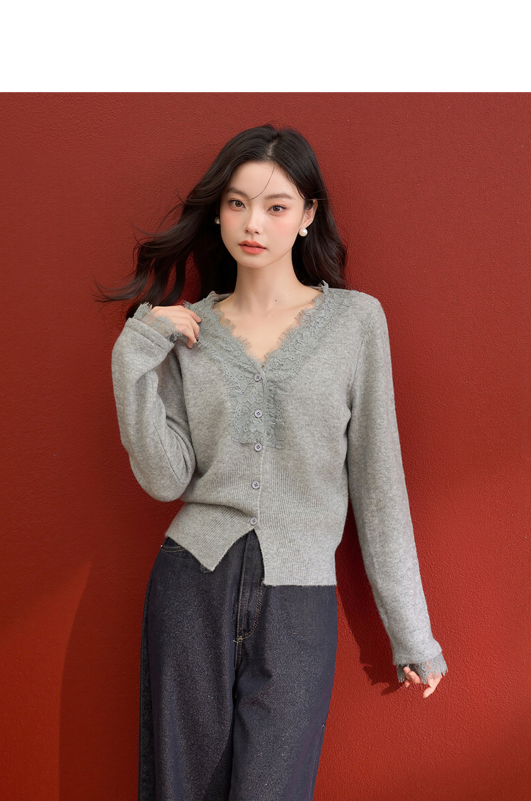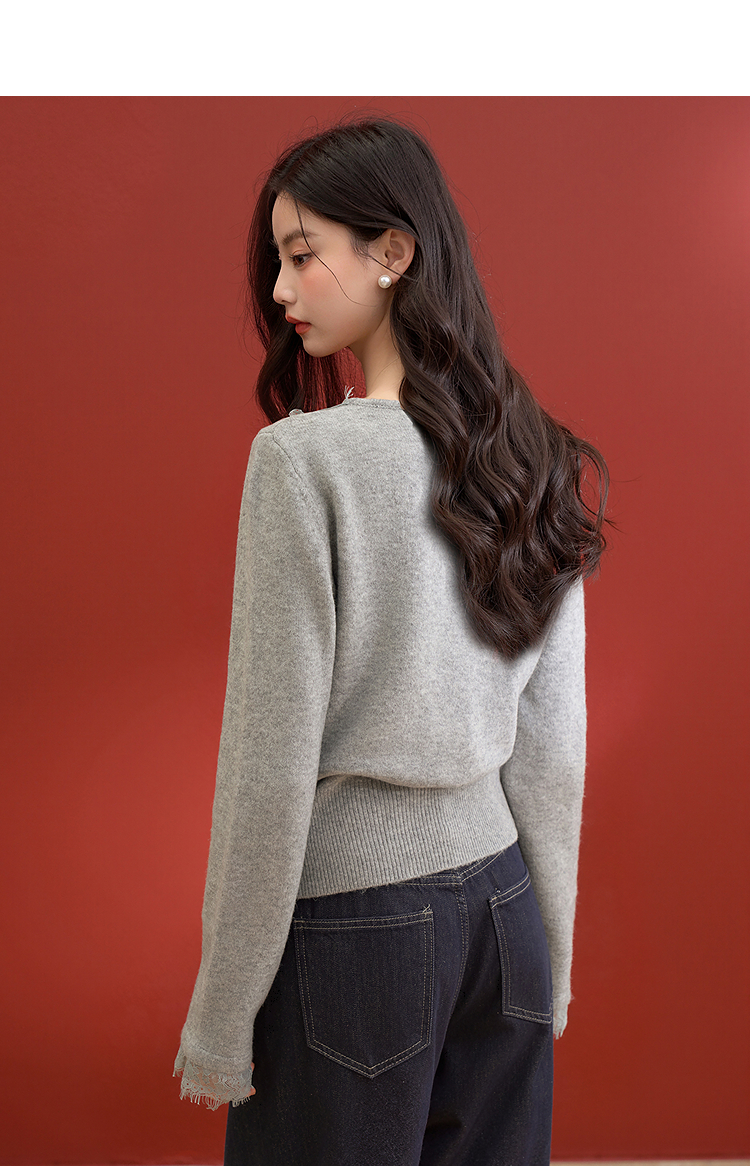 西遇韩系针织开衫女秋季新款法式温柔V领蕾丝短款毛衣外套SS051620