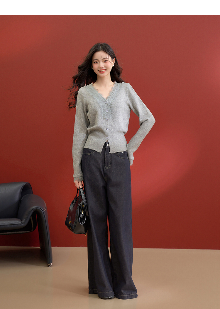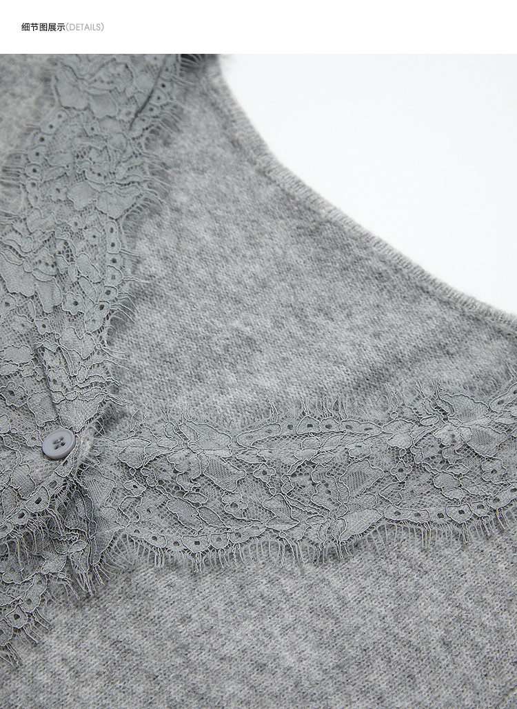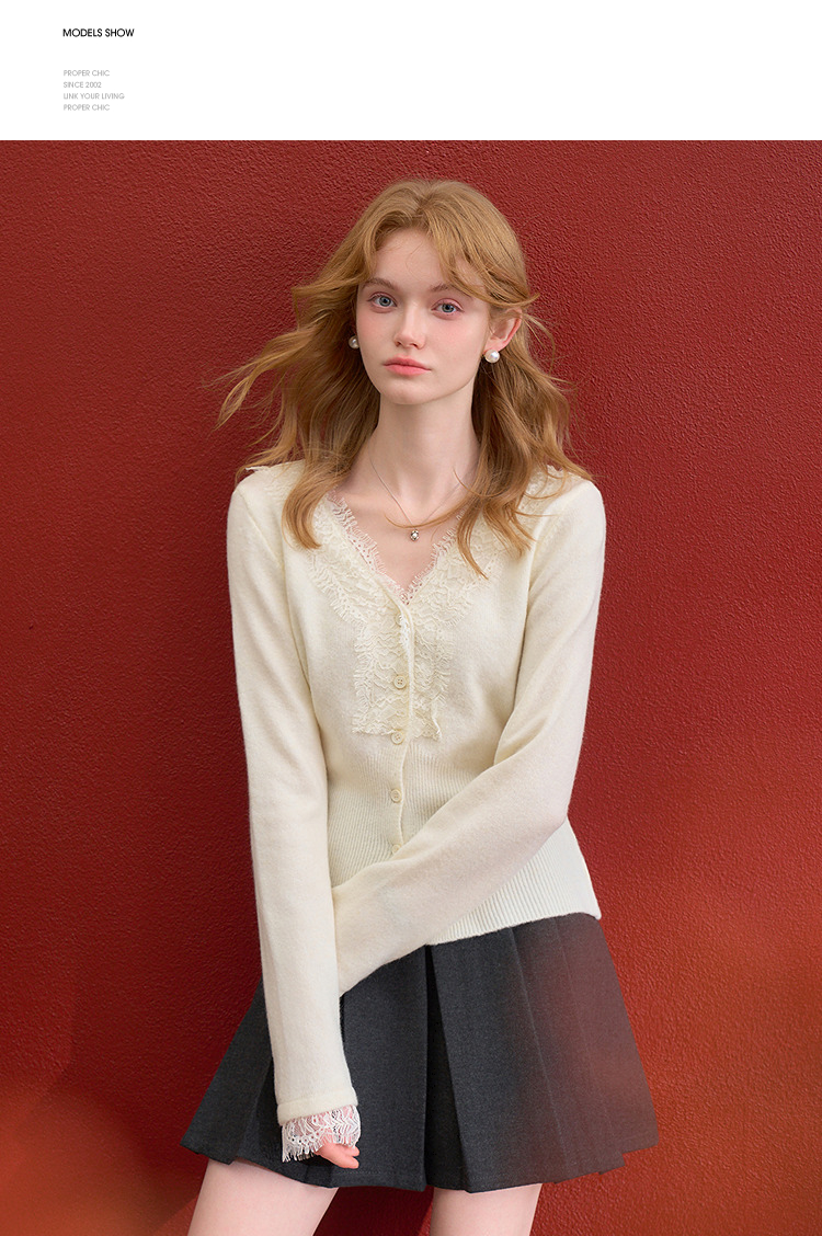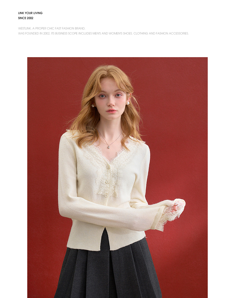 西遇韩系针织开衫女秋季新款法式温柔V领蕾丝短款毛衣外套SS051620