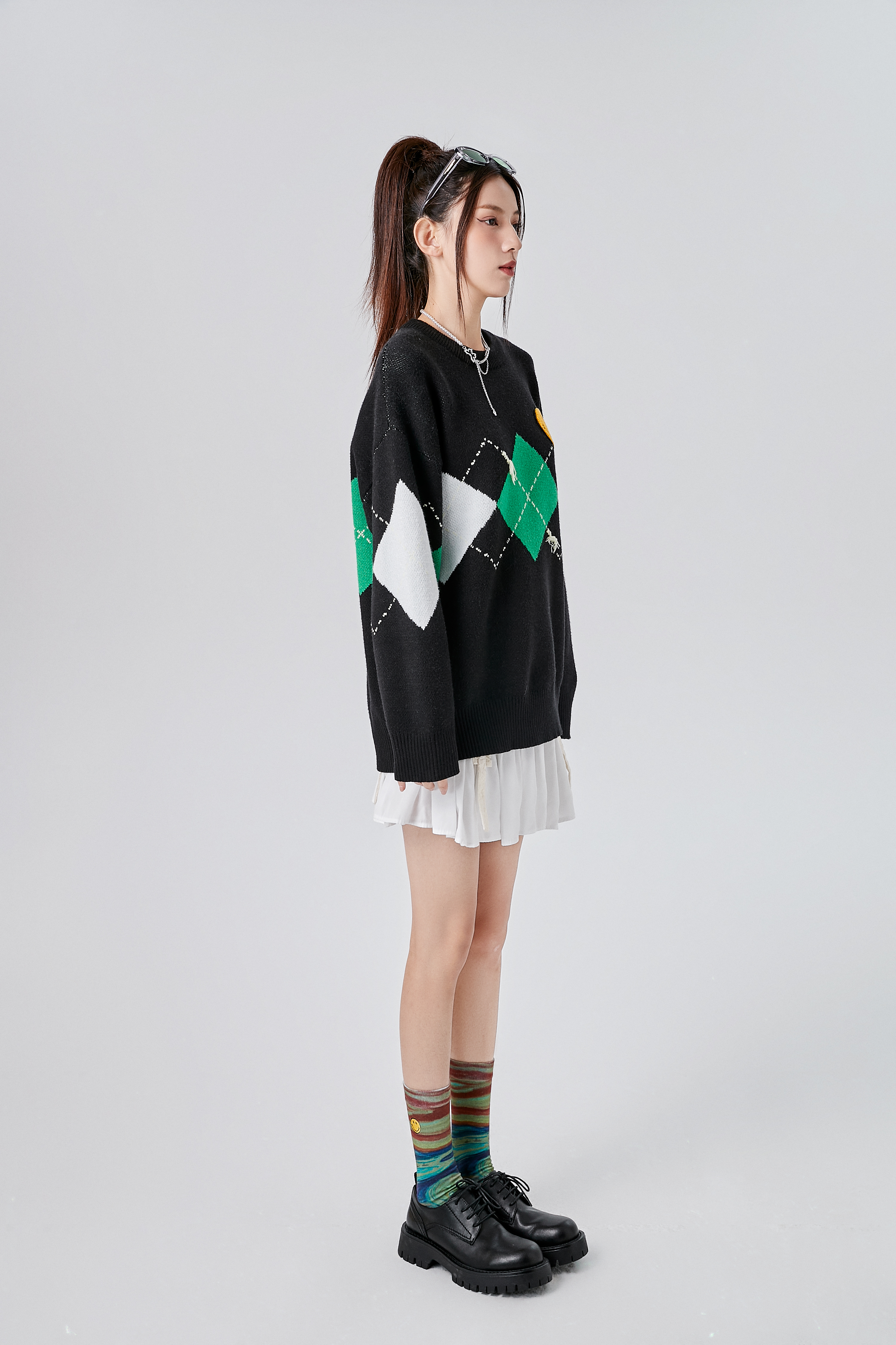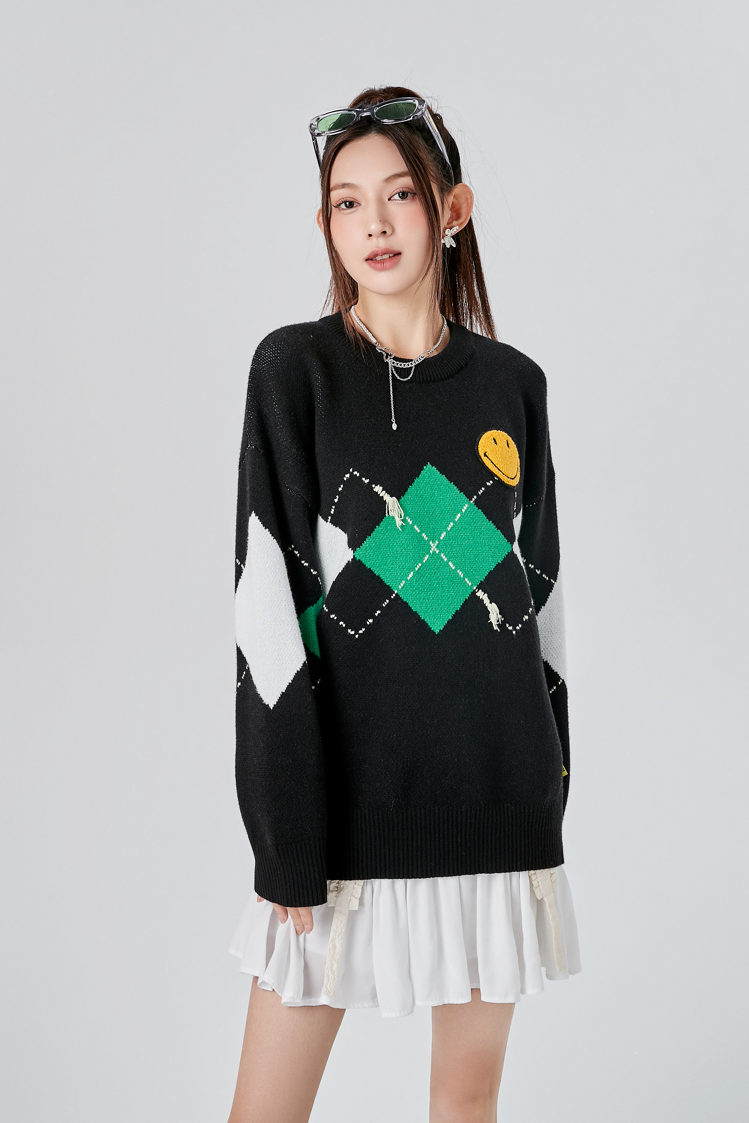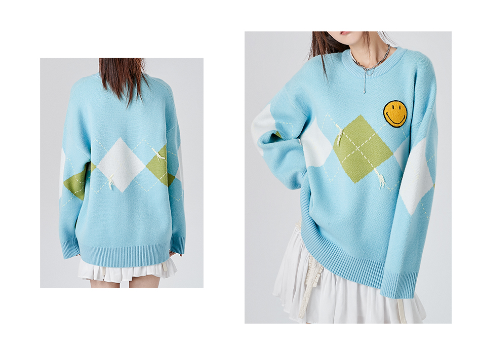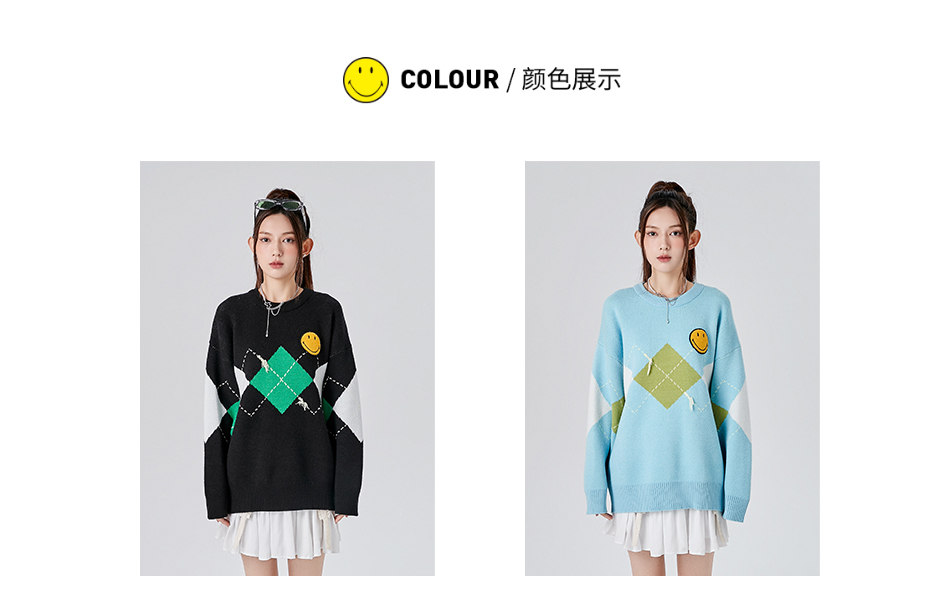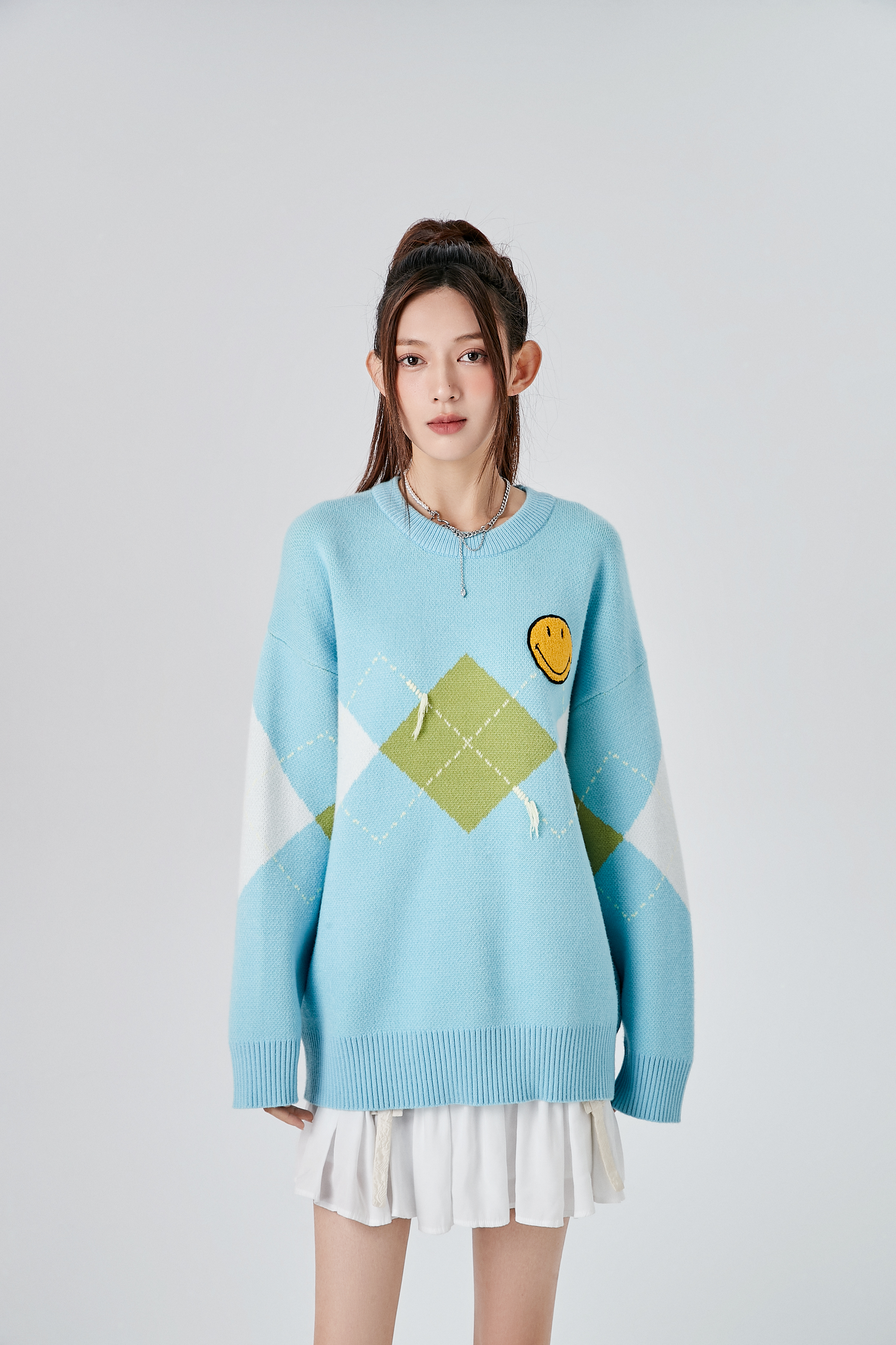 【品名】:经典笑脸毛巾绣菱形提花圆领毛衣