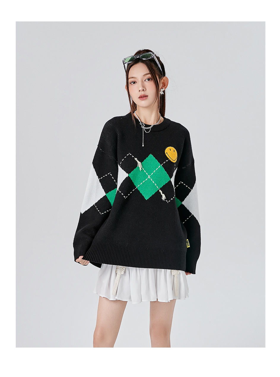 [韩国潮牌] SMILEY 正品微笑秋冬新品经典笑脸毛巾绣菱形提花圆领毛衣518