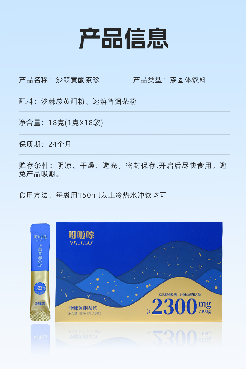 【呀啦嗦-上饮 沙棘黄酮茶珍】沙棘黄酮茶珍是将沙棘叶提取物在浸提阶段采用了萃取液逆向流动的特殊工艺,使得萃取效率大大提升,有效成分溶出率相比普通的泡茶煮茶等浸出率更高!!!相较于直接饮用沙棘芽茶,沙棘黄酮茶珍因提取及浓缩等工艺,能获得分子量更小,含量更高的活性成分。