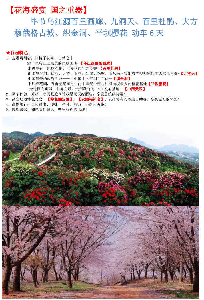 花海盛宴 国之重器】 毕节乌江源百里画廊、九洞天、百里杜鹃、大方穆俄格古城、织金洞、平坝樱花 动车6天