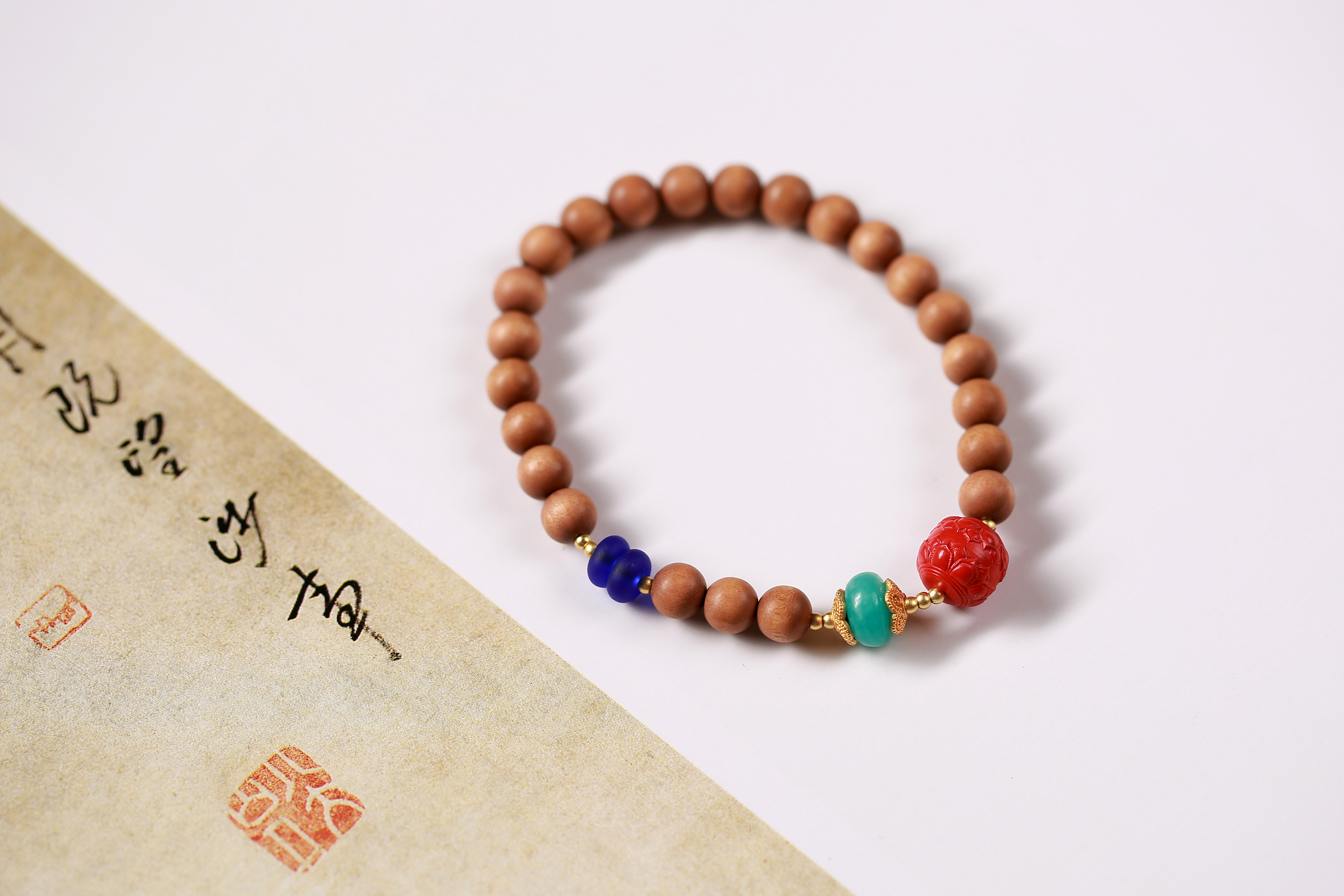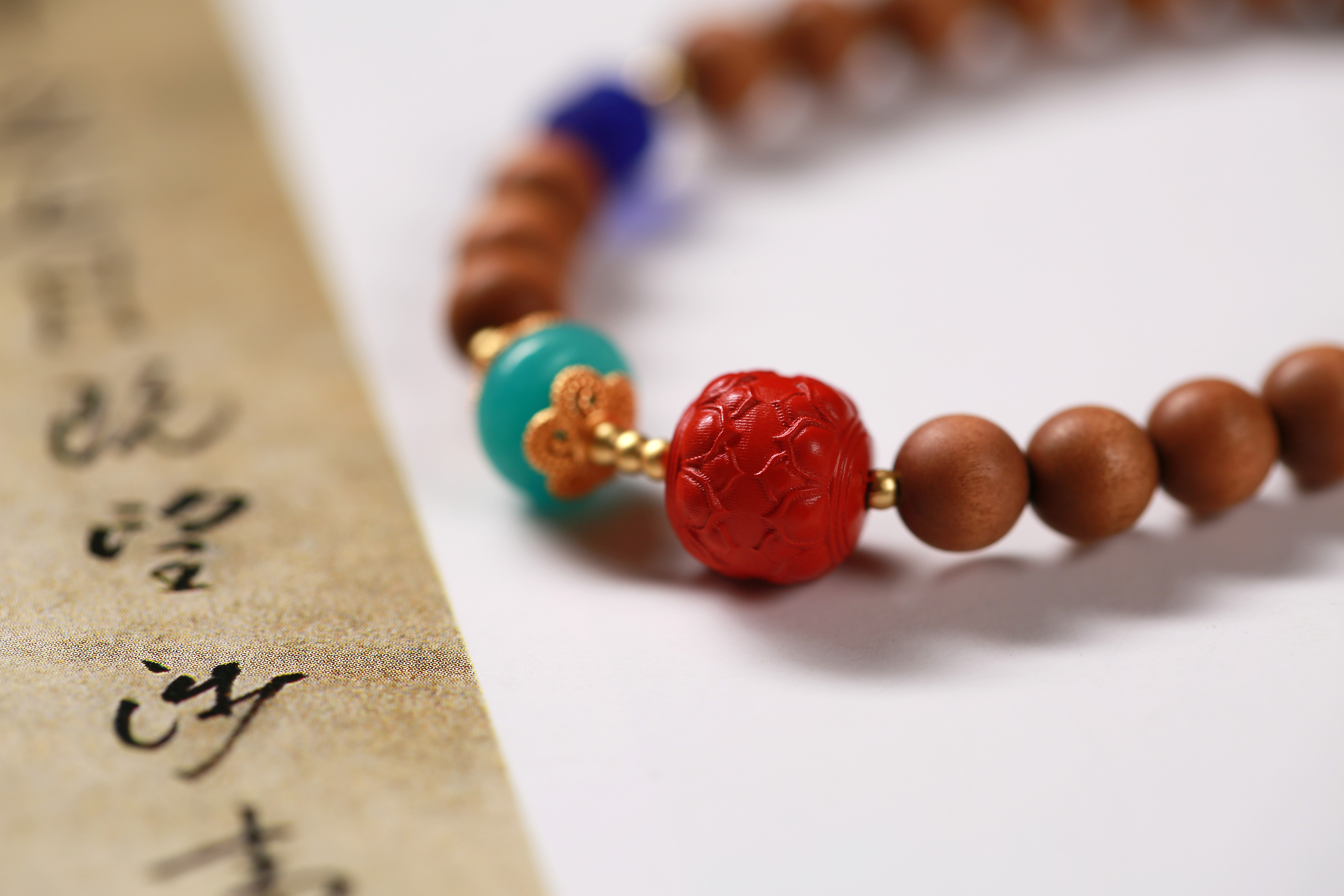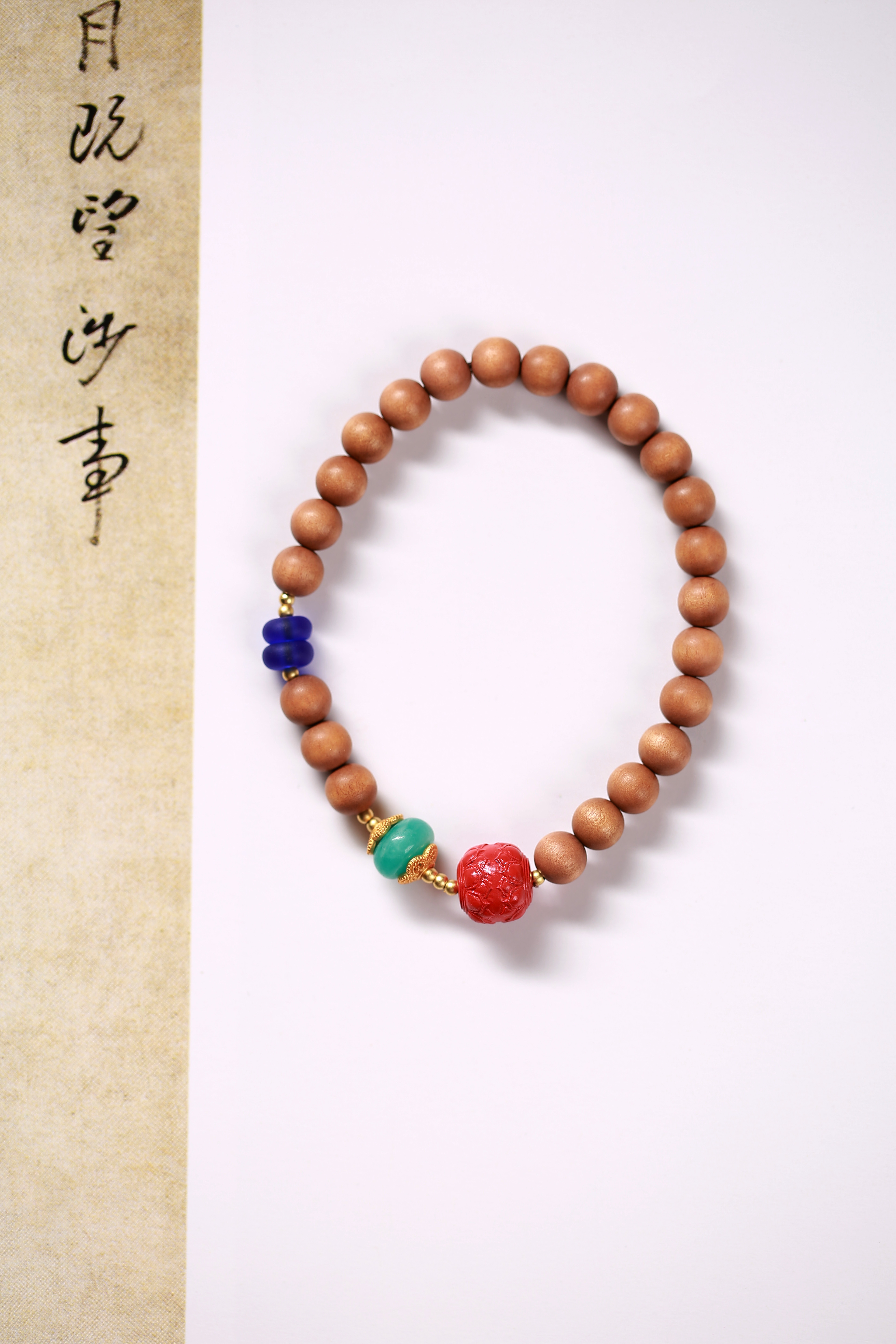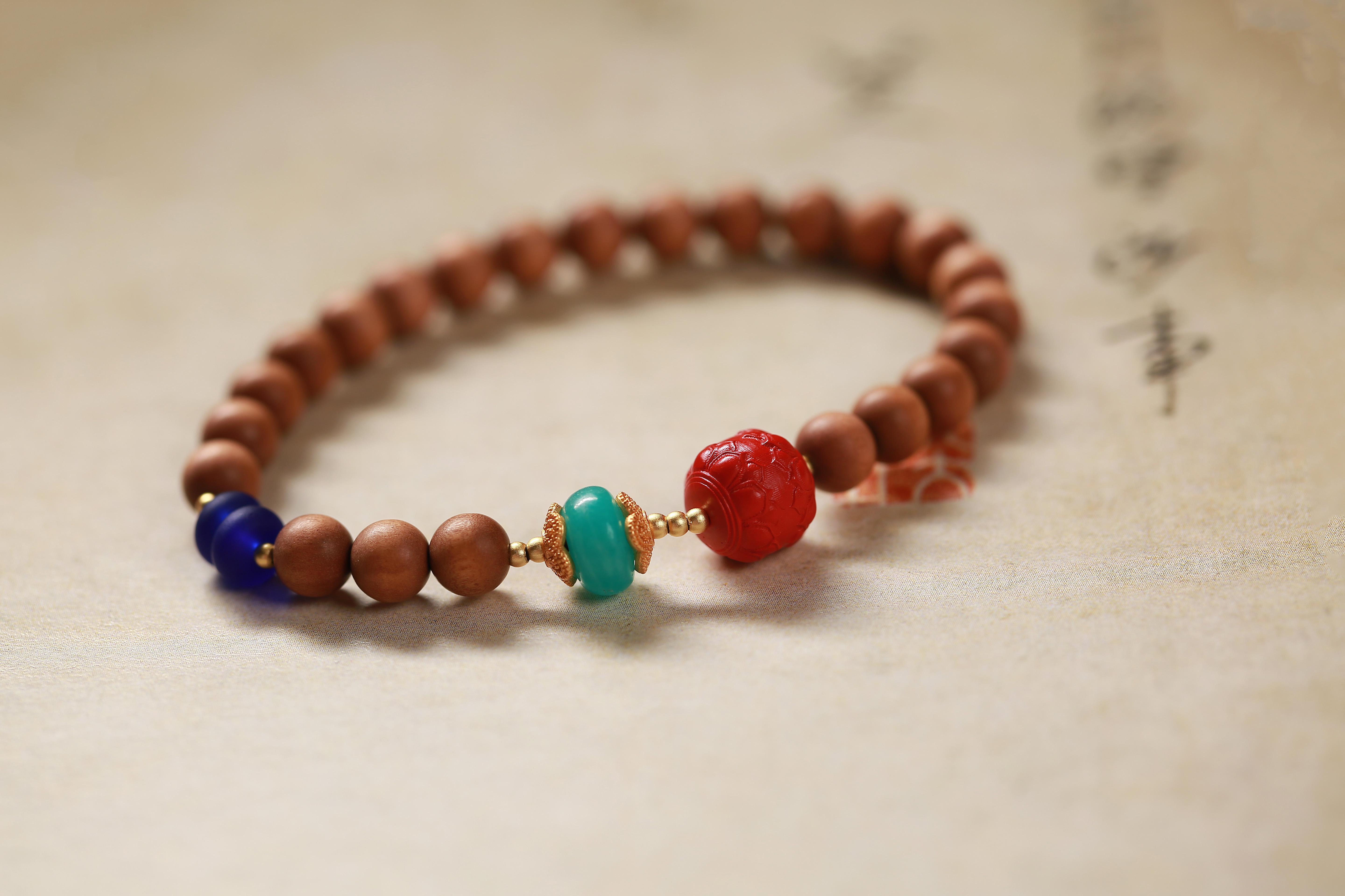 配件:朱砂莲花鼓珠/铜珠/天河石隔片/银镀24K小号花托/琉璃隔片蓝