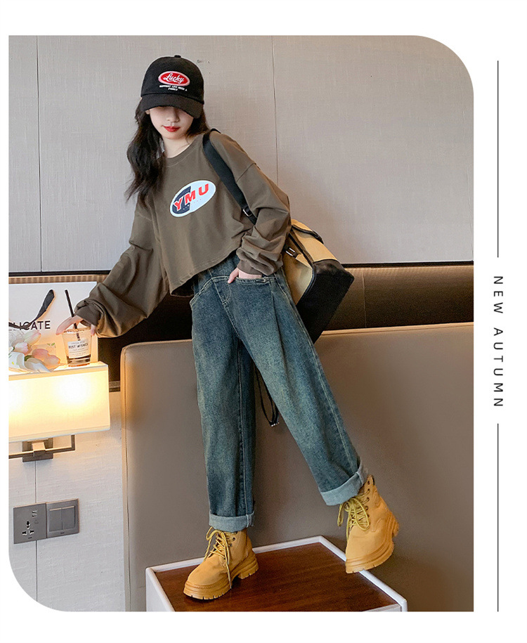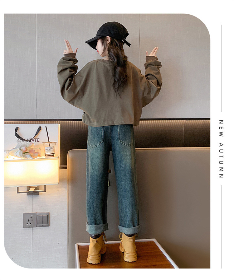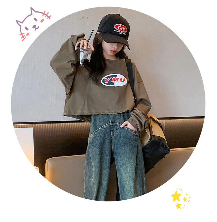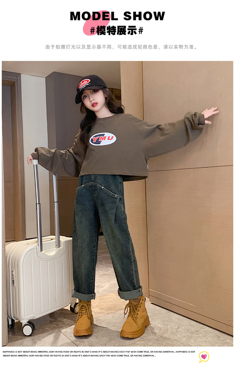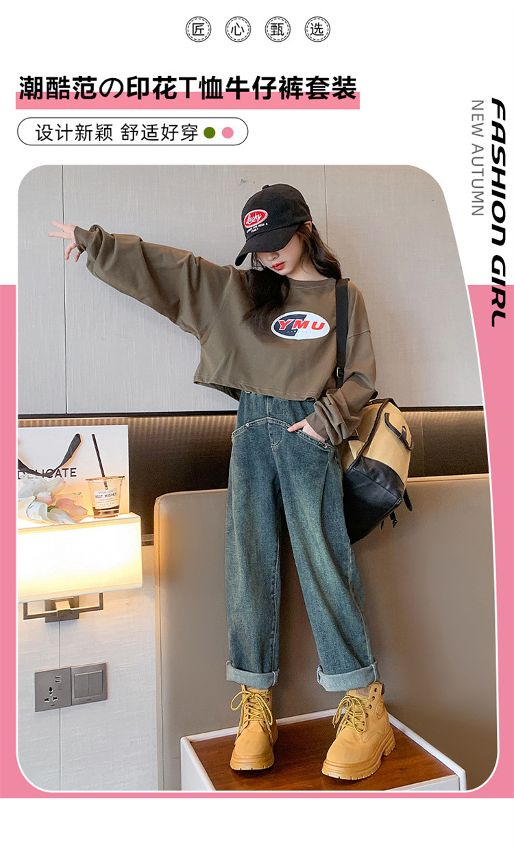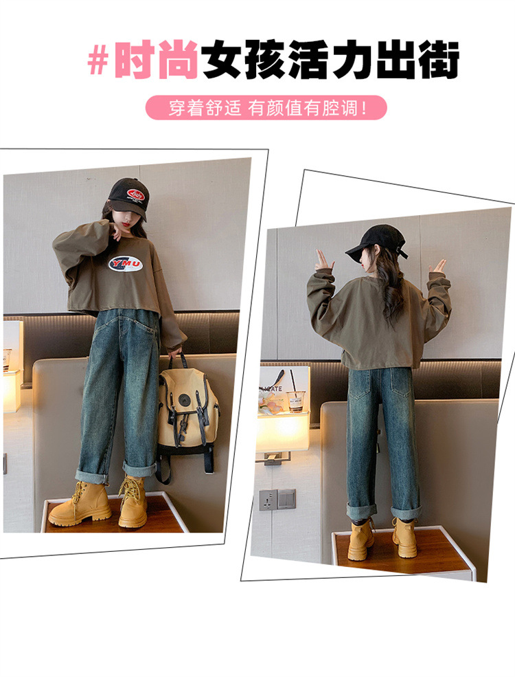 【新款套装,舒适时尚又百搭!】女童时髦洋气秋装短上衣牛仔裤两件套2023新款大童儿童韩范潮套装lmsh