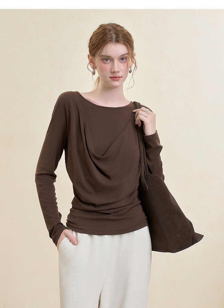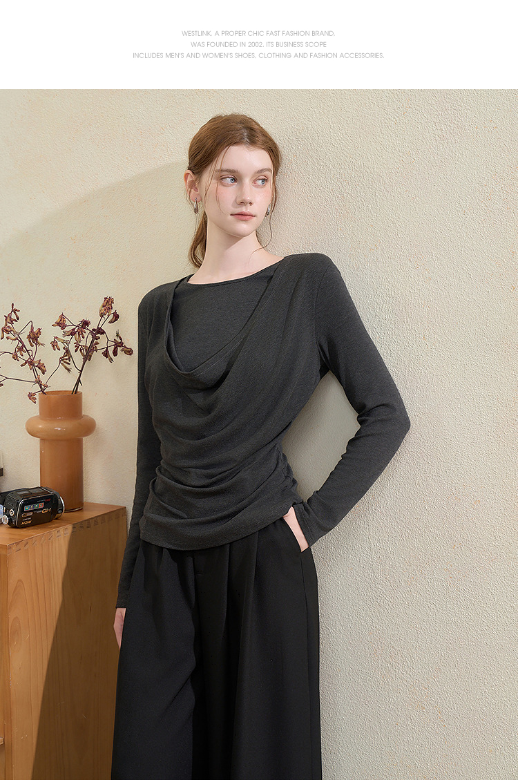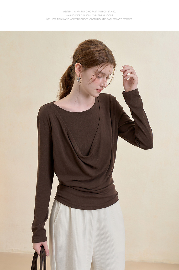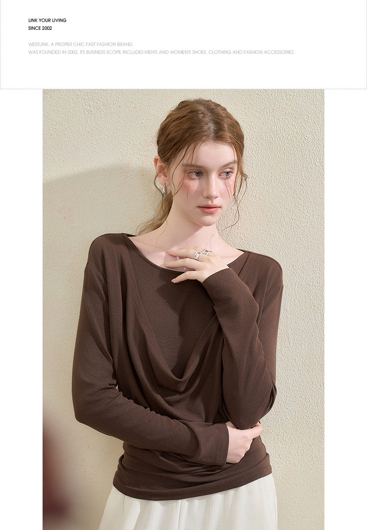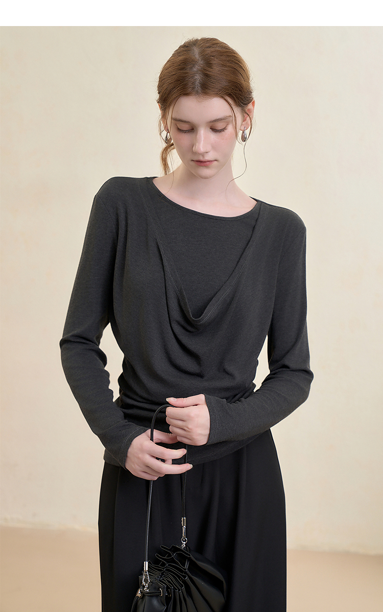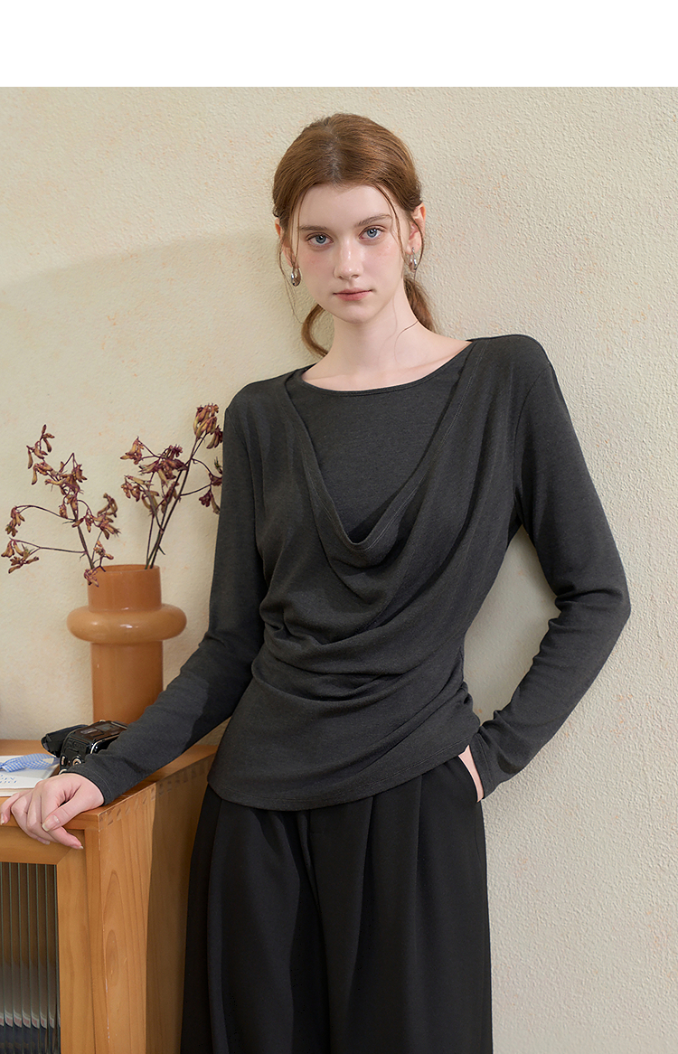 西遇假两件荡领长袖T恤女秋季设计感收腰显瘦内搭打底衫上衣V3455245