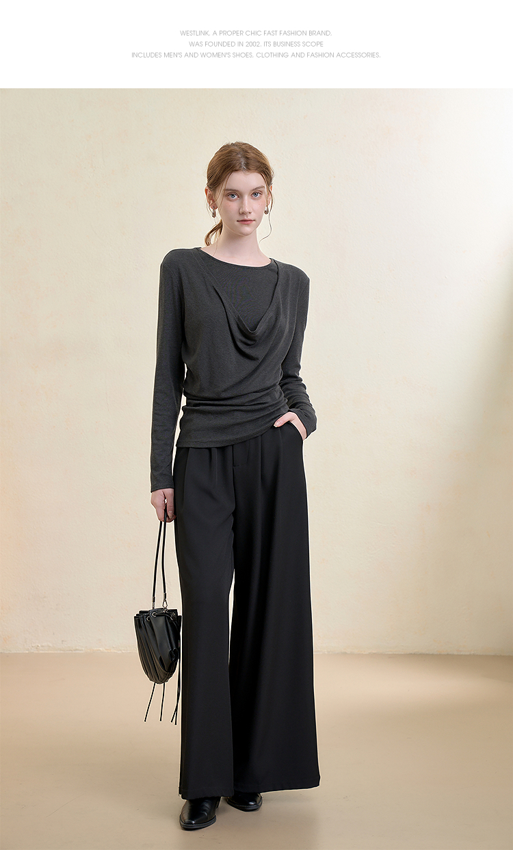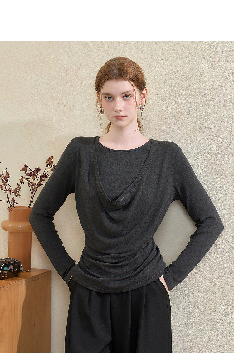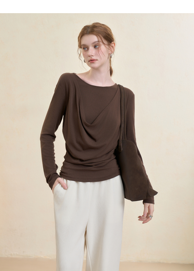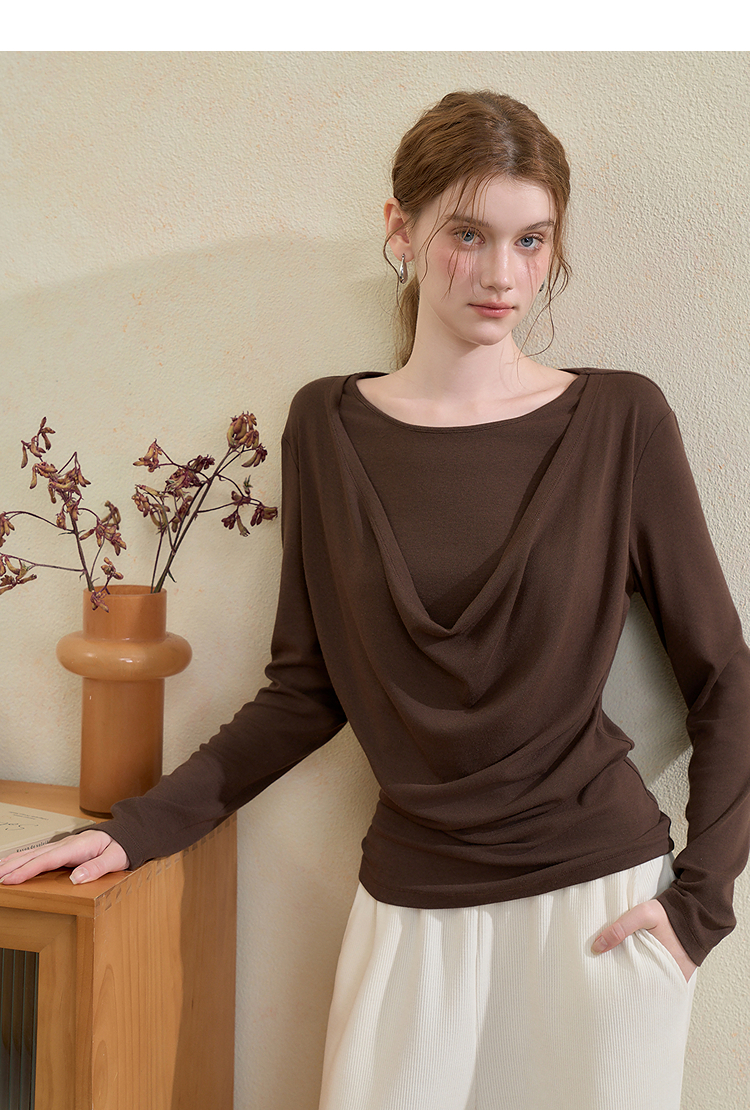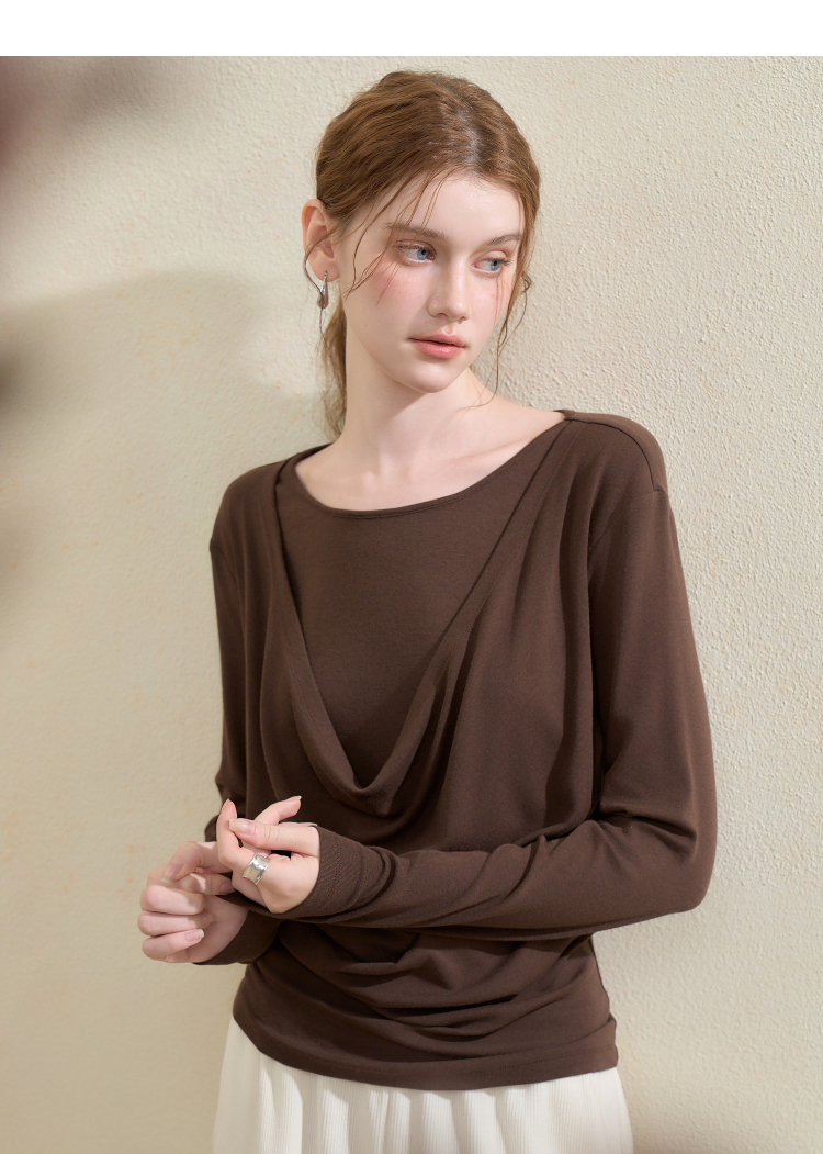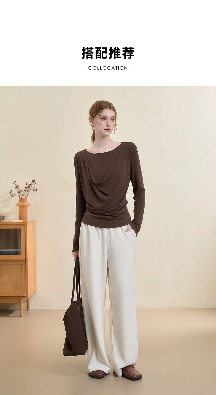 西遇假两件荡领长袖T恤女秋季设计感收腰显瘦内搭打底衫上衣V3455245