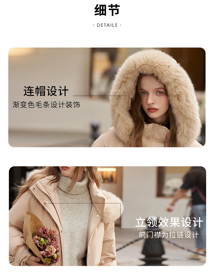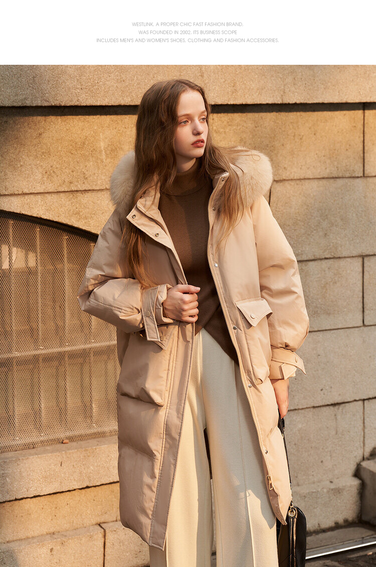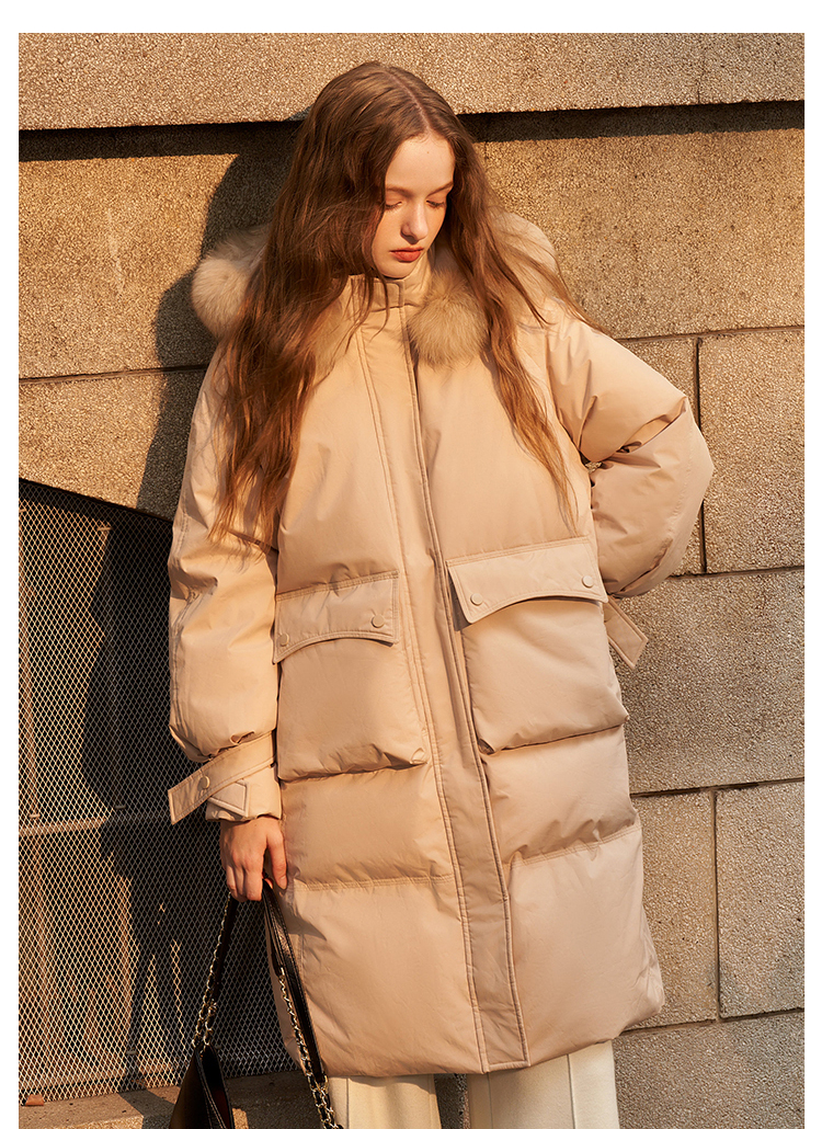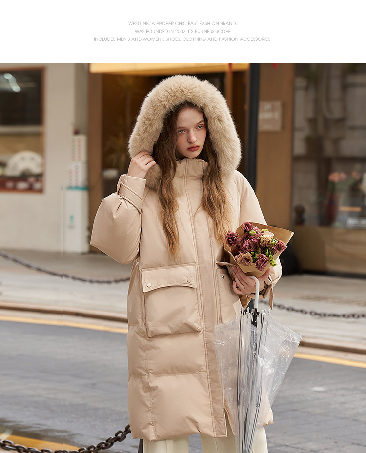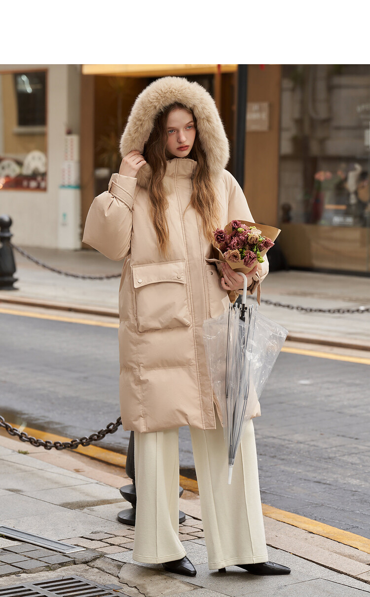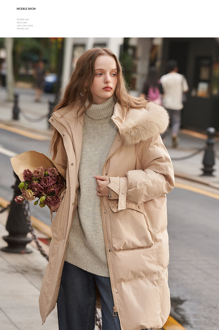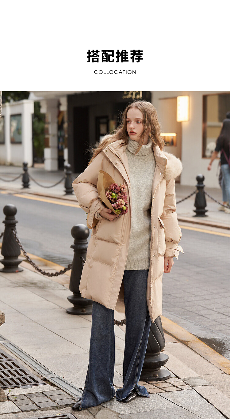 毛领连帽落肩宽松长款羽绒服女秋冬新款简约加绒保暖外套V2538497
