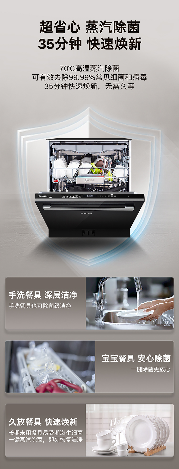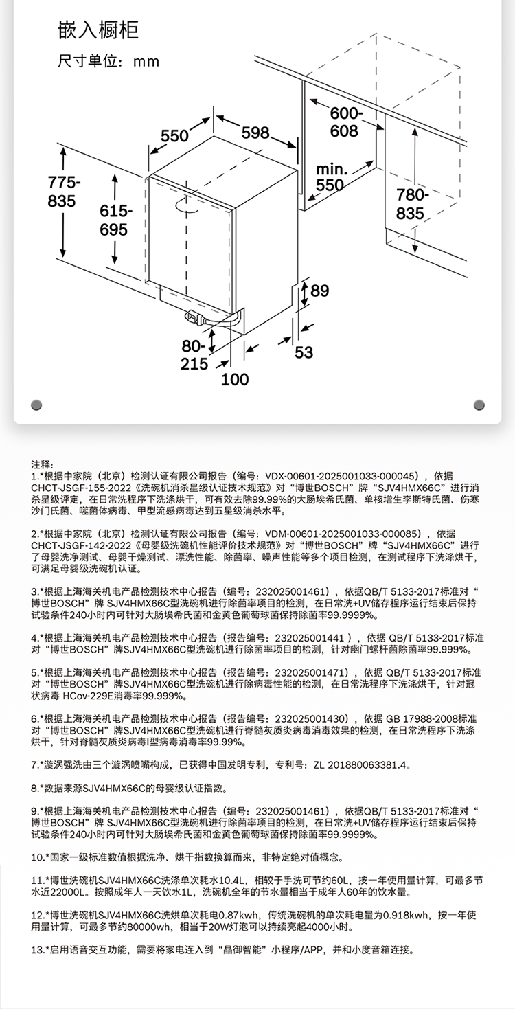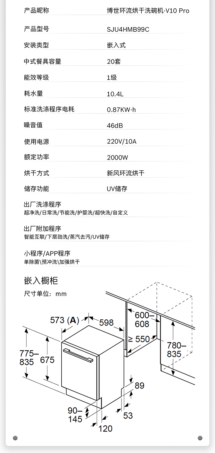 博世(BOSCH)20套V10Pro全嵌入式除菌洗碗机240H存储 新风环流烘干SJV4HMX66C 可定制面板