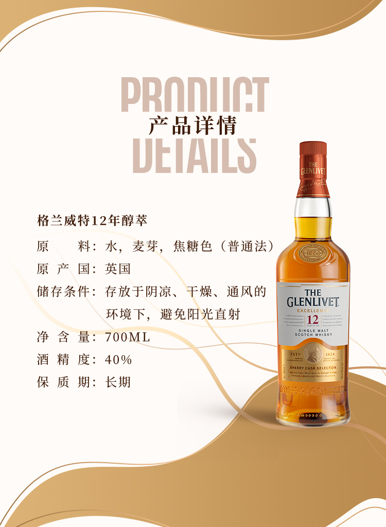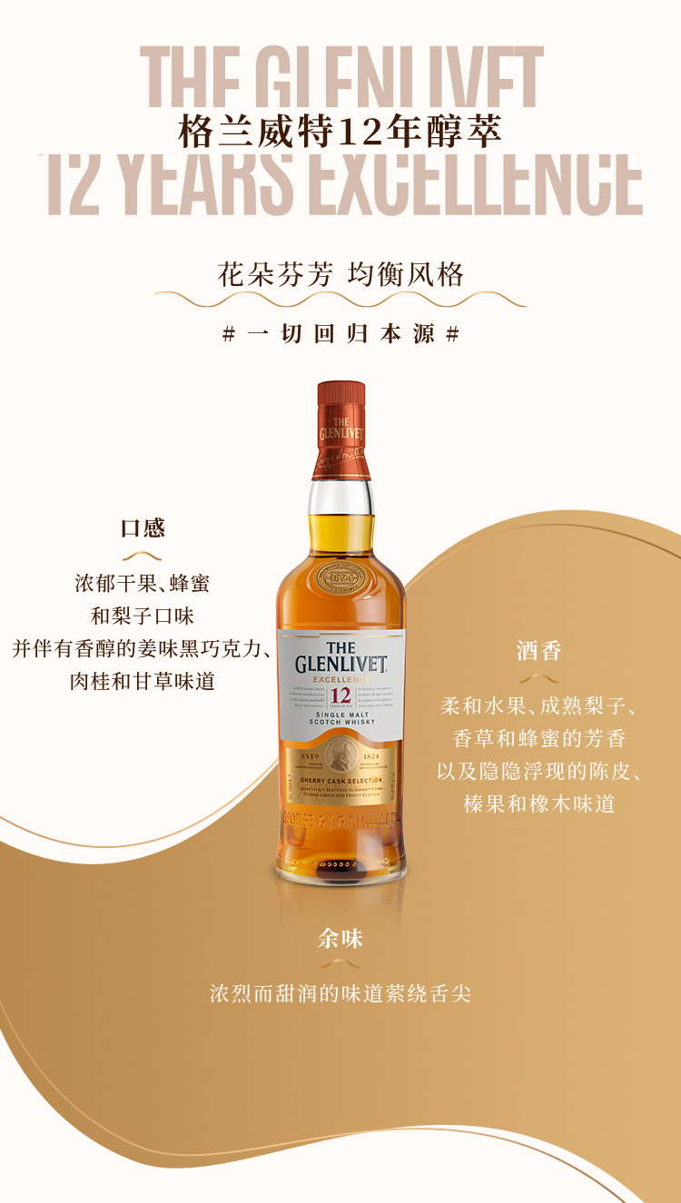 格兰威特(ThE GLENLIVET)12年 醇萃 苏格兰 单一麦芽威士忌 洋酒 700ml 雪莉桶