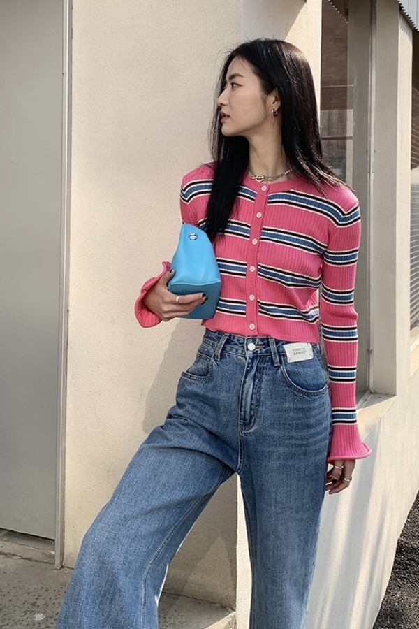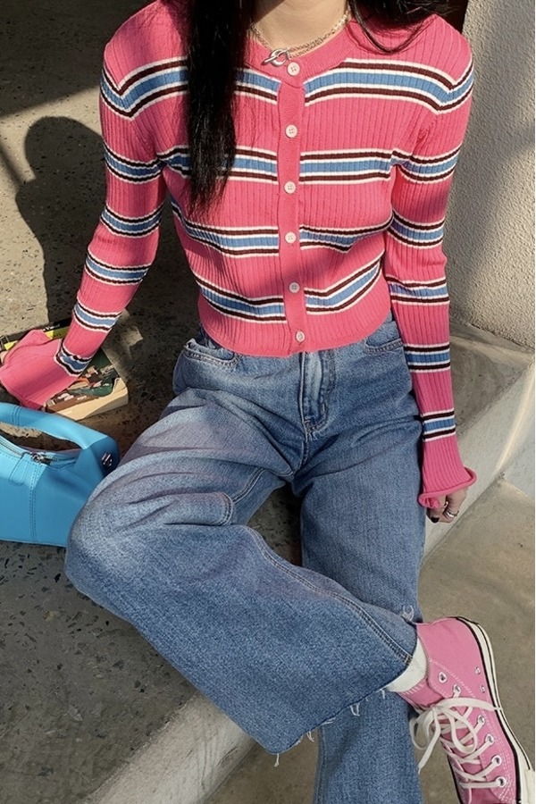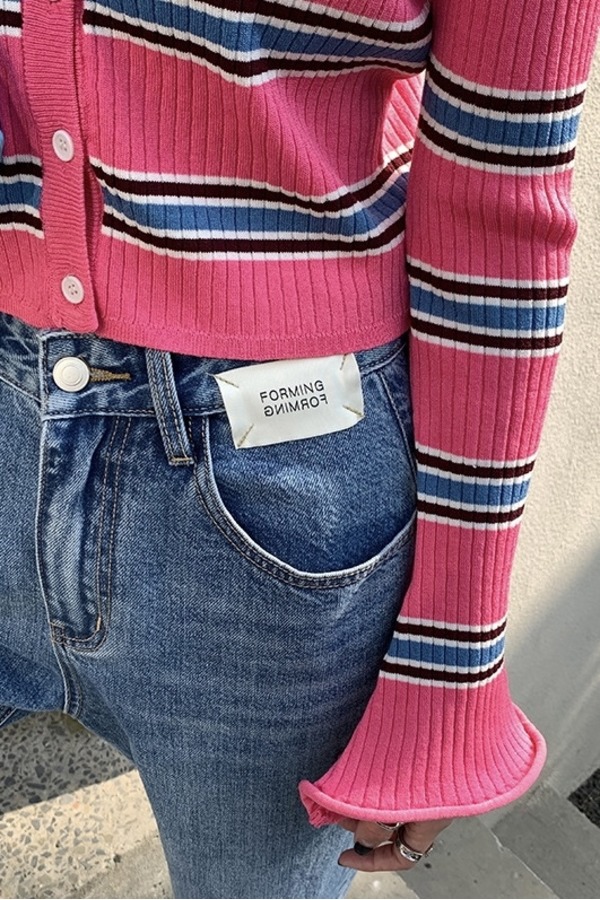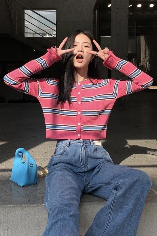 LNNNS 条纹撞色喇叭袖针织开衫 15817