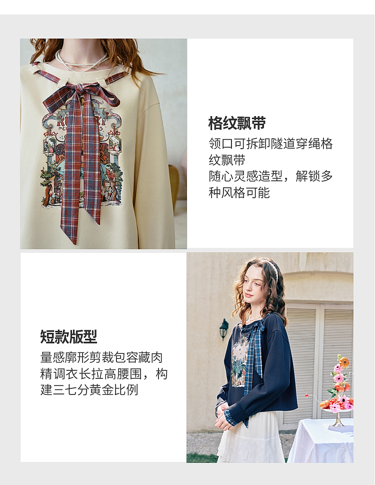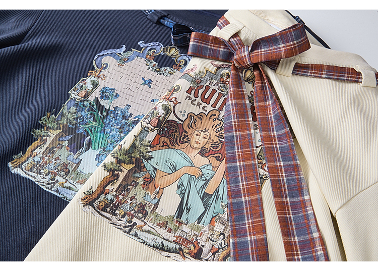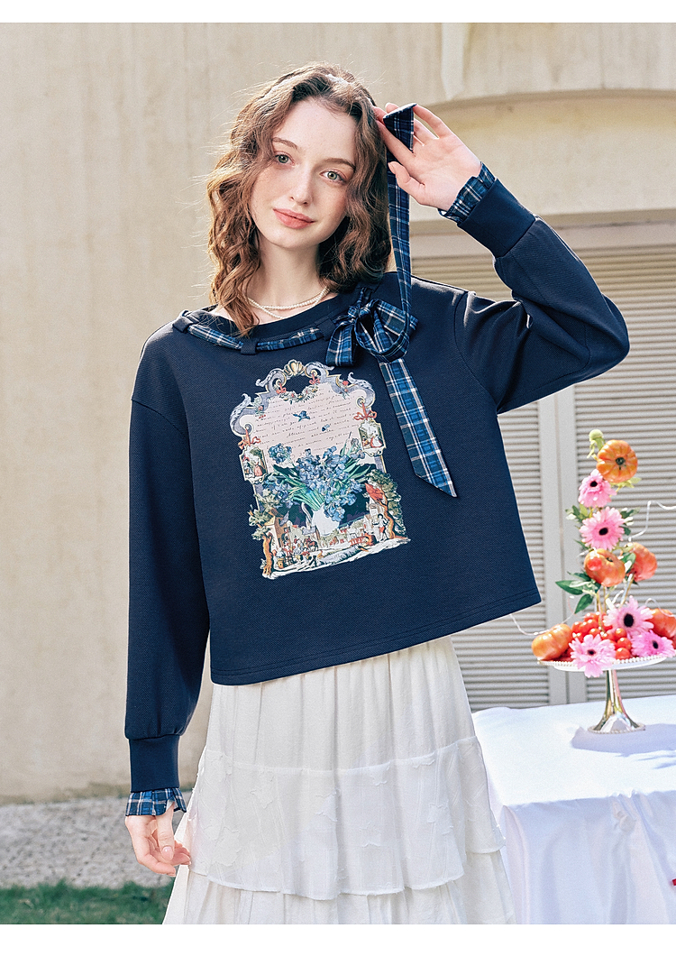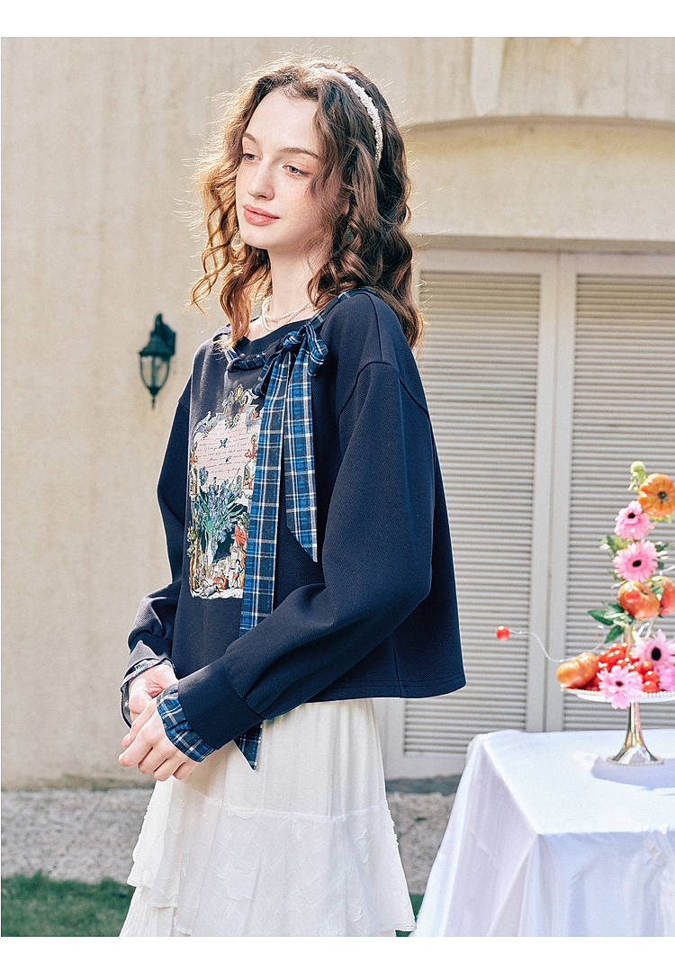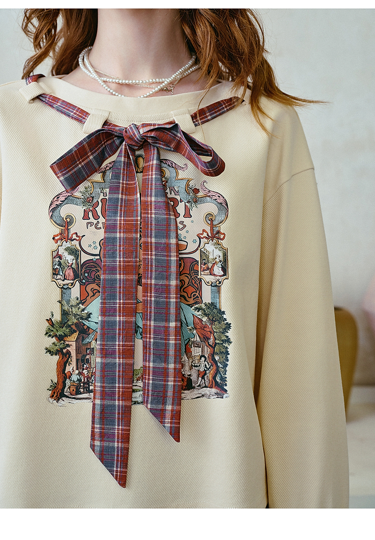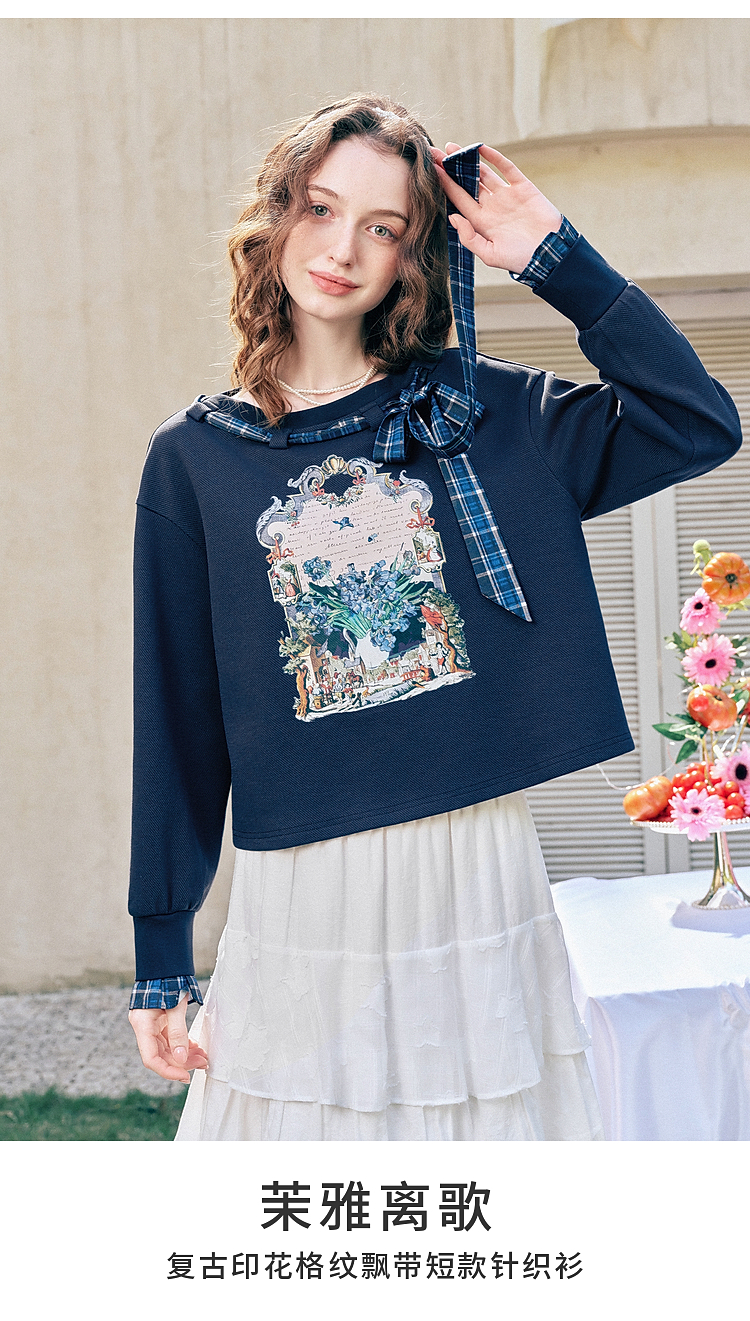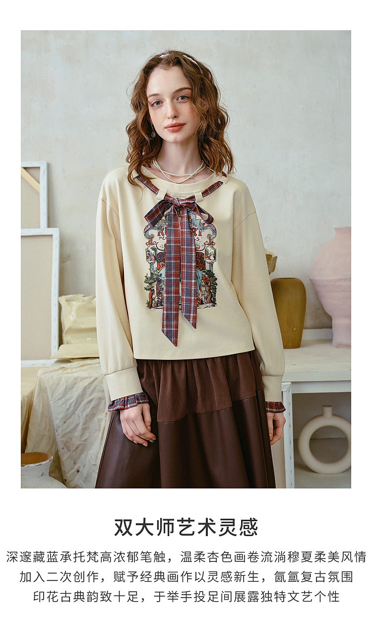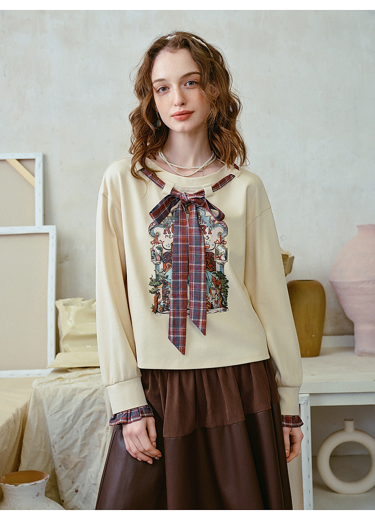 两三事梵高文艺 茉雅离歌 2026春季新款复古印花格子蝴蝶结t恤女