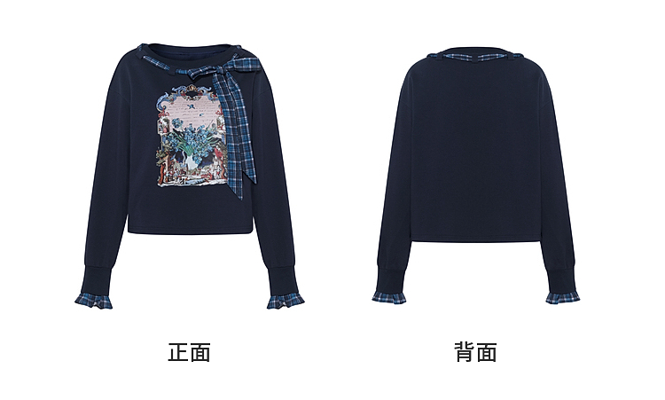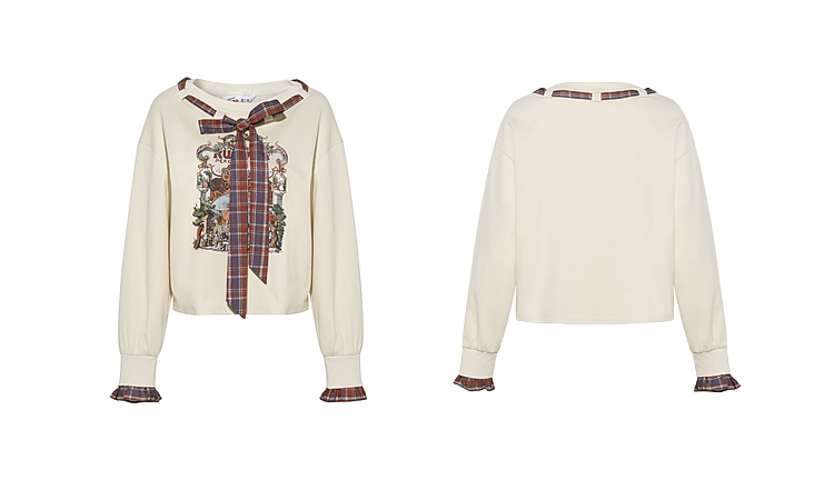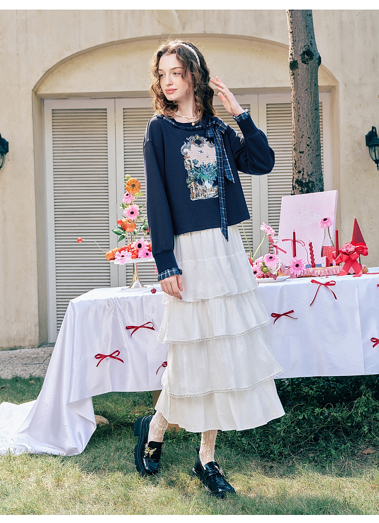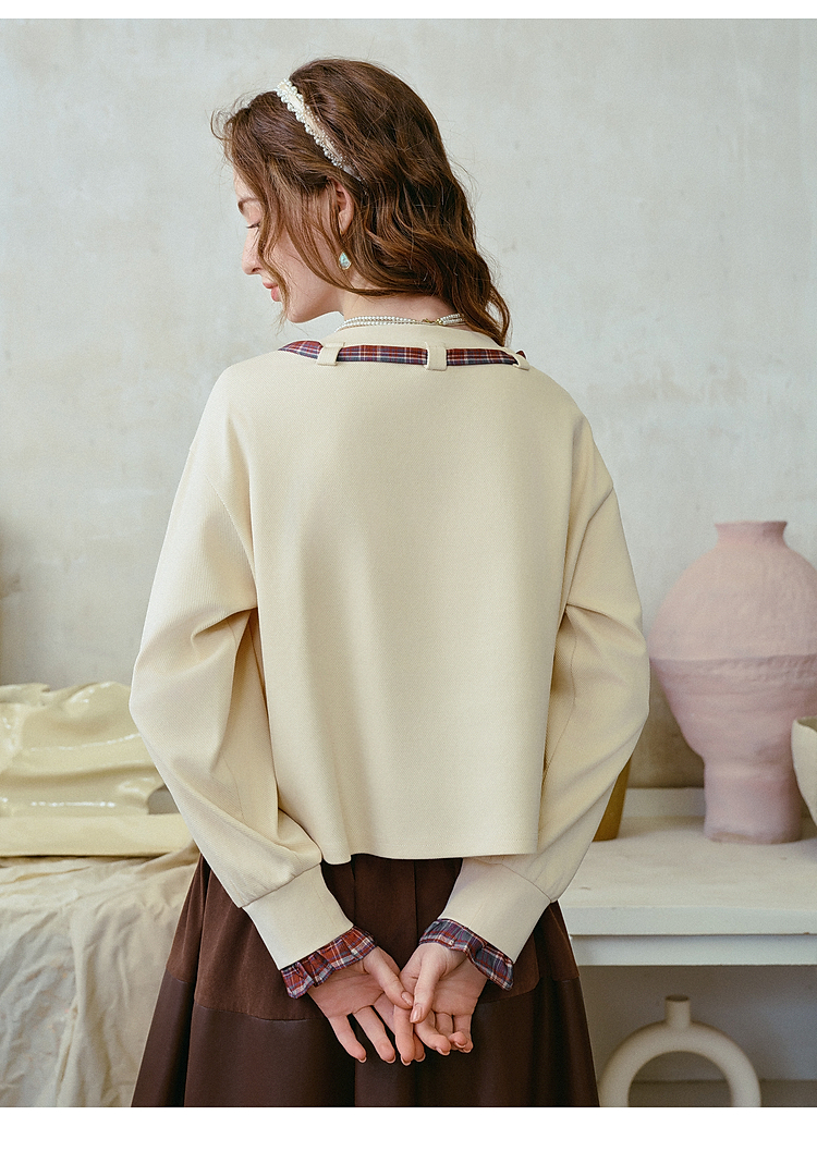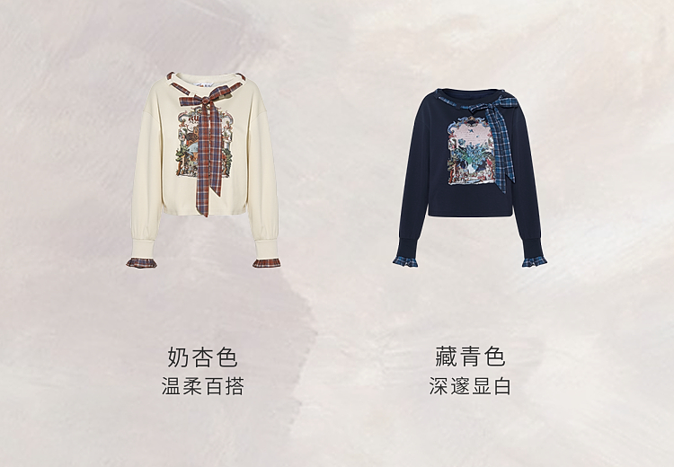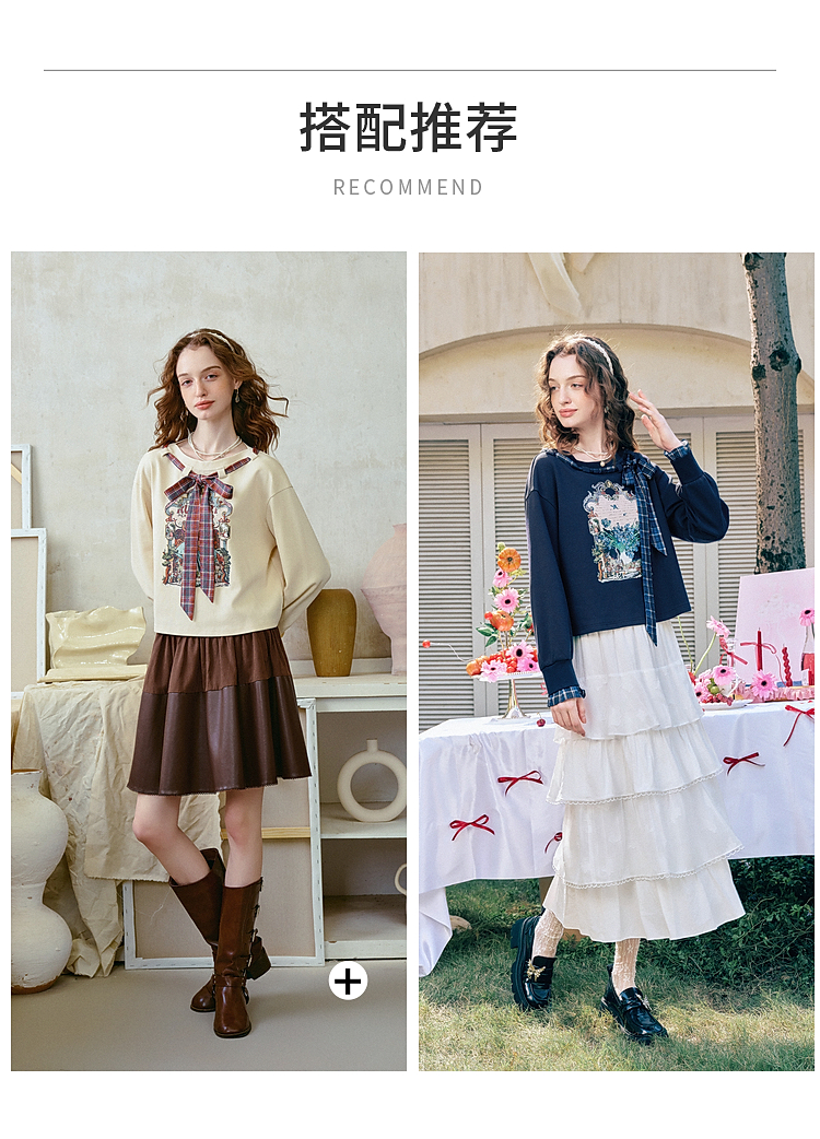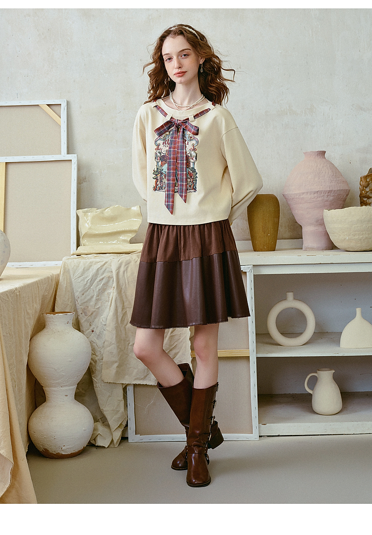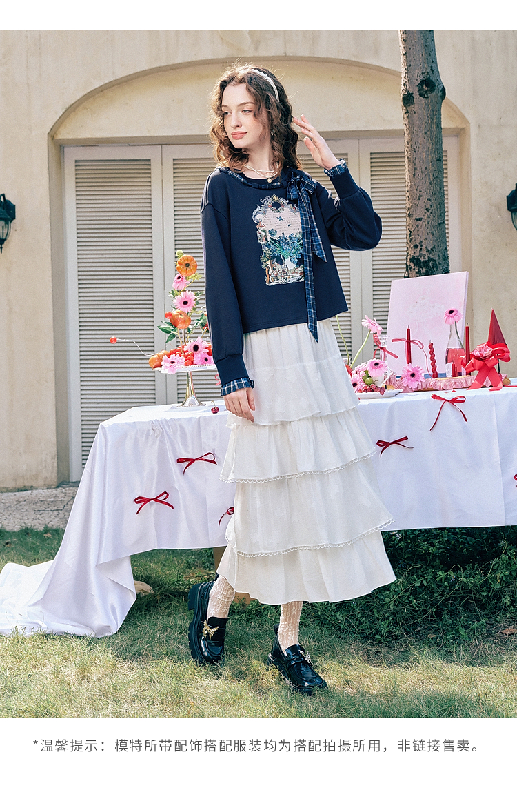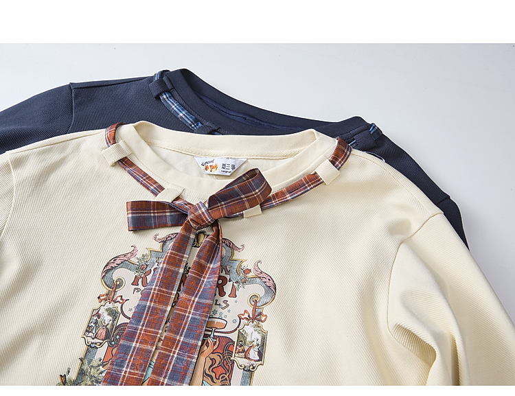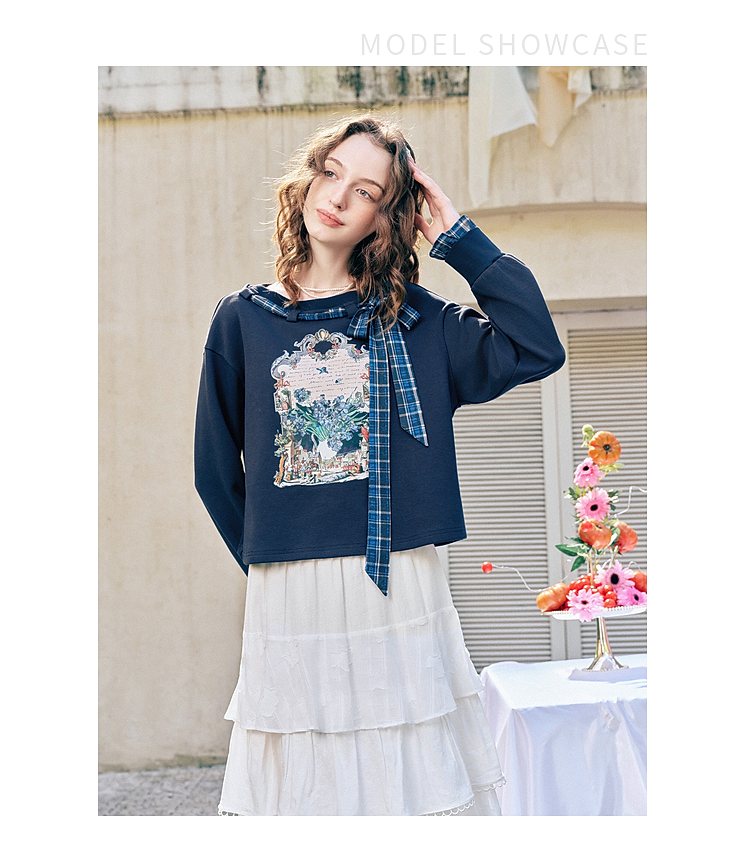 两三事梵高文艺 茉雅离歌 2026春季新款复古印花格子蝴蝶结t恤女