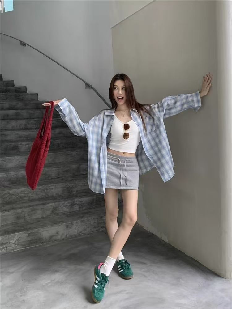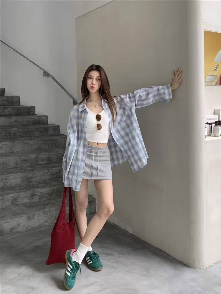 新品上市蓝白格子衬衫设计感宽松休闲春秋polo领上衣外套女韩系小红书同款