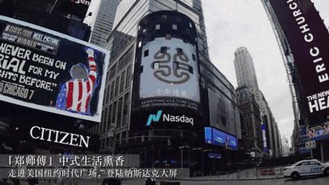 2021年4月,大师兄家的郑师傅品牌就已亮相这块“屏幕”上,并将中国非遗香文化抛向世界舞台,与大洋彼岸的人们共享生活的芬芳。