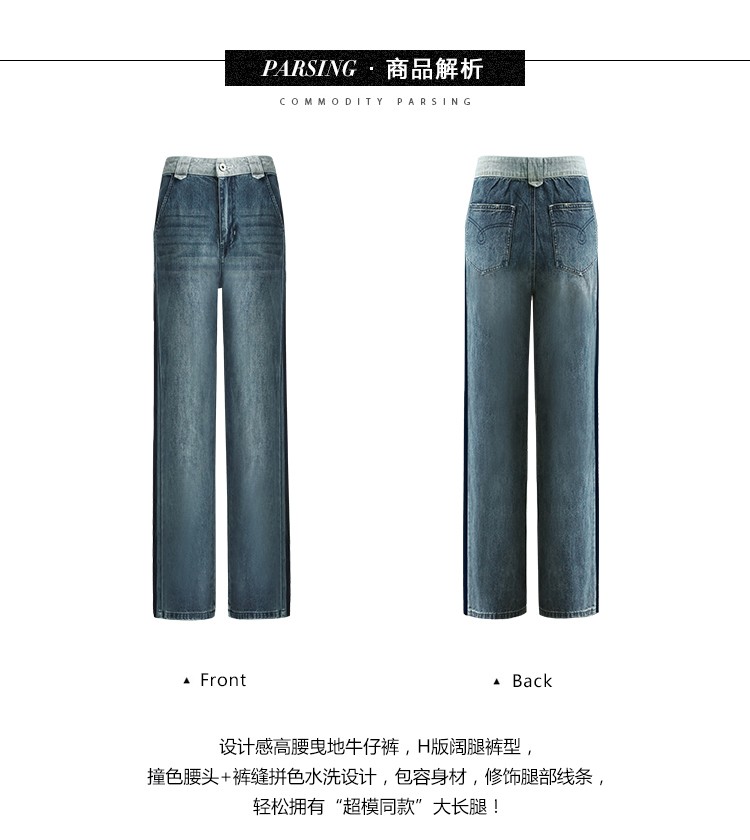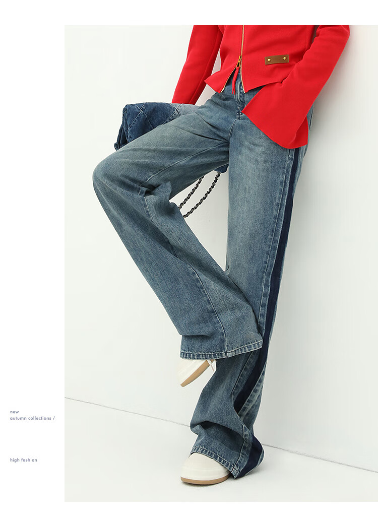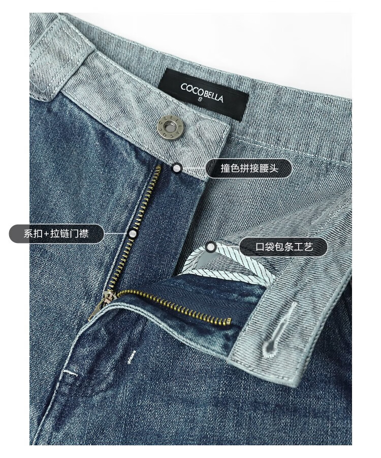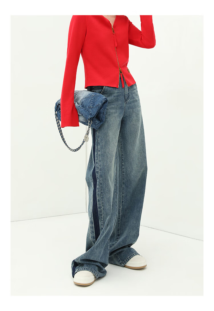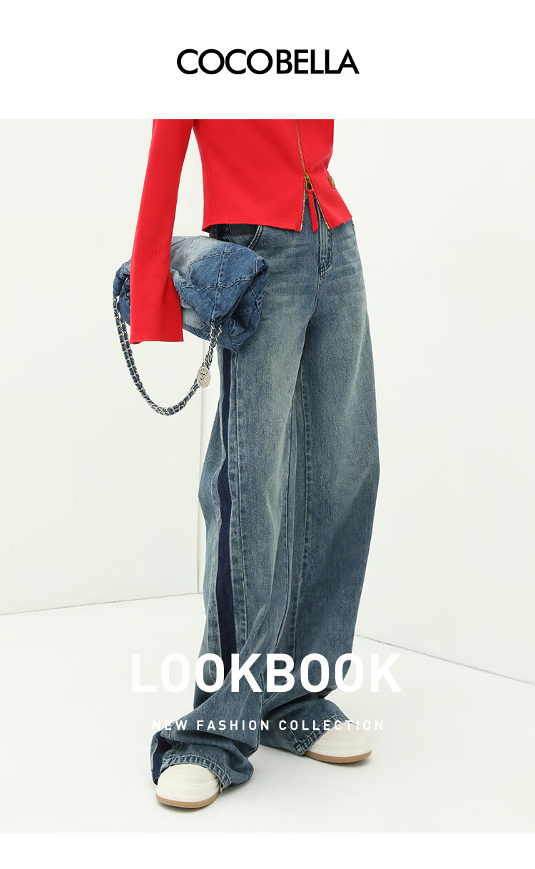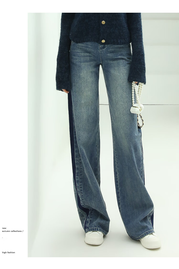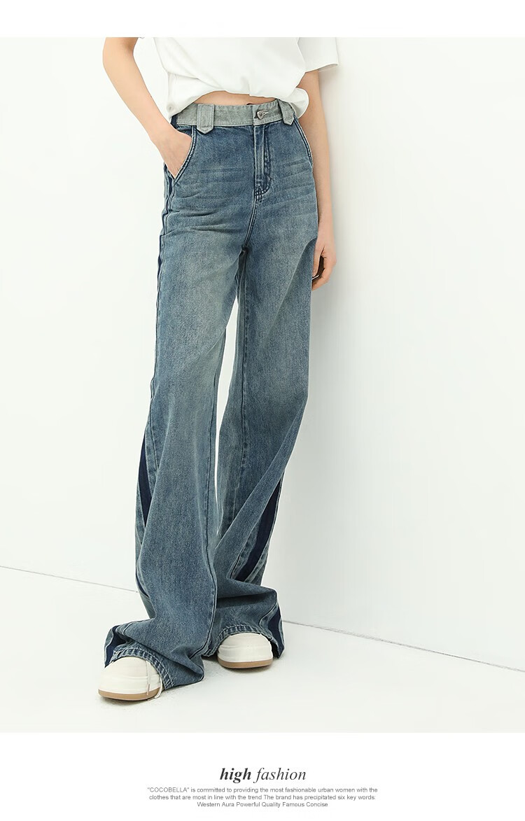 COCOBELLA拼色水洗直筒牛仔裤女秋撞色高腰休闲裤宽松阔腿裤DN26