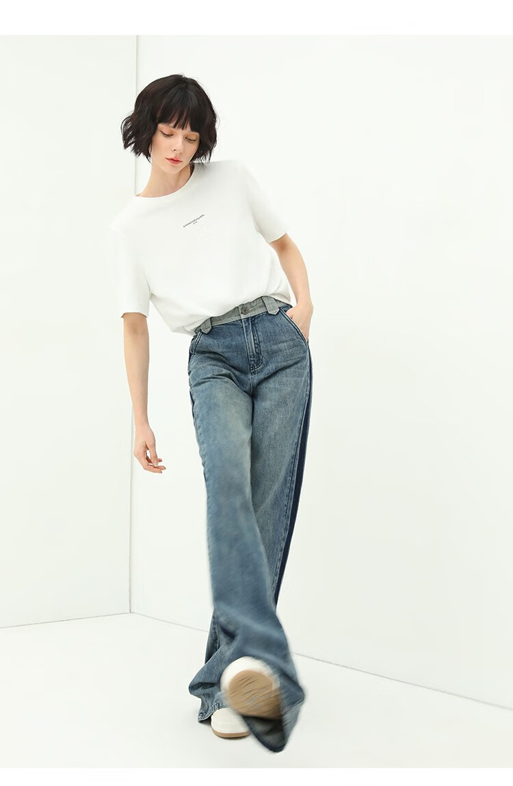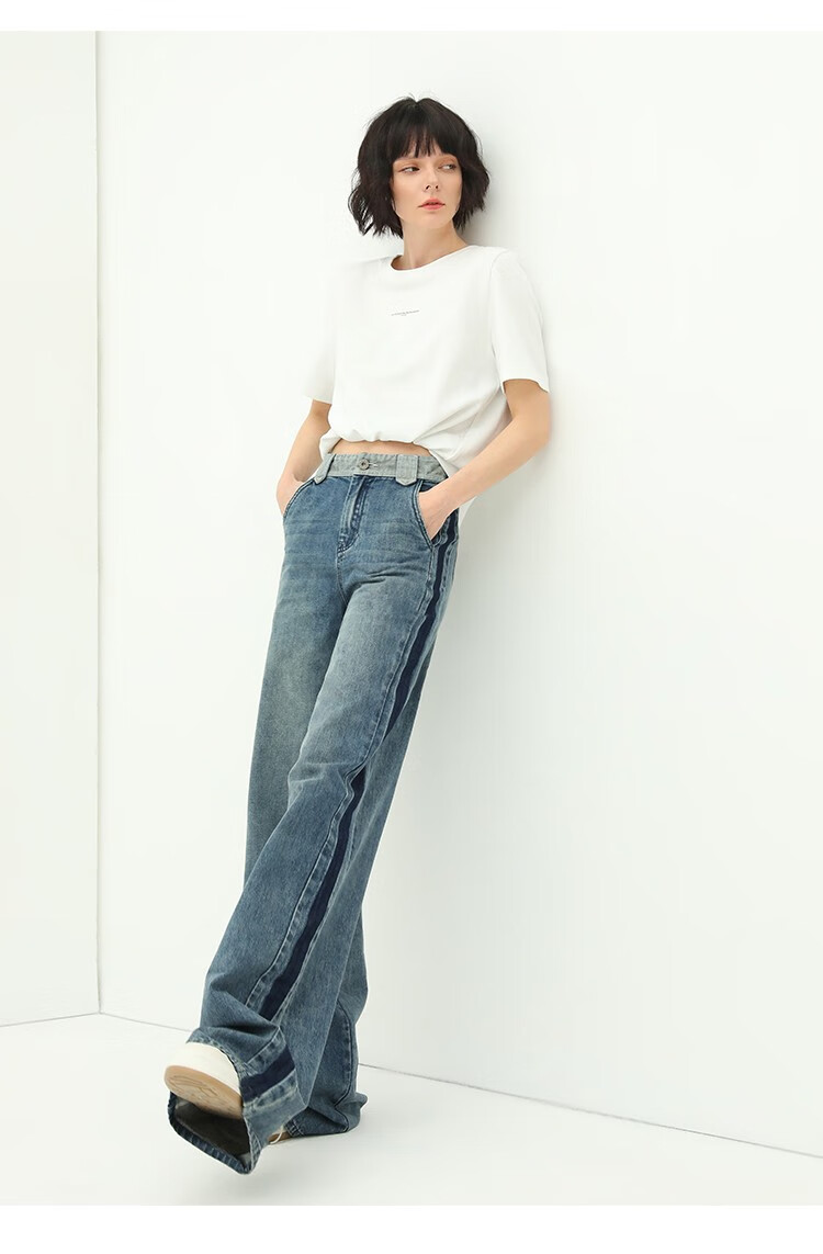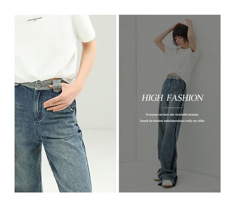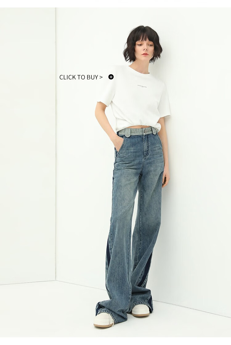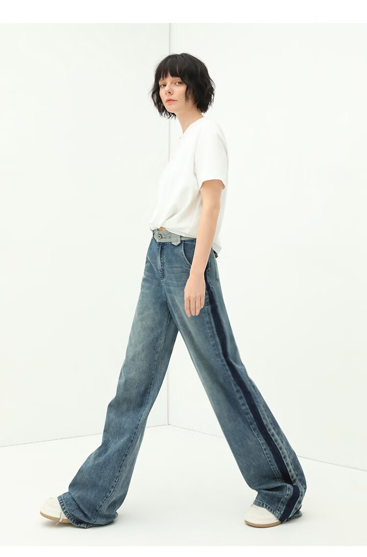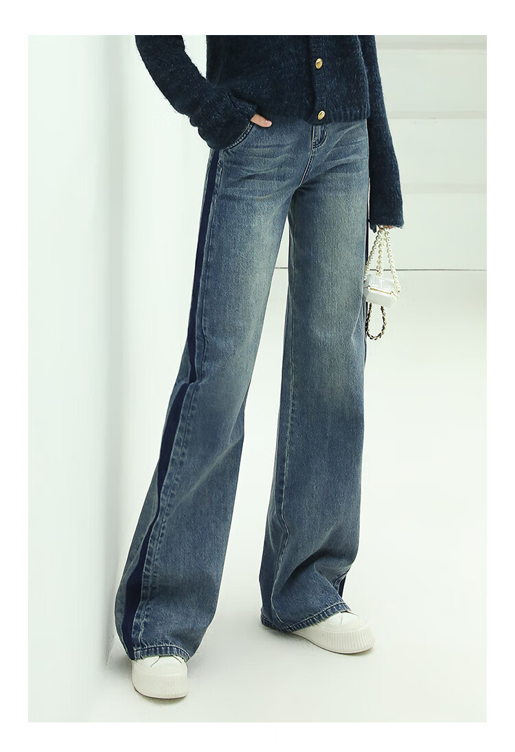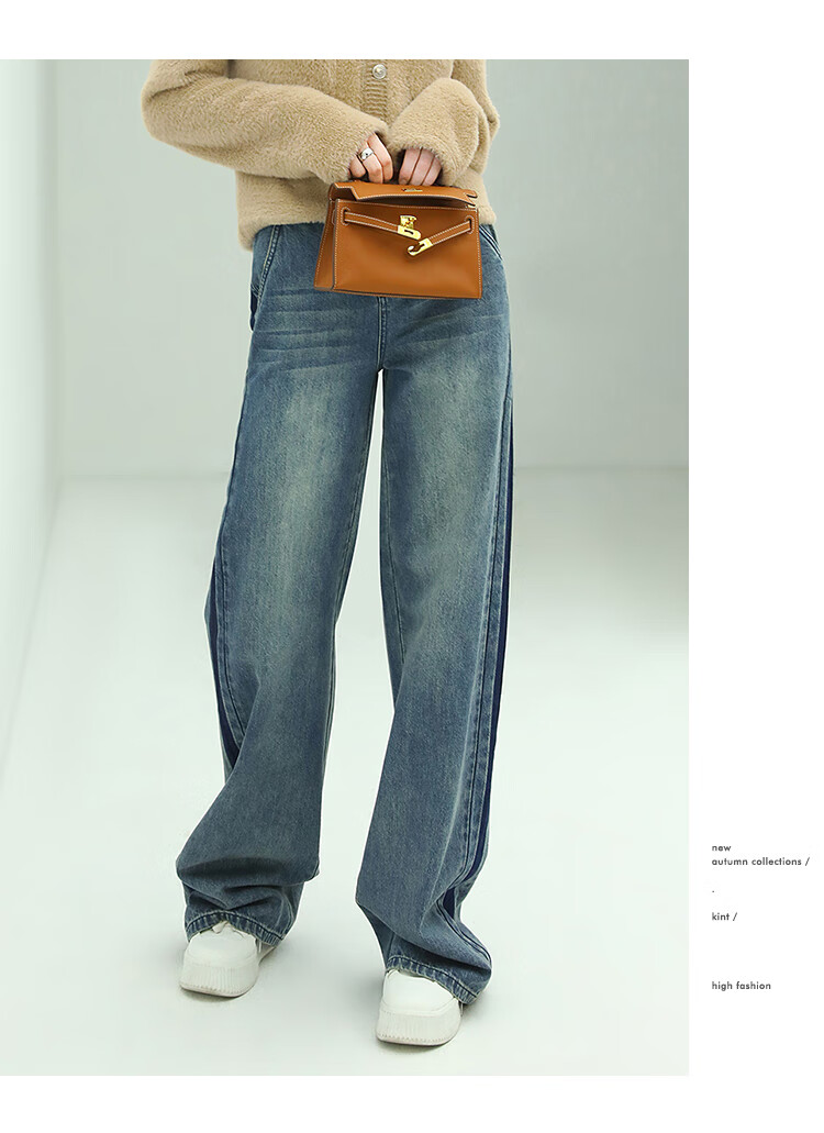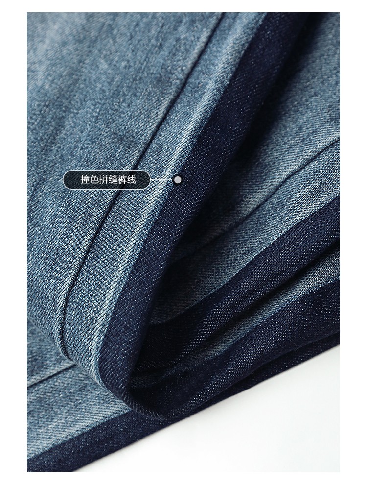 COCOBELLA拼色水洗直筒牛仔裤女秋撞色高腰休闲裤宽松阔腿裤DN26