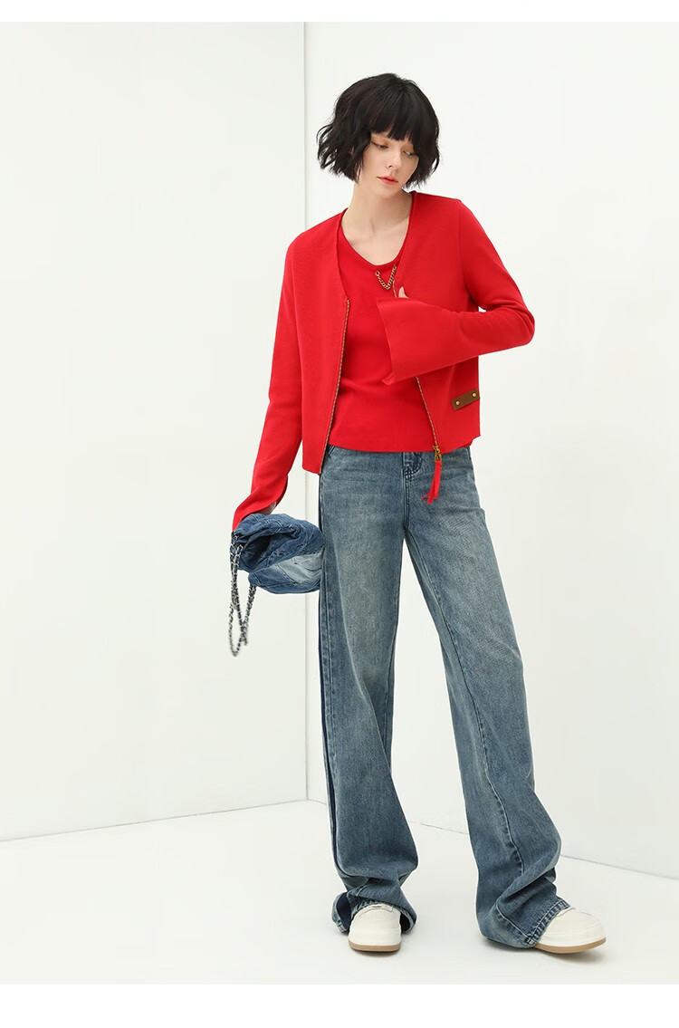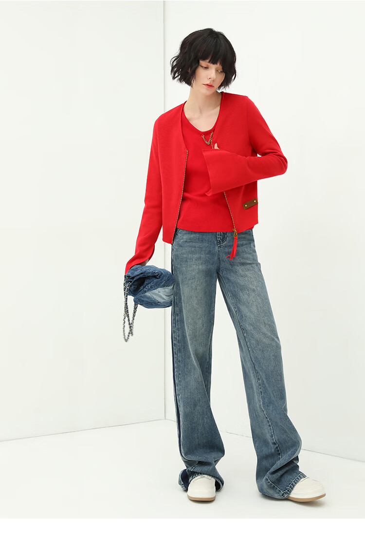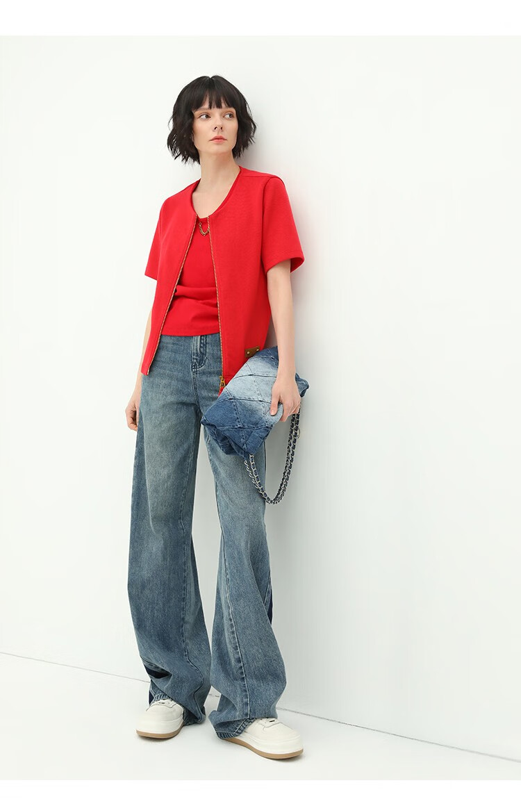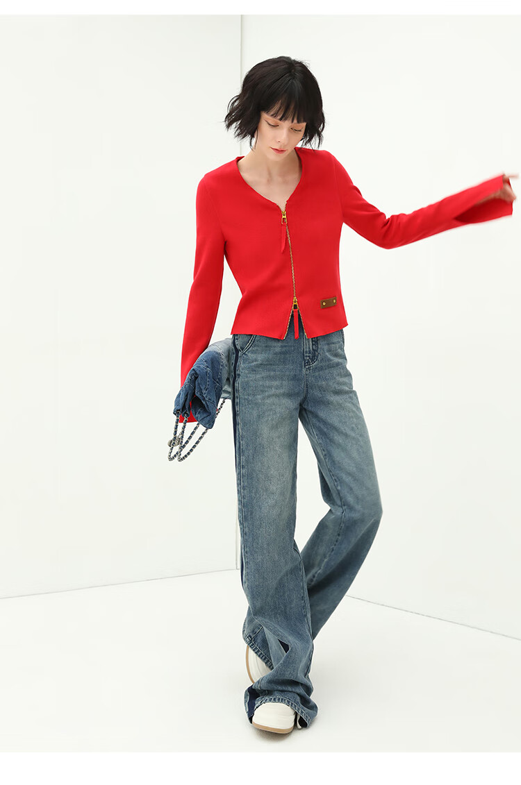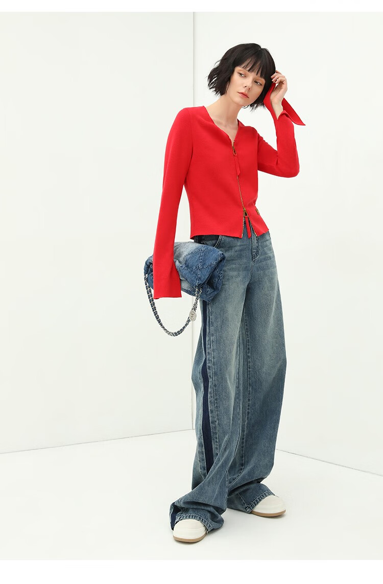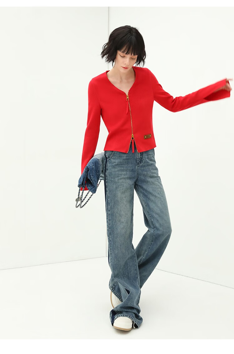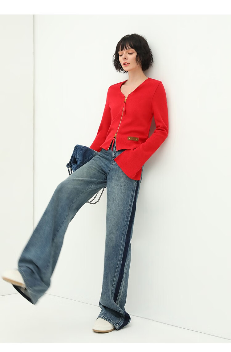 COCOBELLA拼色水洗直筒牛仔裤女秋撞色高腰休闲裤宽松阔腿裤DN26