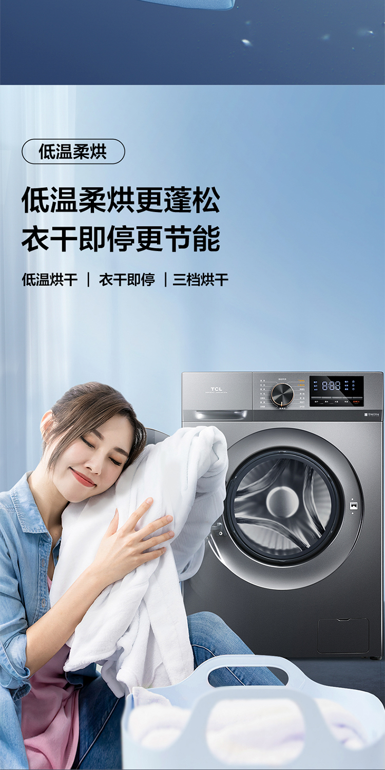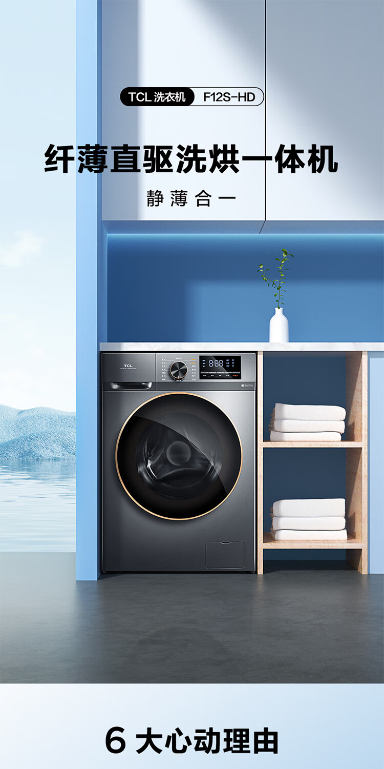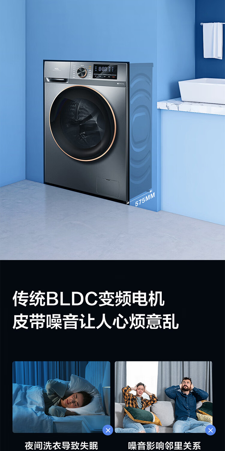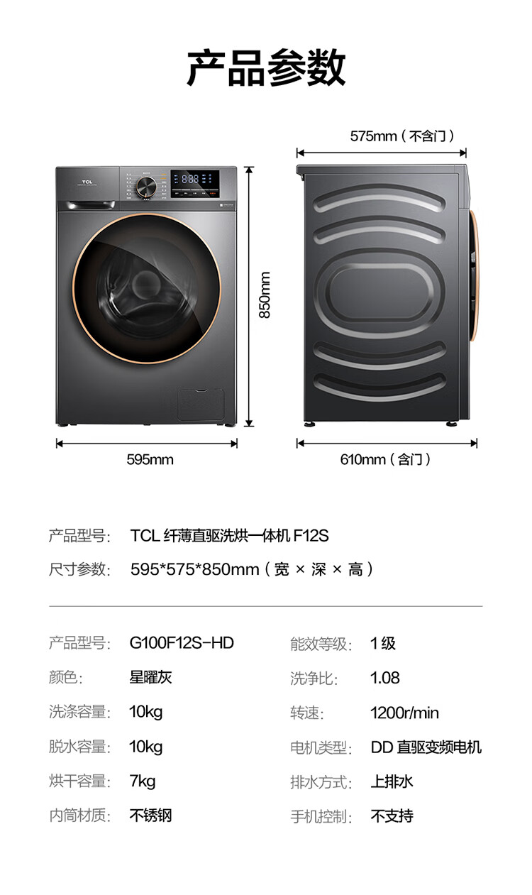 TCL 10公斤纤薄洗烘滚筒 DD直驱变频 575mm纤薄机身 低温柔烘 G100F12S-HD星耀灰(线下同款)