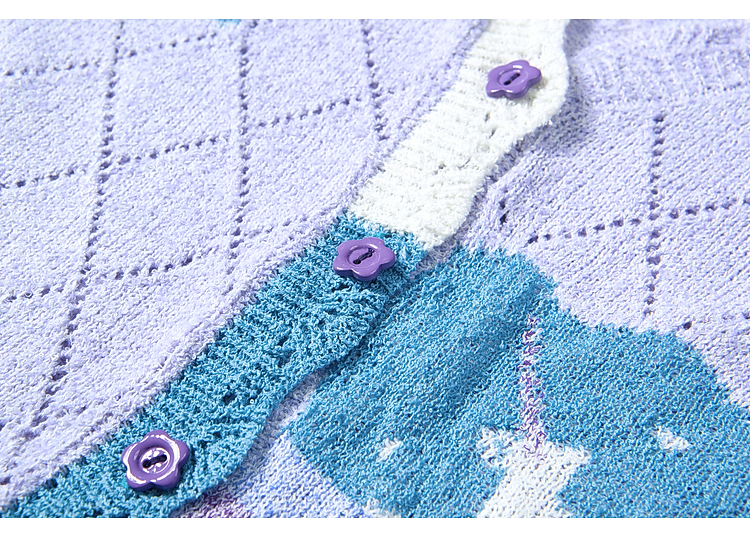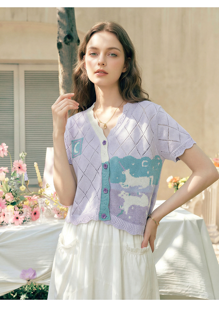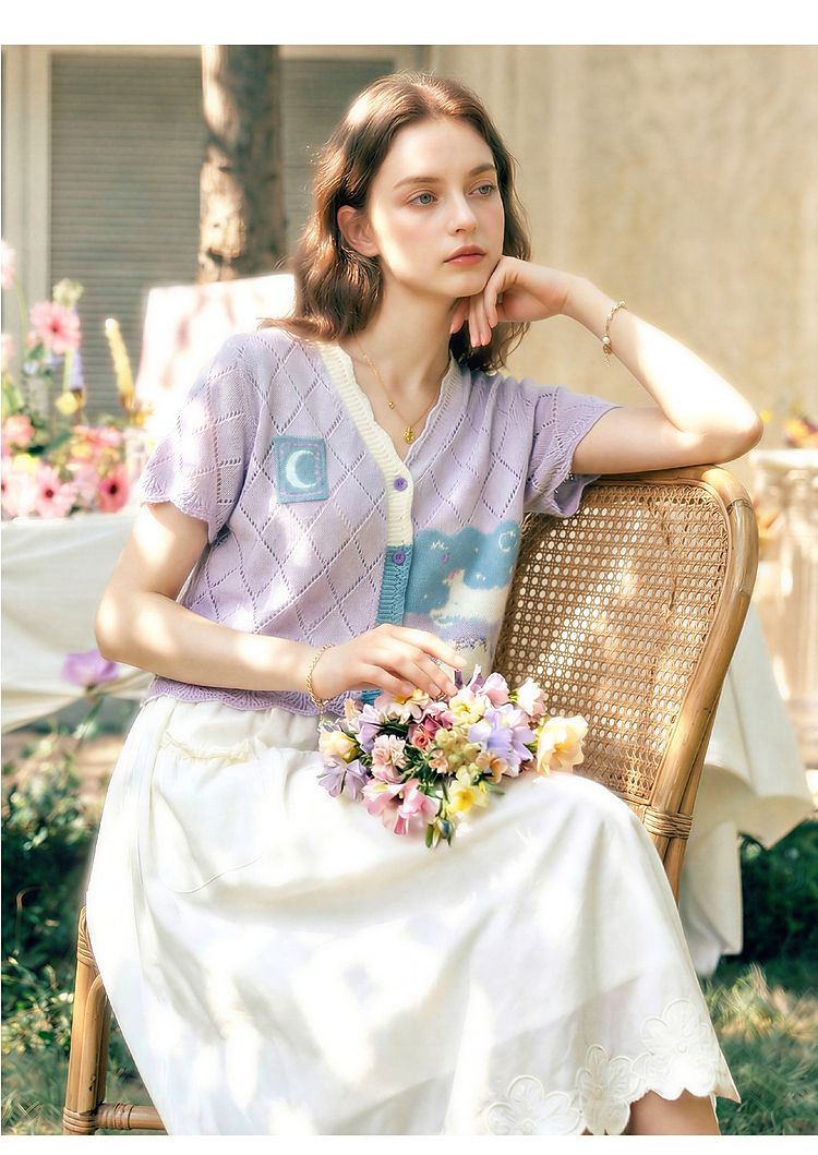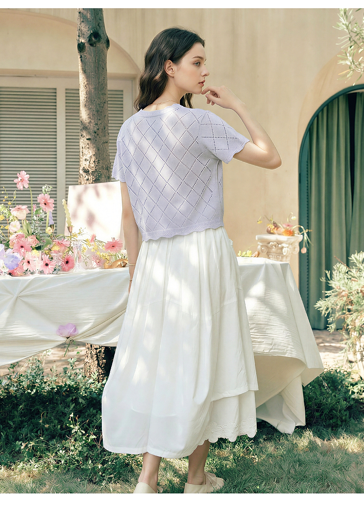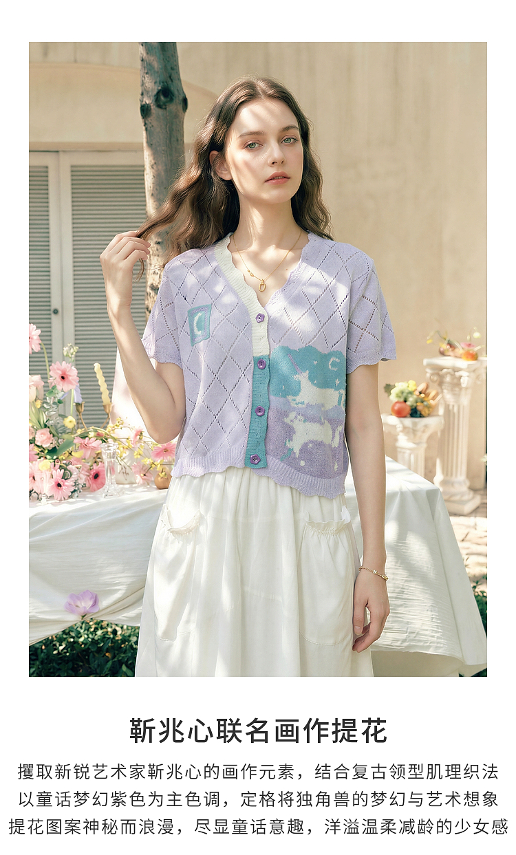 两三事淡彩纪事2026夏新款温柔风镂空菱形格毛巾绣短款针织开衫女