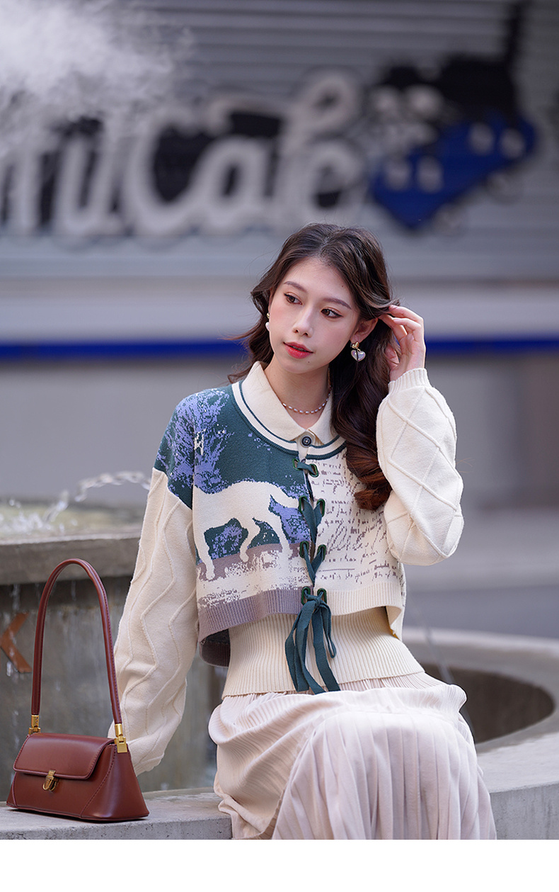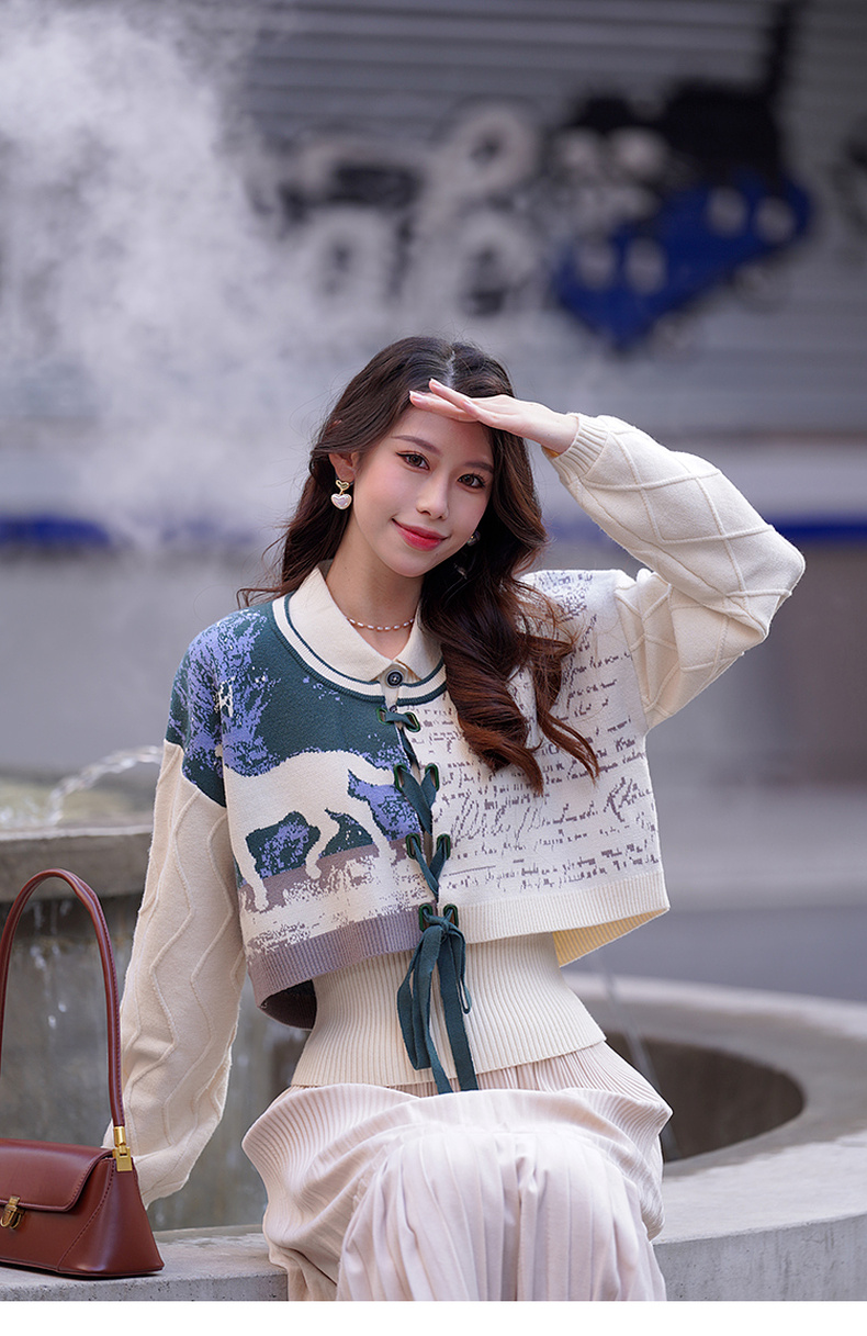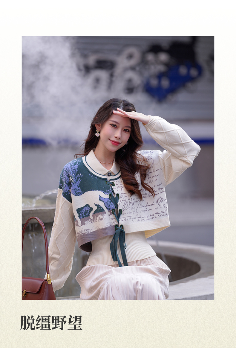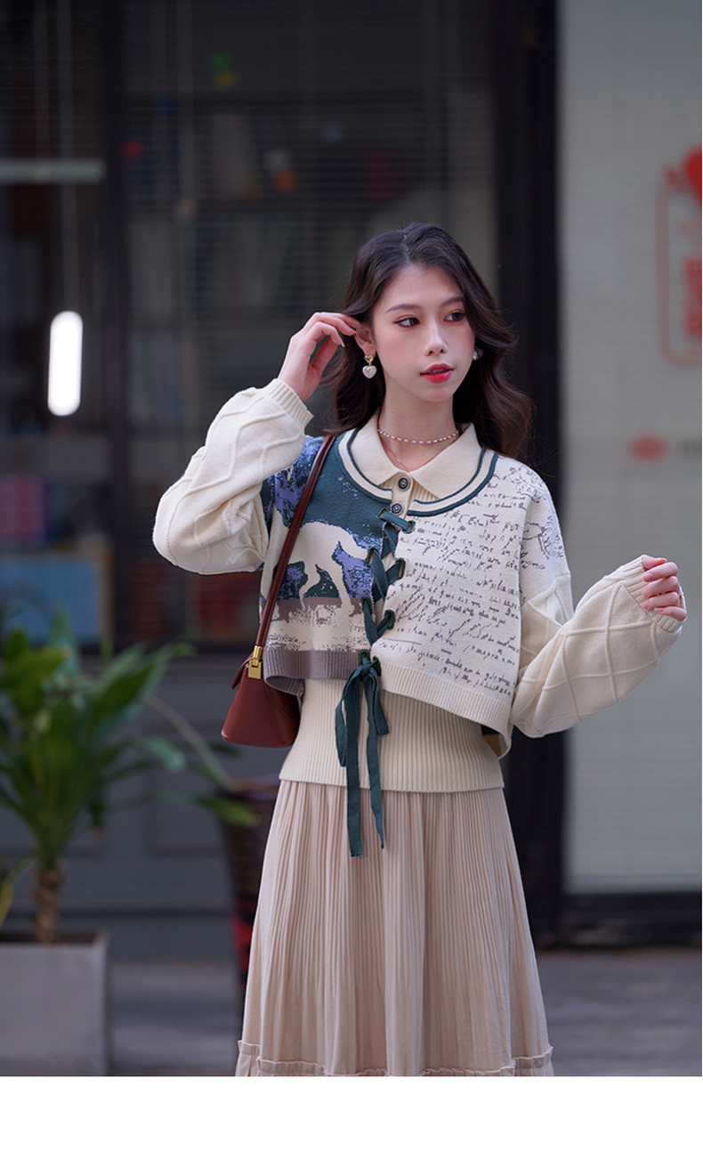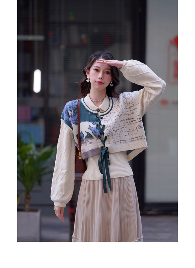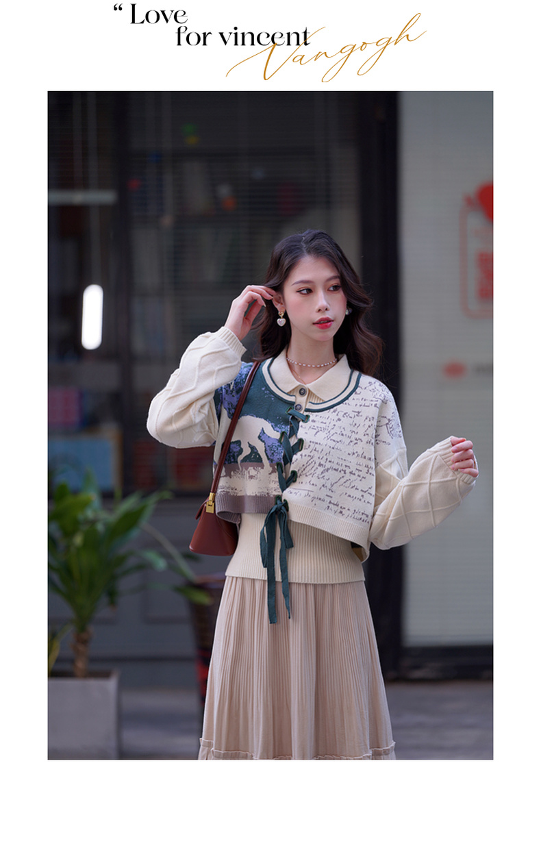 两三事梵高文艺脱缰野望动物图抽绳绑带两件套针织衫女