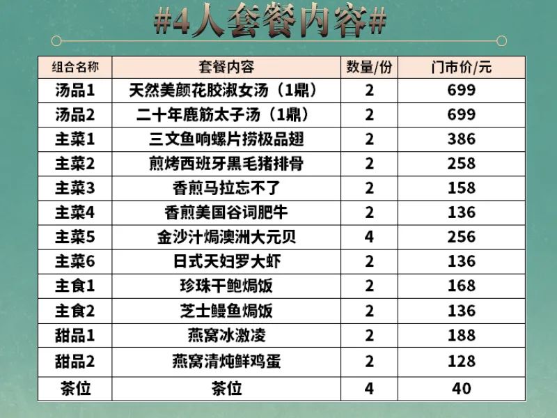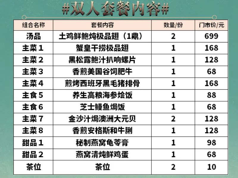 ◆ 套餐包含菜品需1次消费完毕,不可拆分不同日期享用,部分菜品若因时令或其他不可抗因素导致无法提供,将视实际情况以等价菜品替换