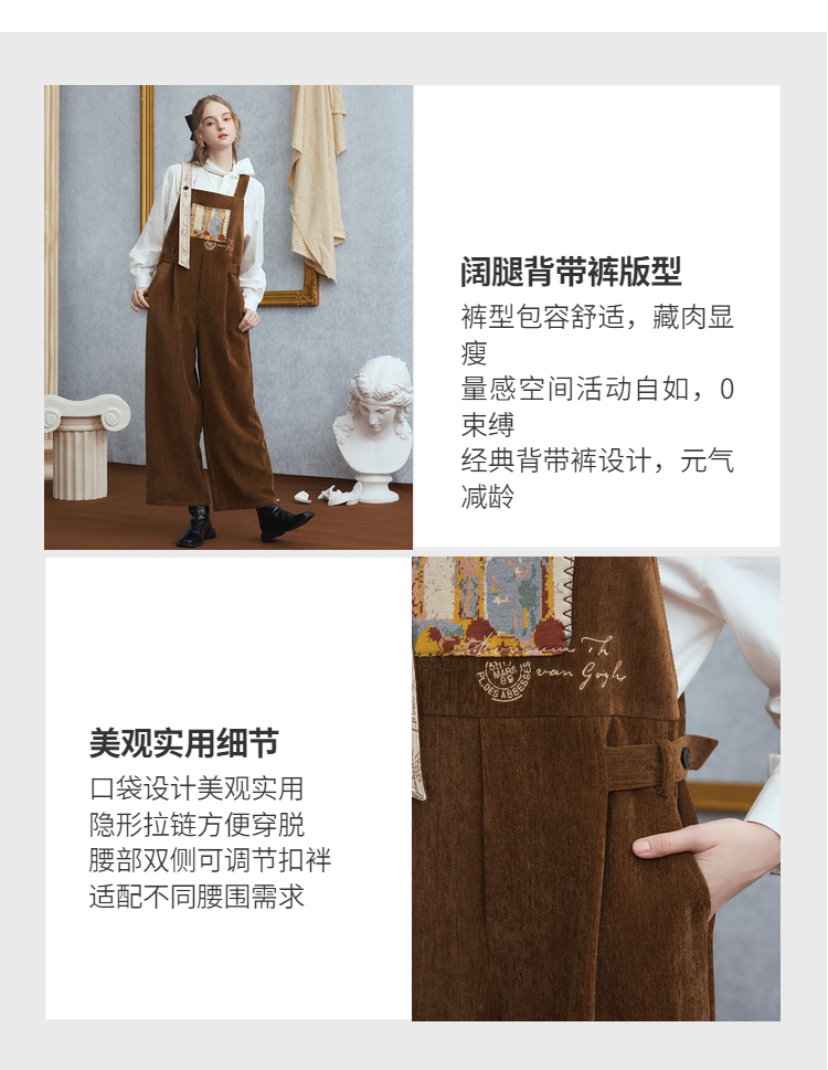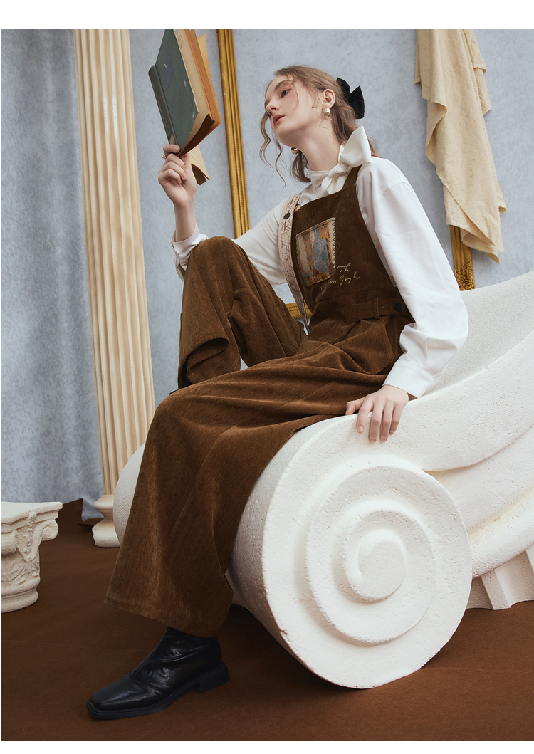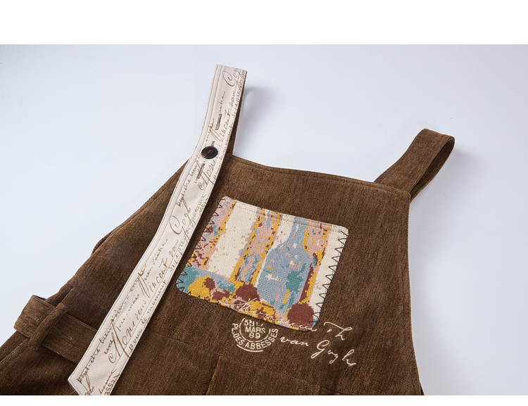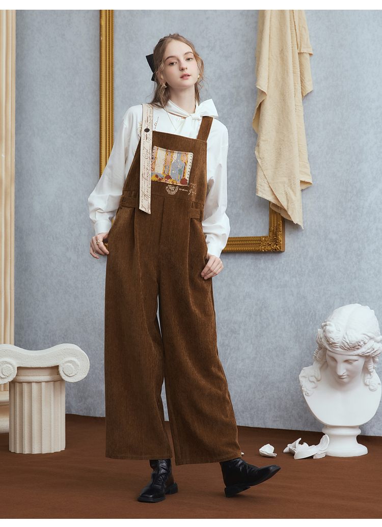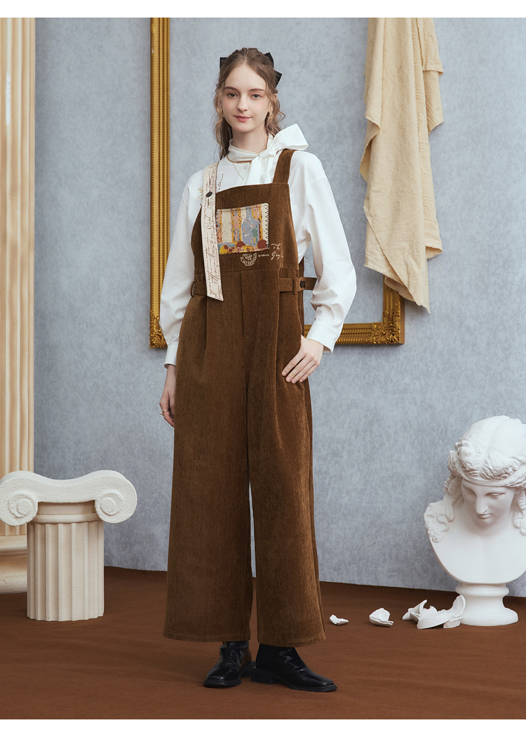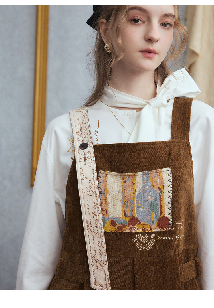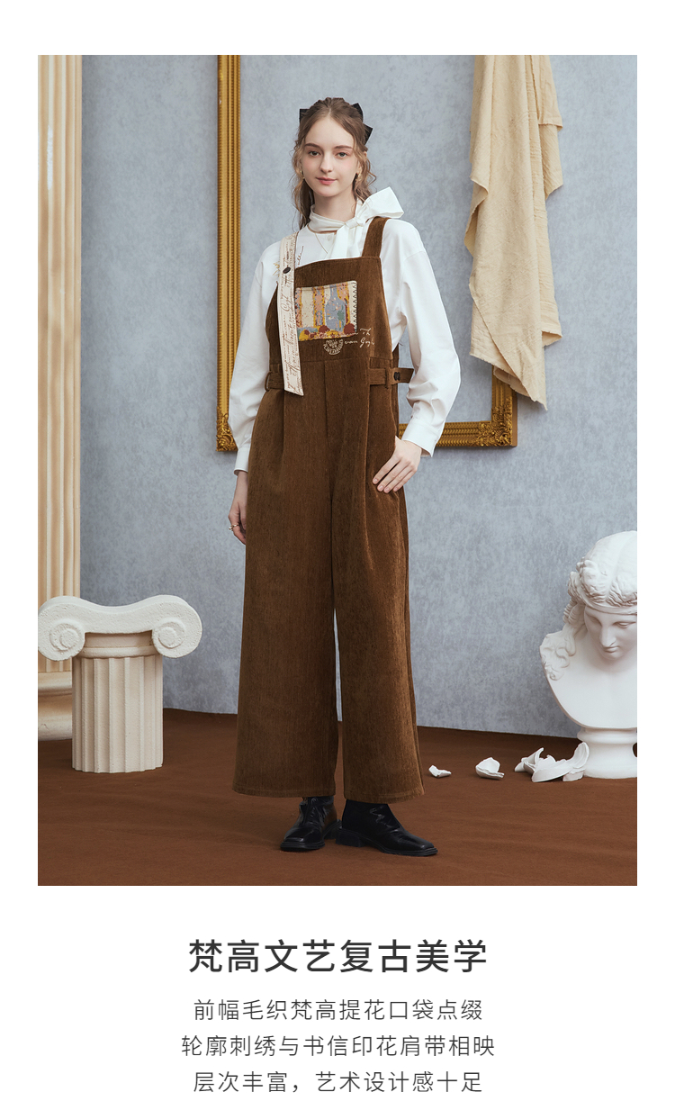 两三事梵高文艺慢调旧金山2025冬新款刺绣印花口袋不对称背带裤女
