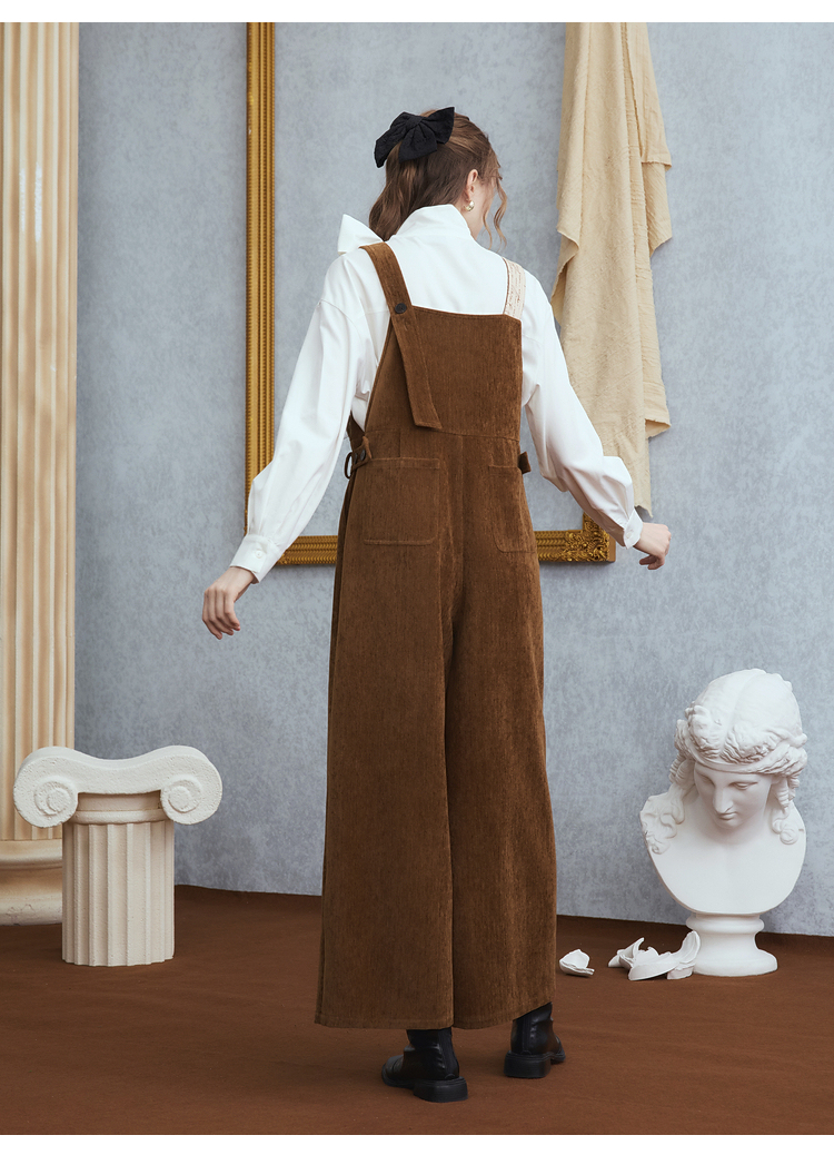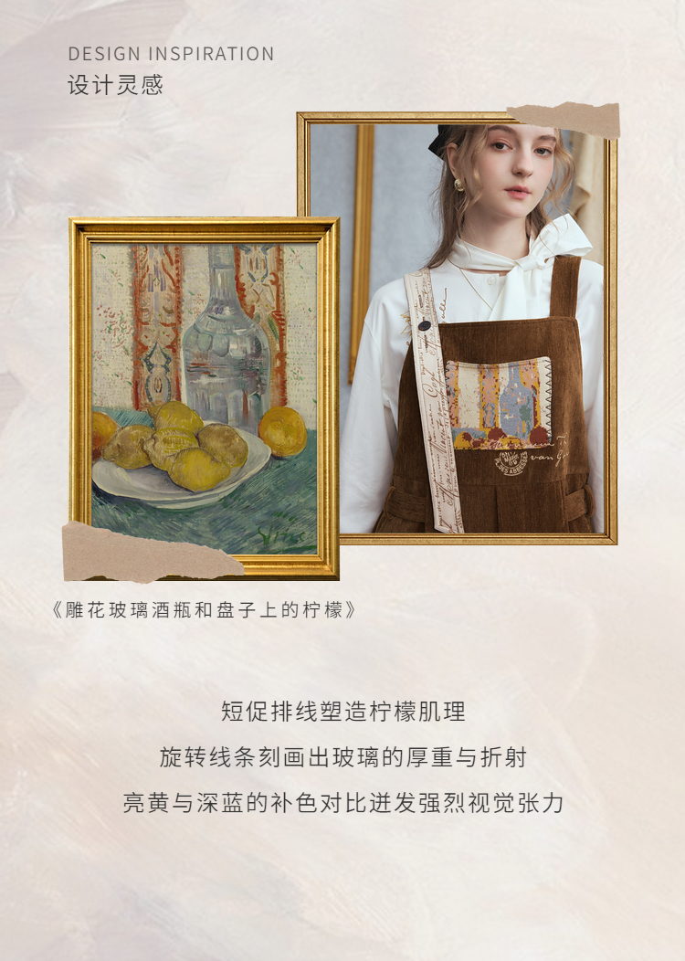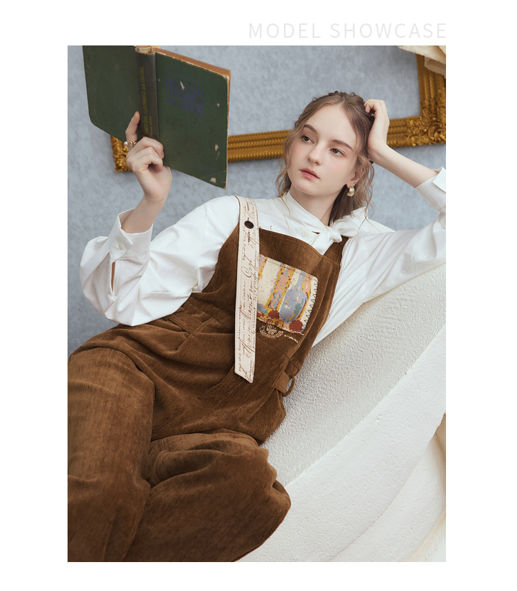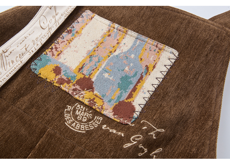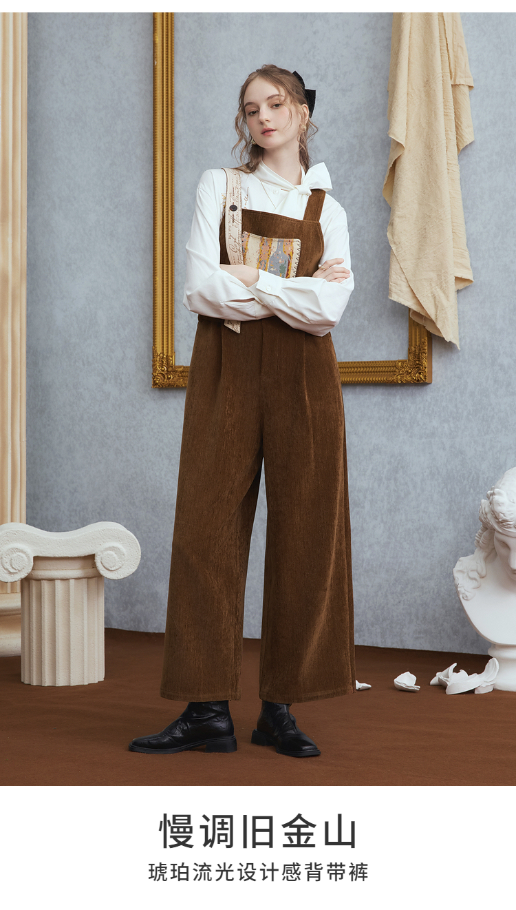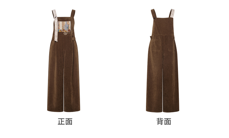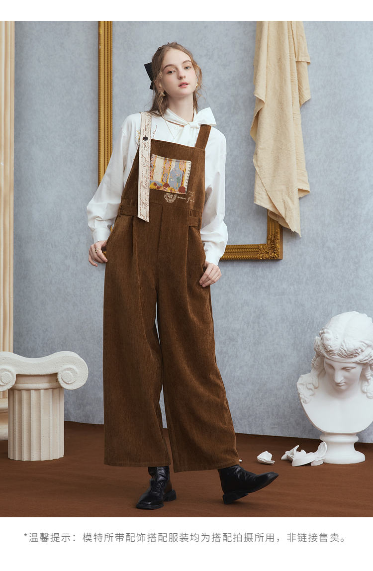 两三事梵高文艺慢调旧金山2025冬新款刺绣印花口袋不对称背带裤女