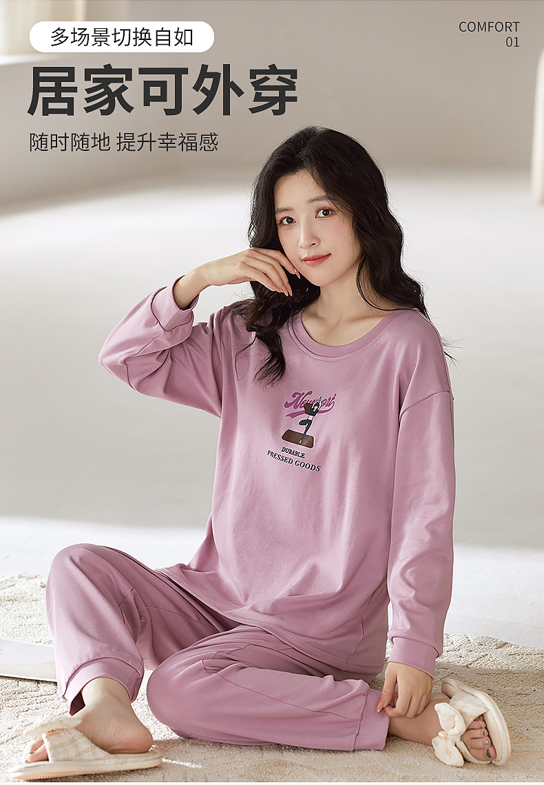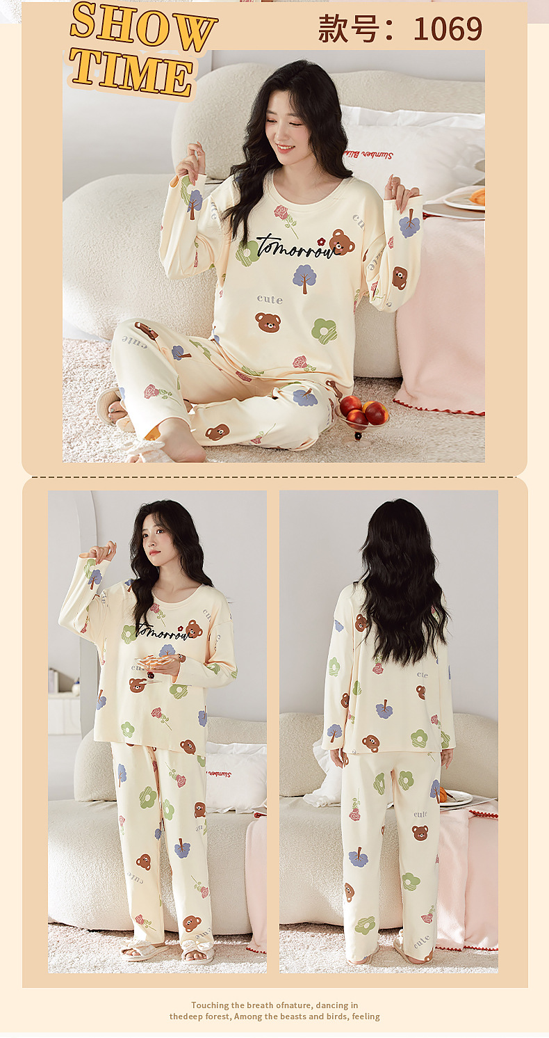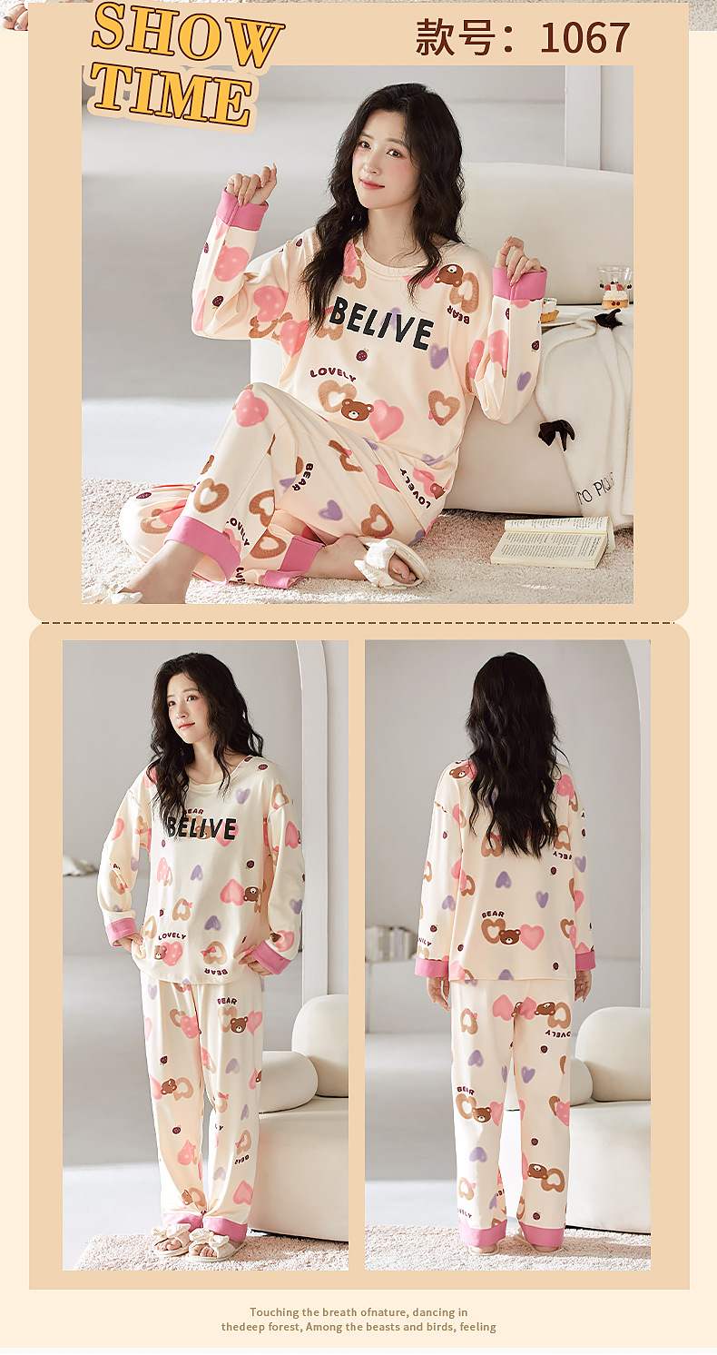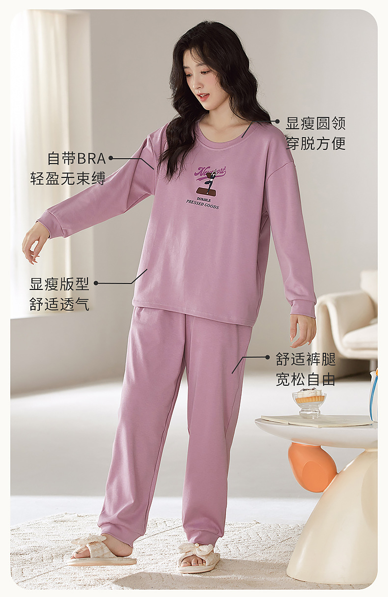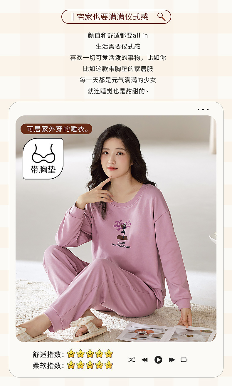 2025年带胸垫卡通薄款睡衣女春秋款长袖圆领棉质家居服可外穿套装