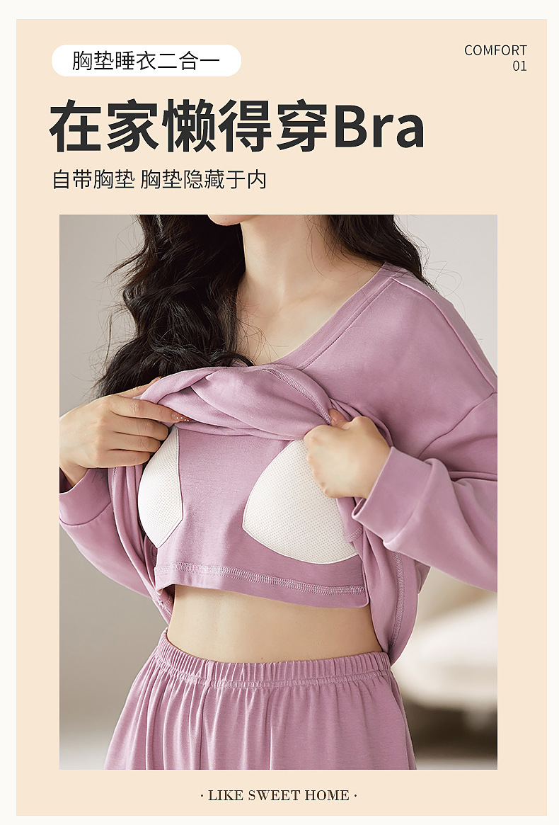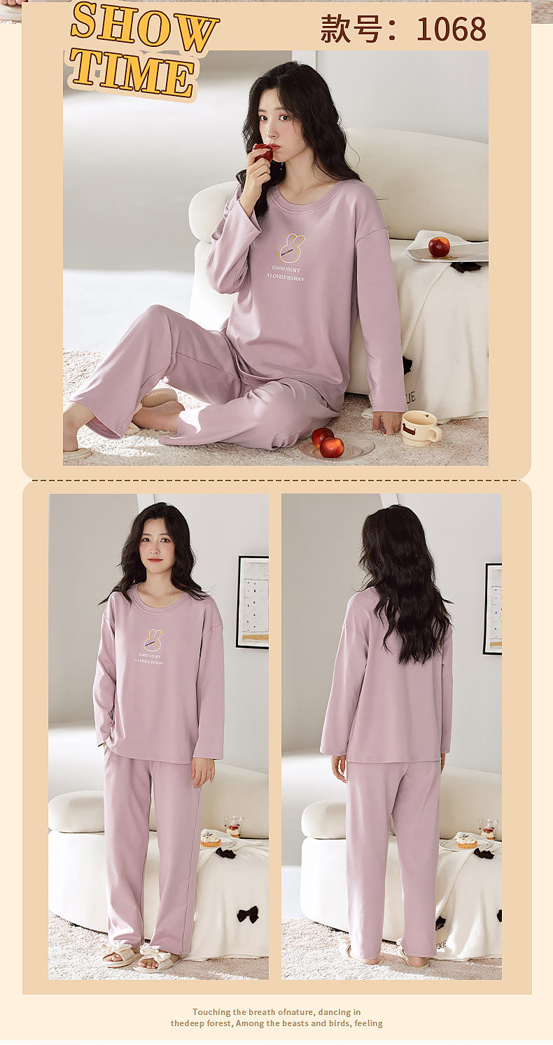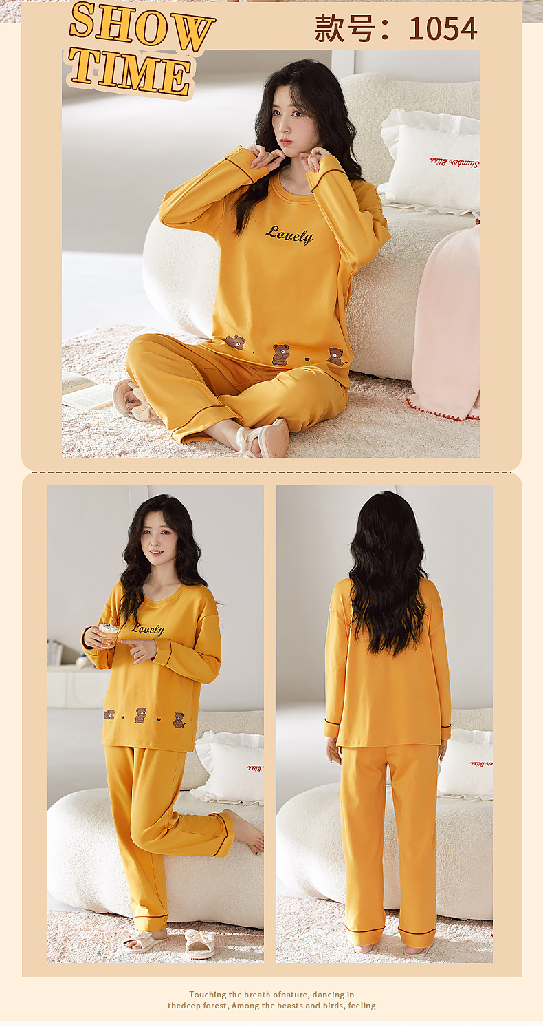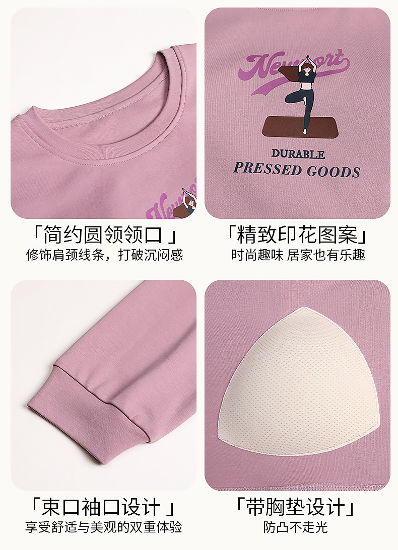 2025年带胸垫卡通薄款睡衣女春秋款长袖圆领棉质家居服可外穿套装