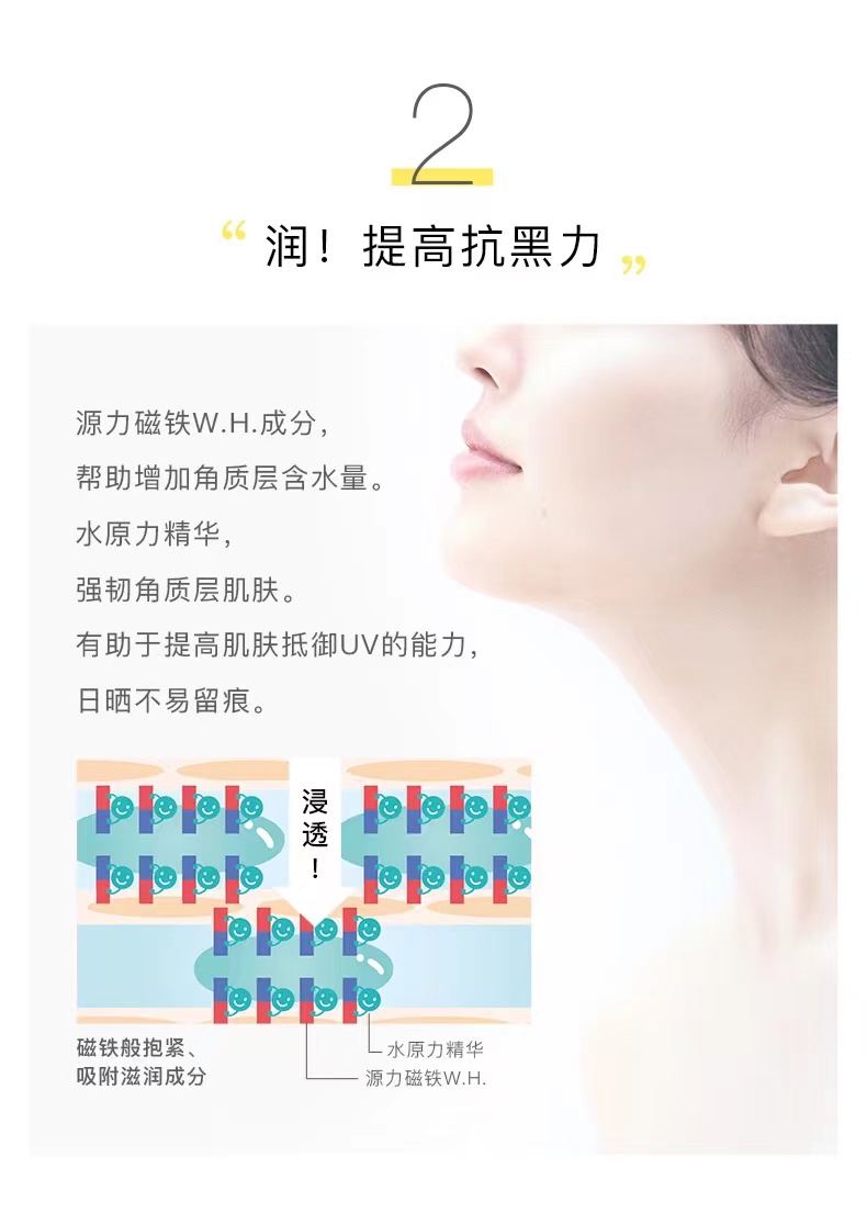 它用了一个特殊的W.H防御成分,大大削弱了黑色素的形成,在使用的时候,你就能明显感受到水能快速渗透进肌肤,马上嗖嗖"吃"进去那种,像嗦粉一样。实验室对照数据表明其吸收效率高达5倍,深润保湿的同时不粘腻。