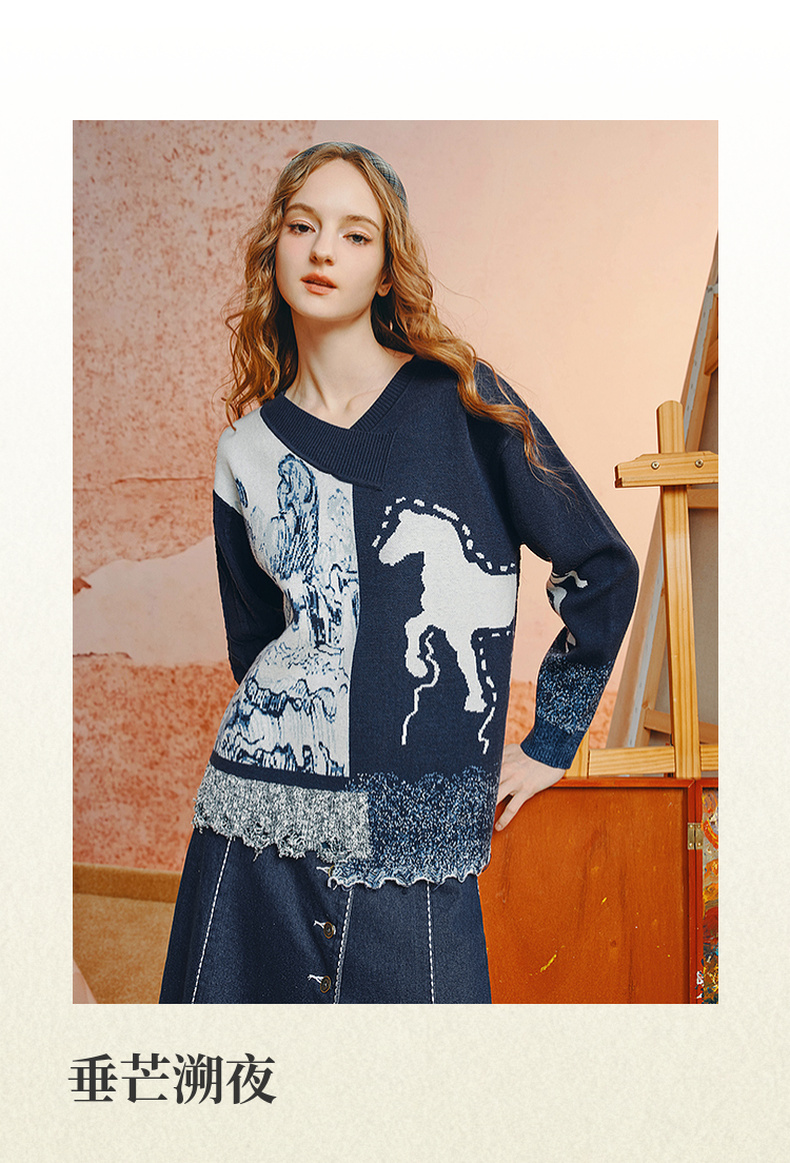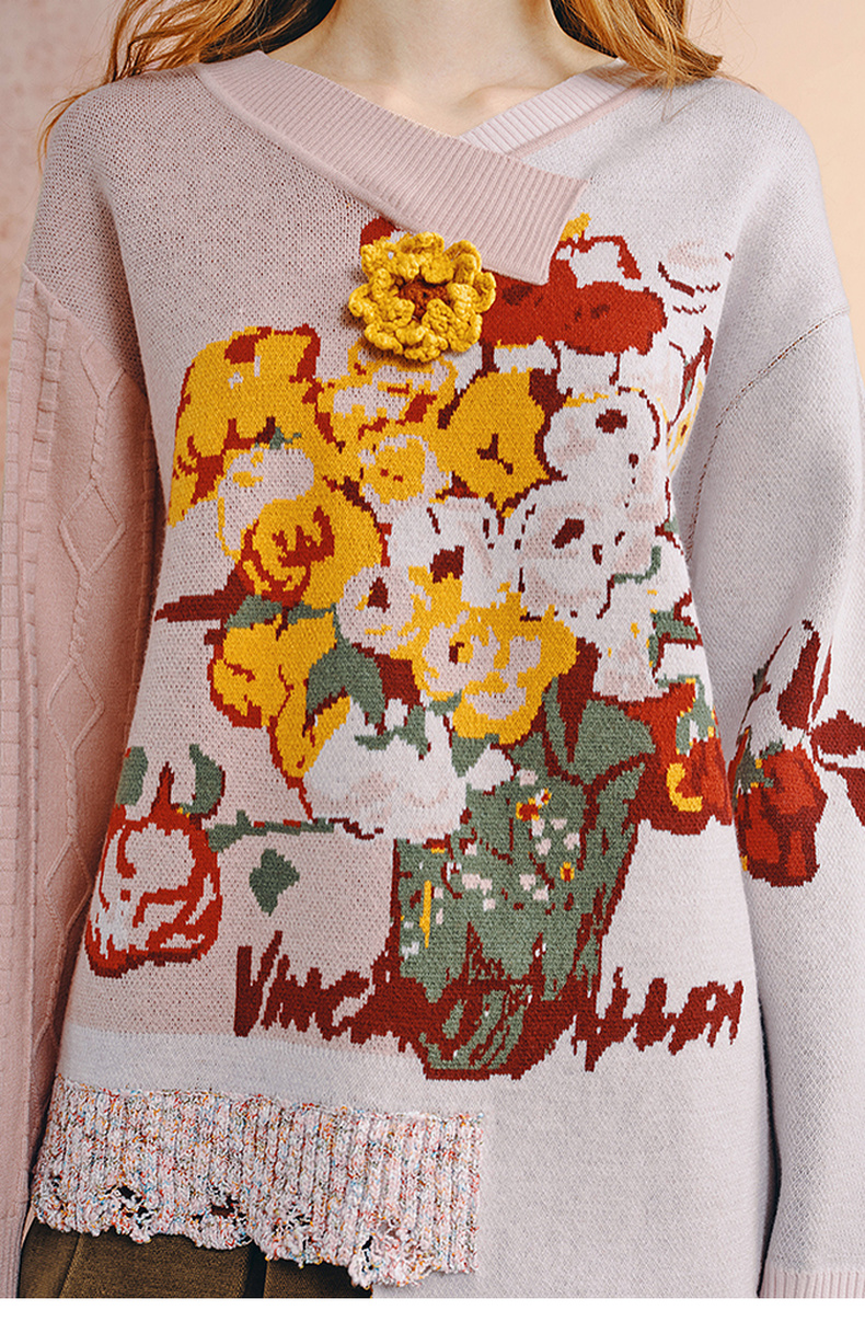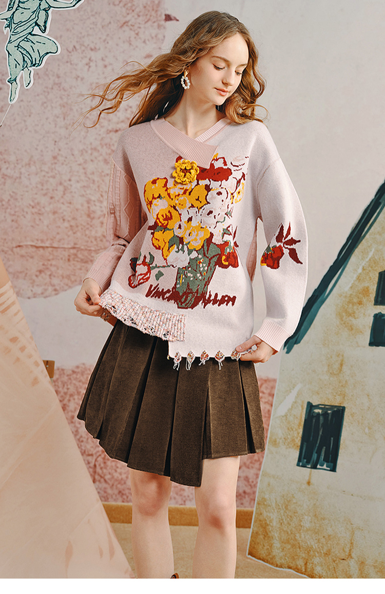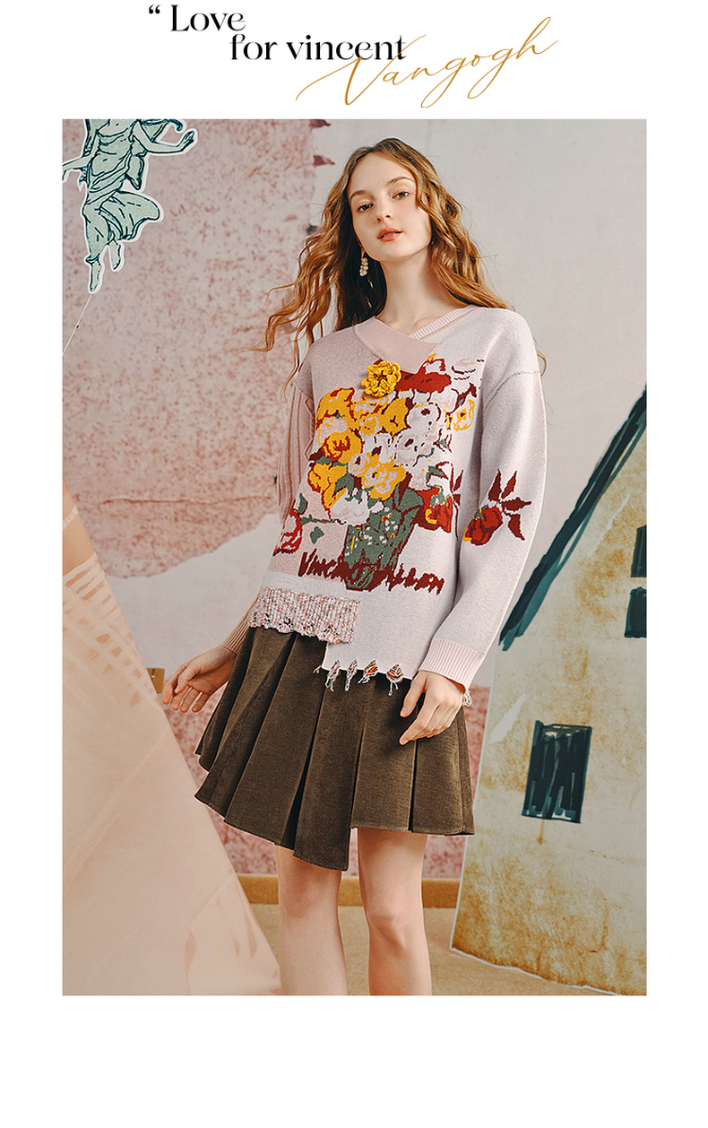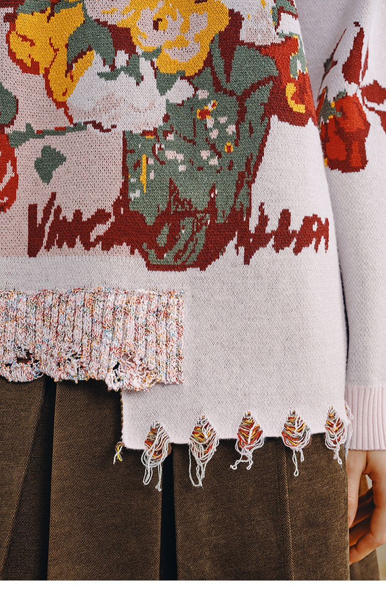 两三事梵高文艺垂芒溯夜2025秋季新款不对称木耳边下摆花色毛衣女