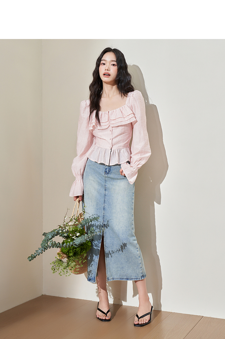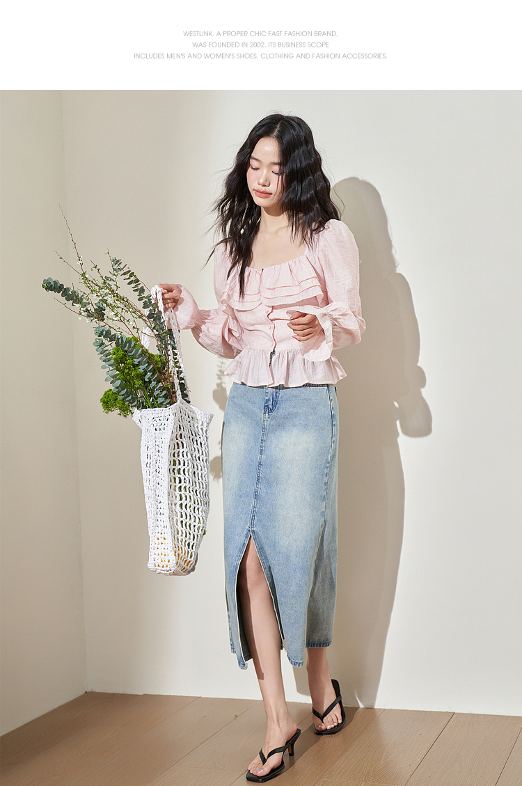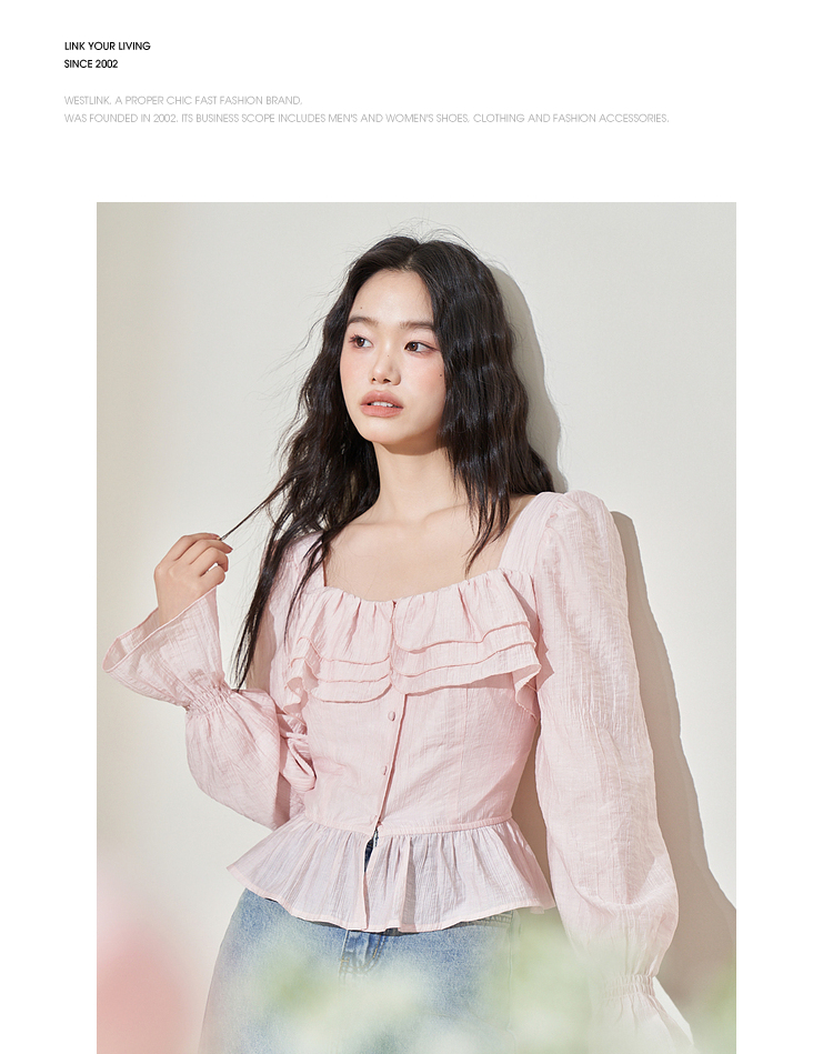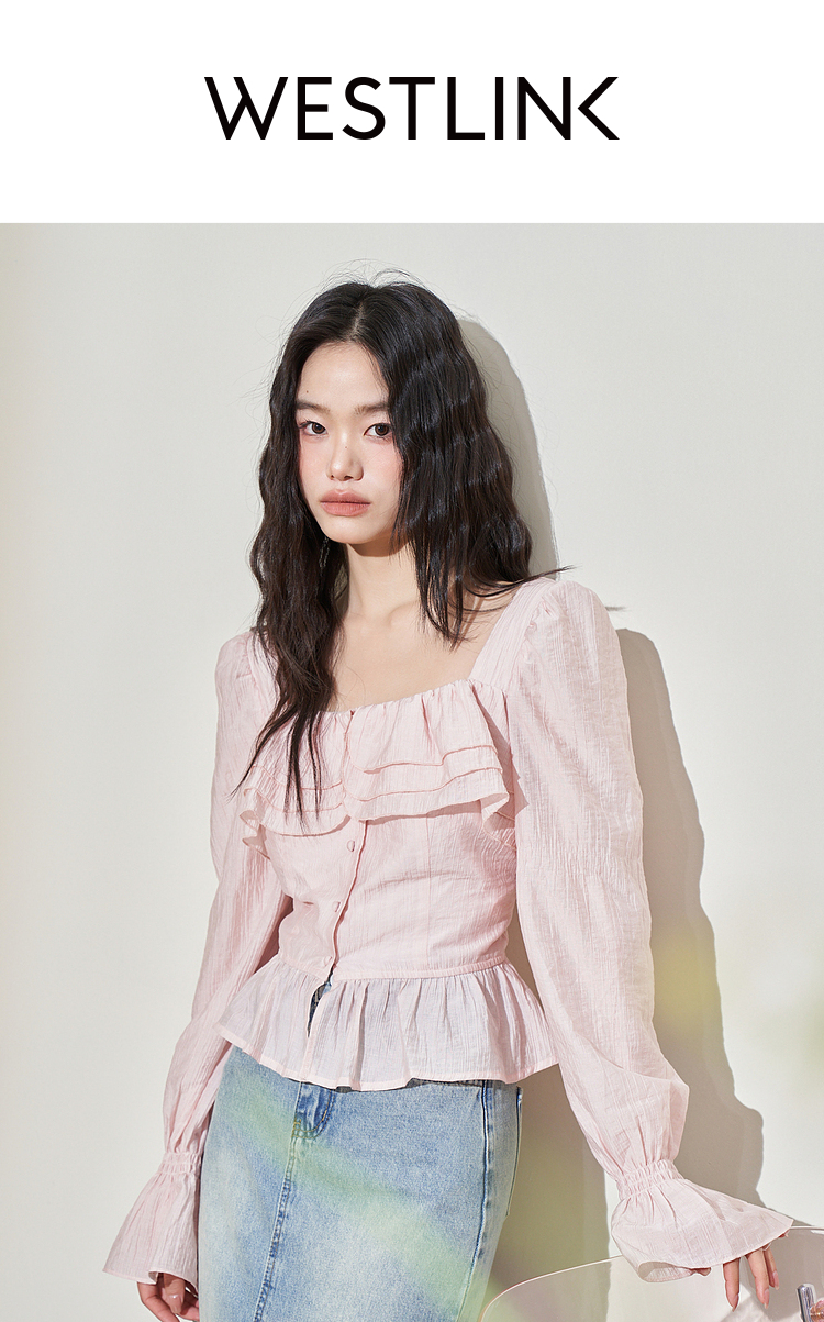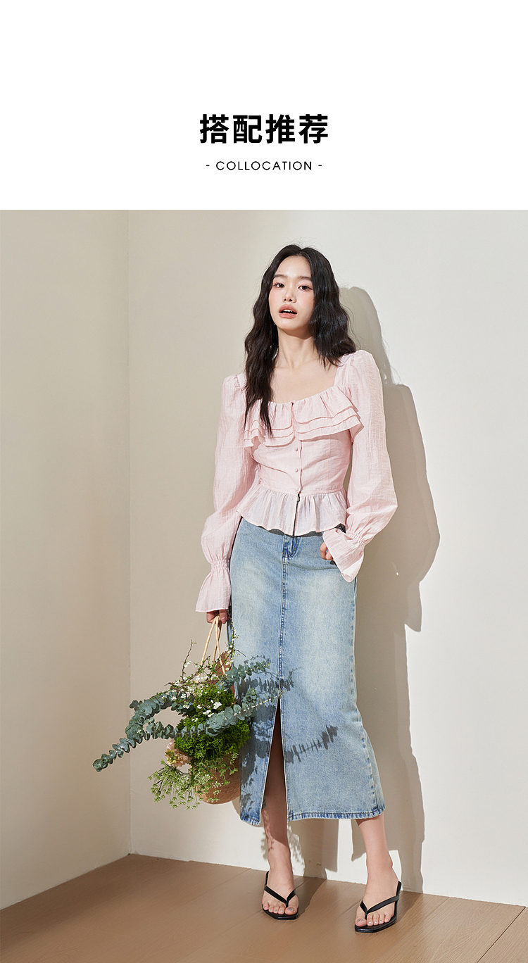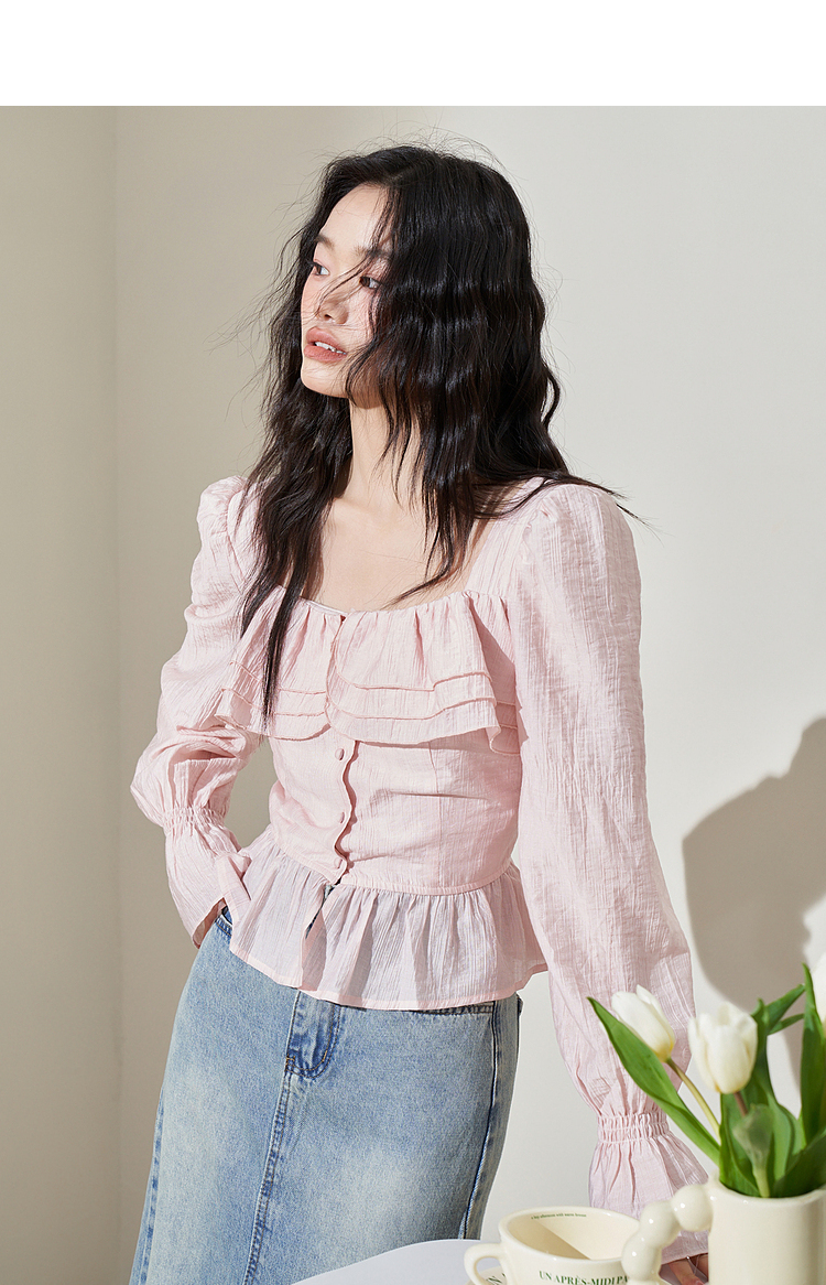 法式浪漫甜美荷叶边花苞袖衬衫女2024春季新款短款方领衬衣V0040977