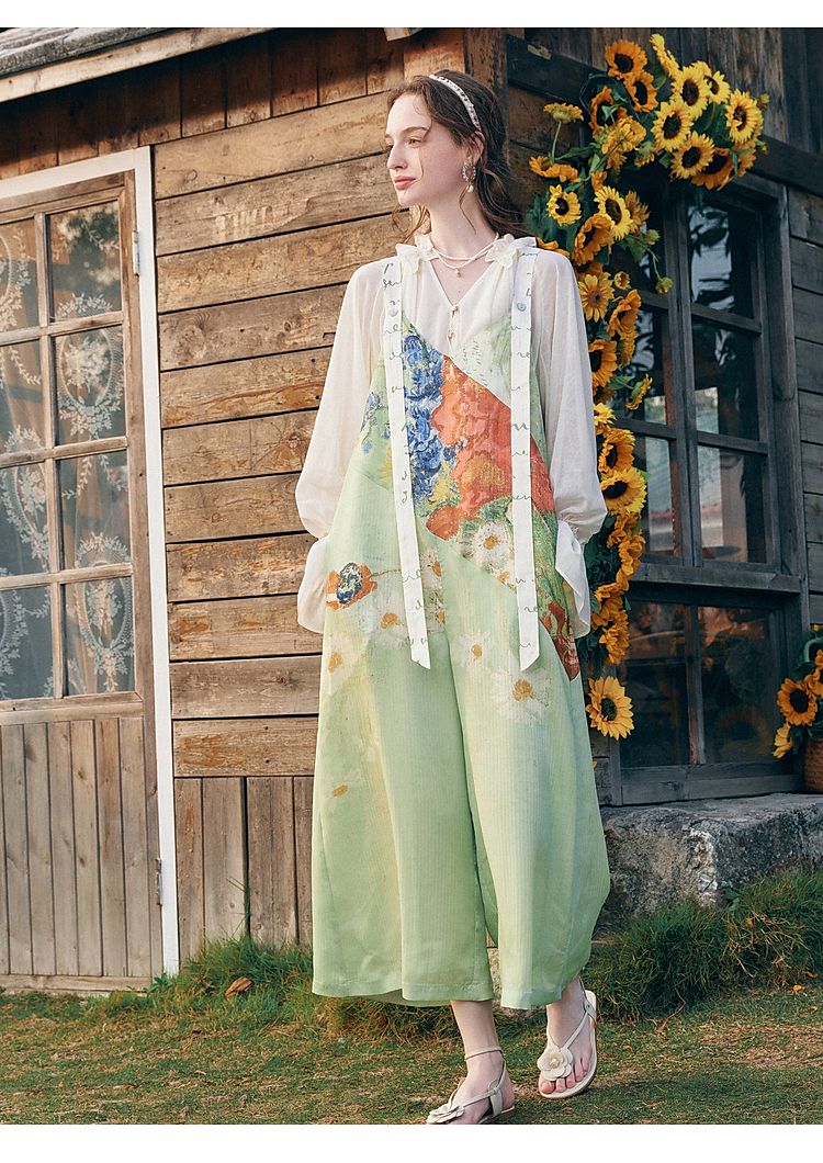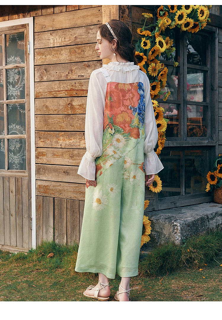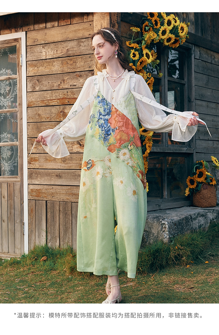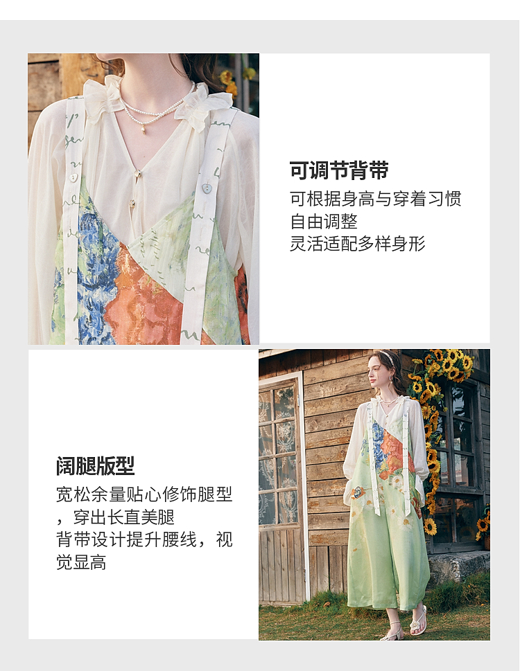 两三事梵高文艺糖渍青梨2026春季新款小清新印花可调背带裤女宽松