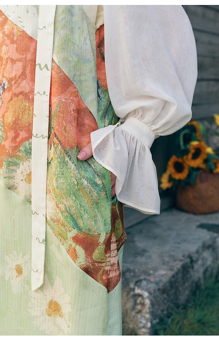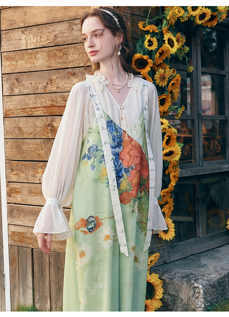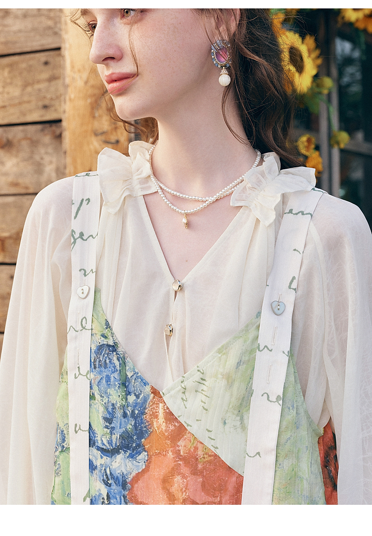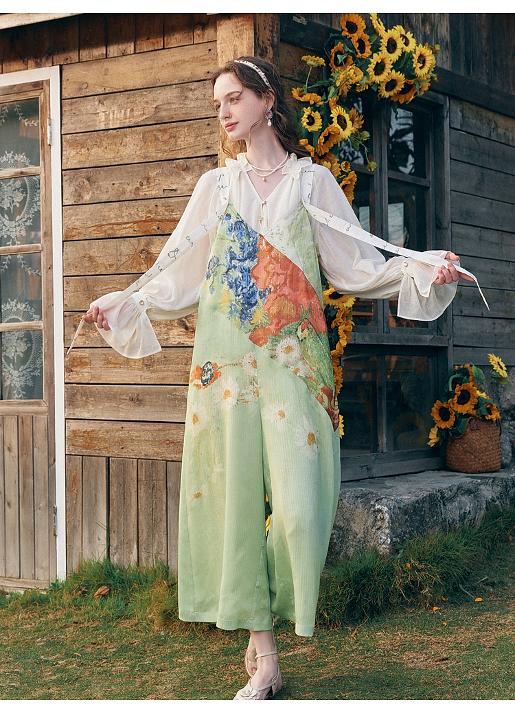 两三事梵高文艺糖渍青梨2026春季新款小清新印花可调背带裤女宽松