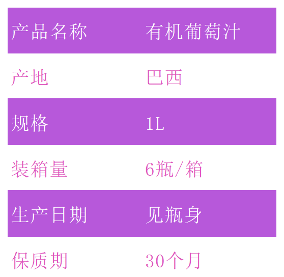 产自巴西, 100%葡萄汁,采用伊莎贝尔与波尔杜两种北美洲葡萄品种制成;