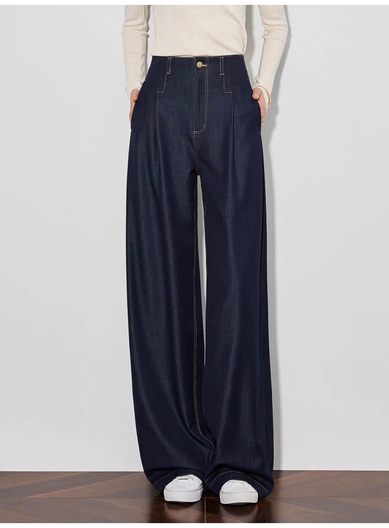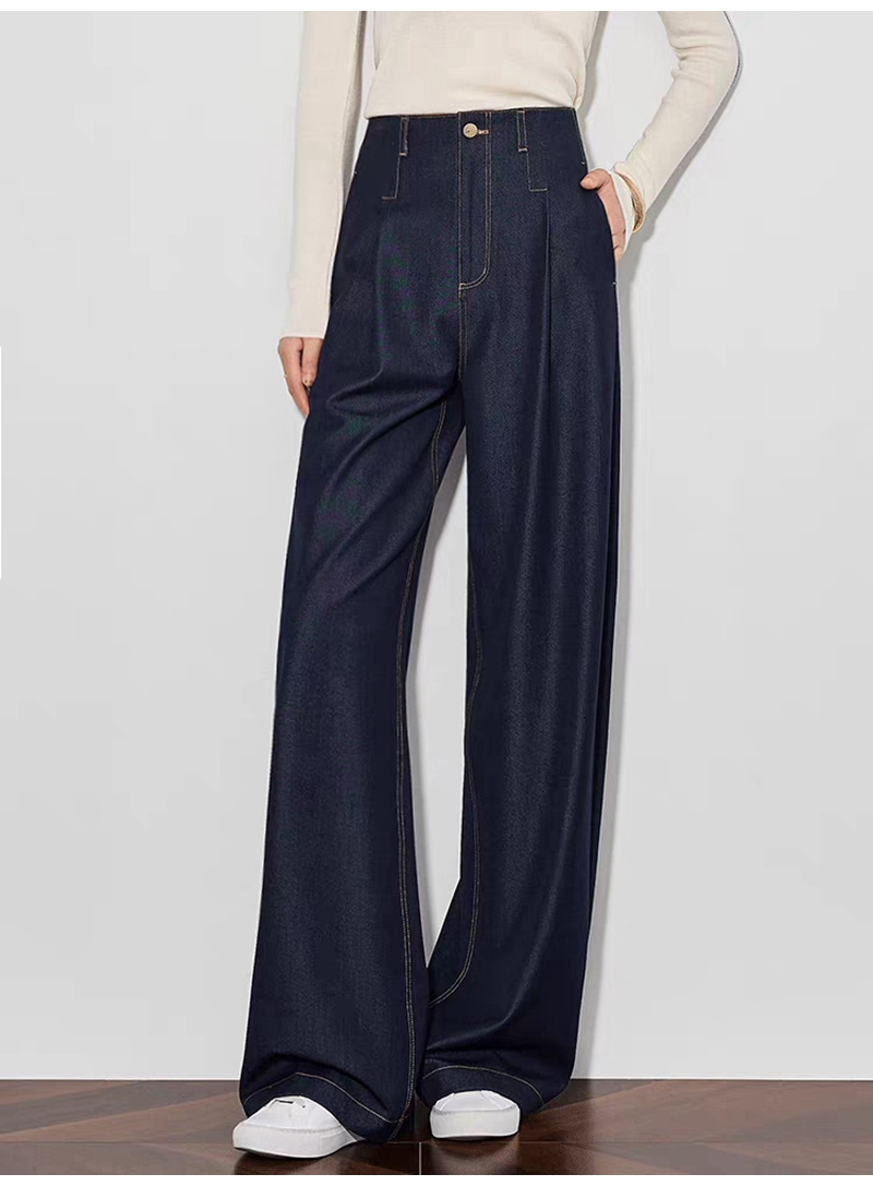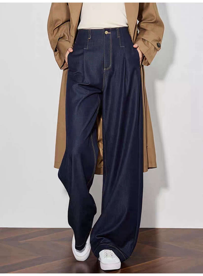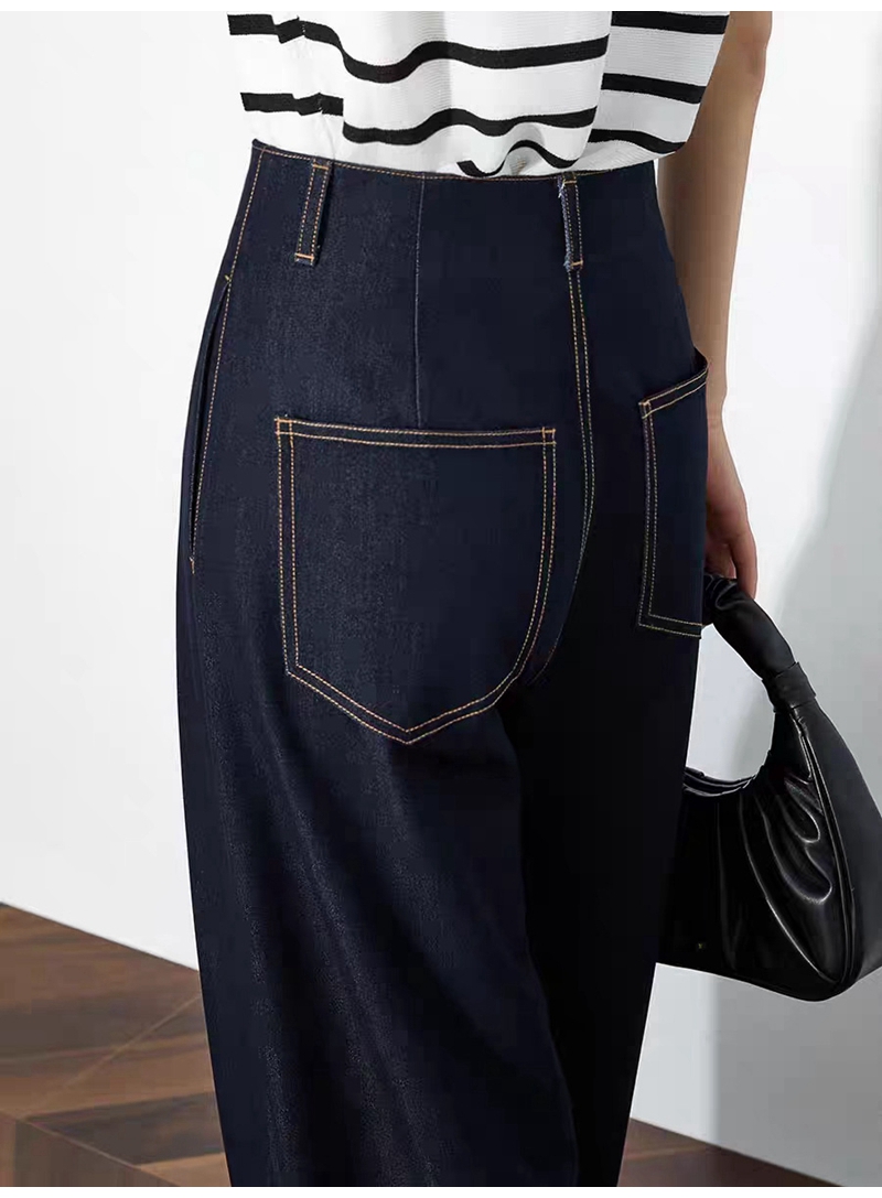 时尚高腰拉链抗皱垂感明线阔腿牛仔裤