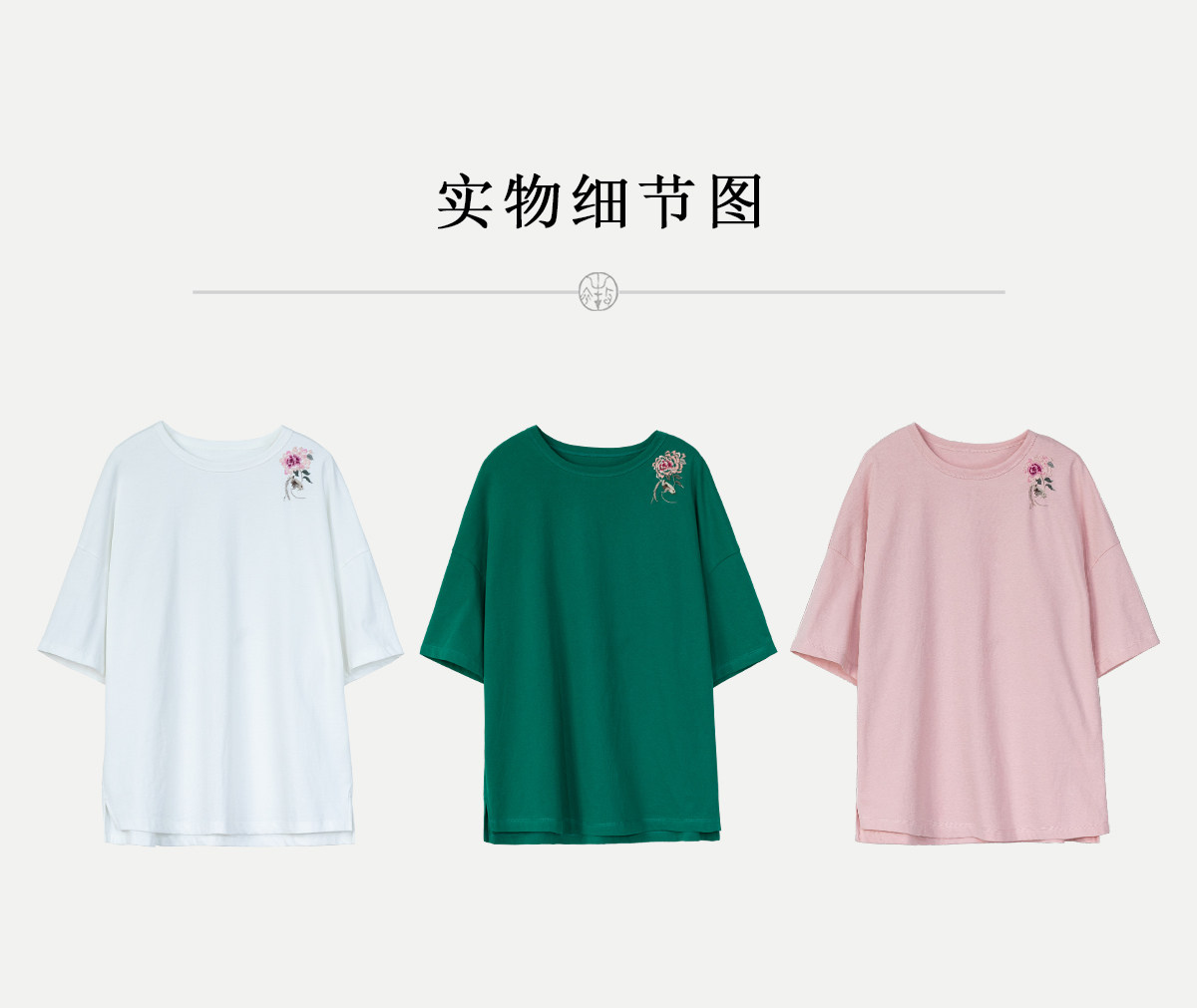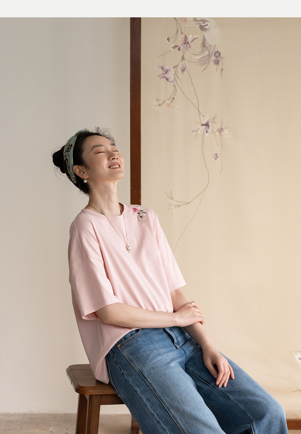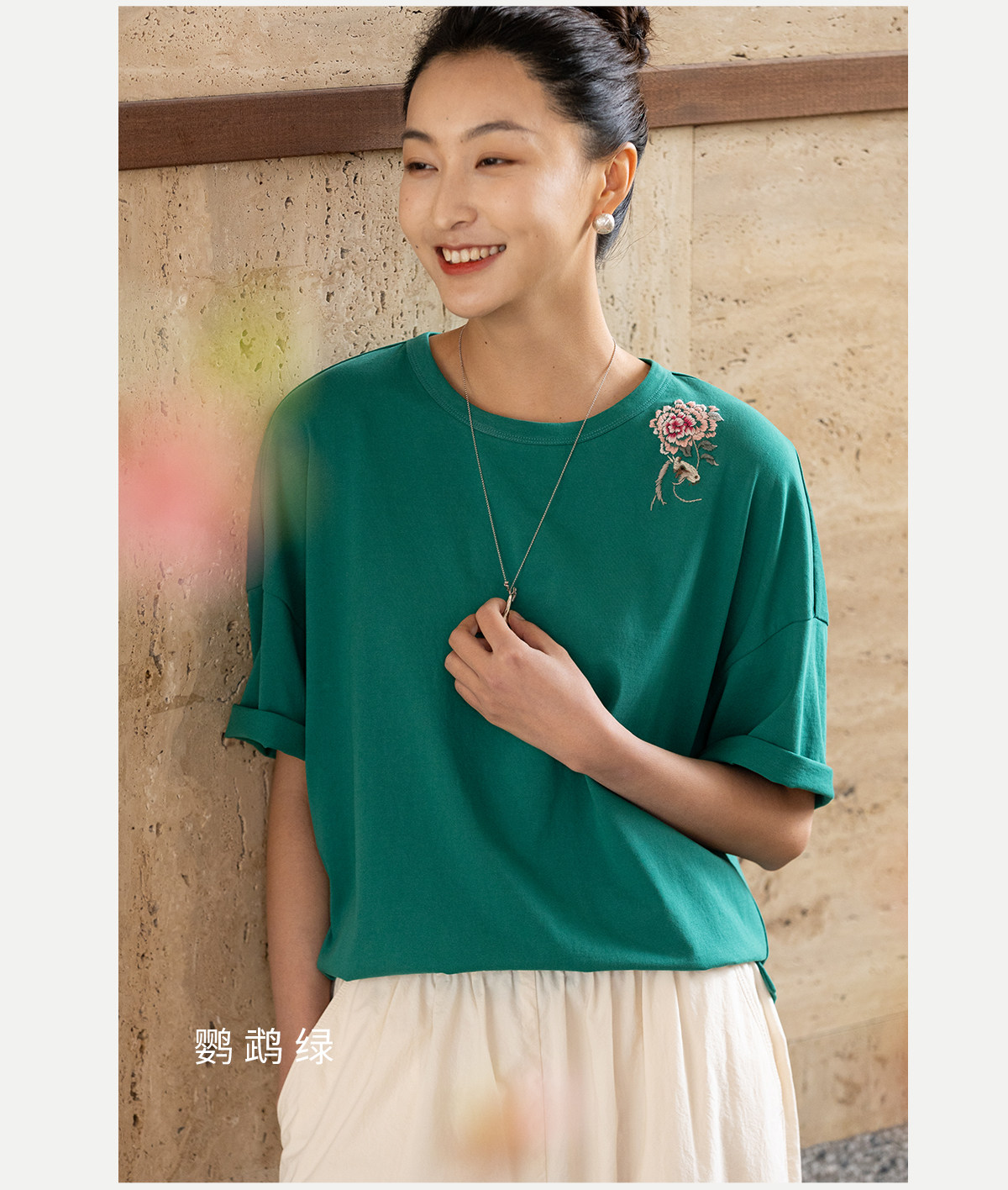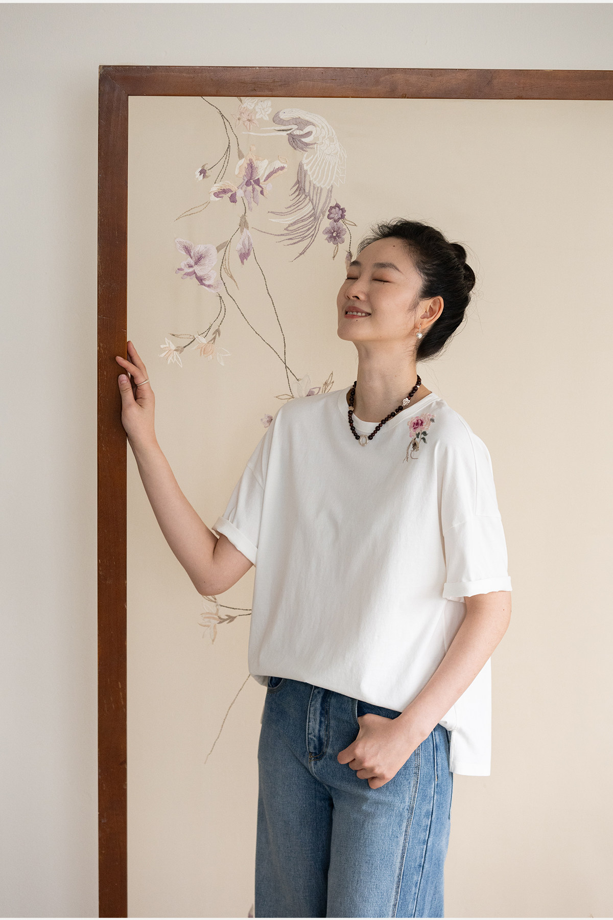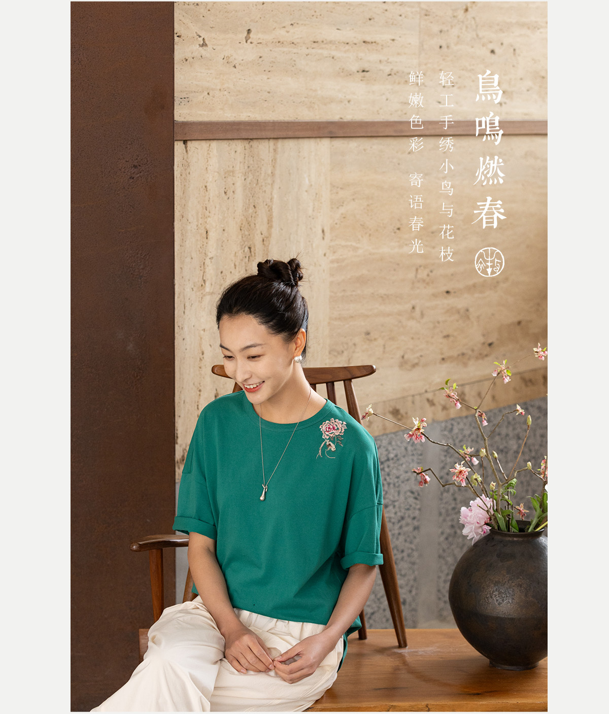 牧衣游原创20支手工刺绣棉质T恤宽松圆领纯色简约百搭短袖 迎春乐