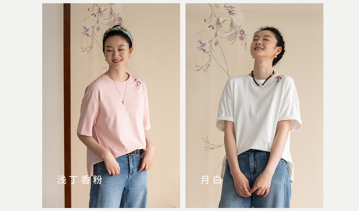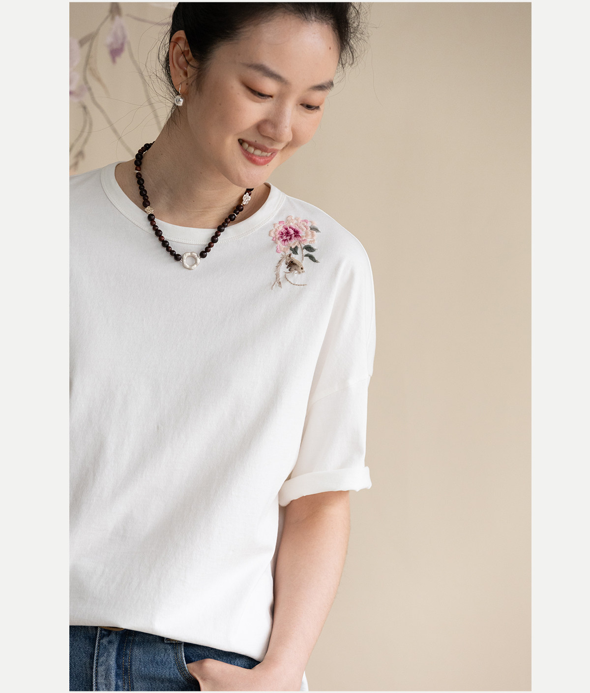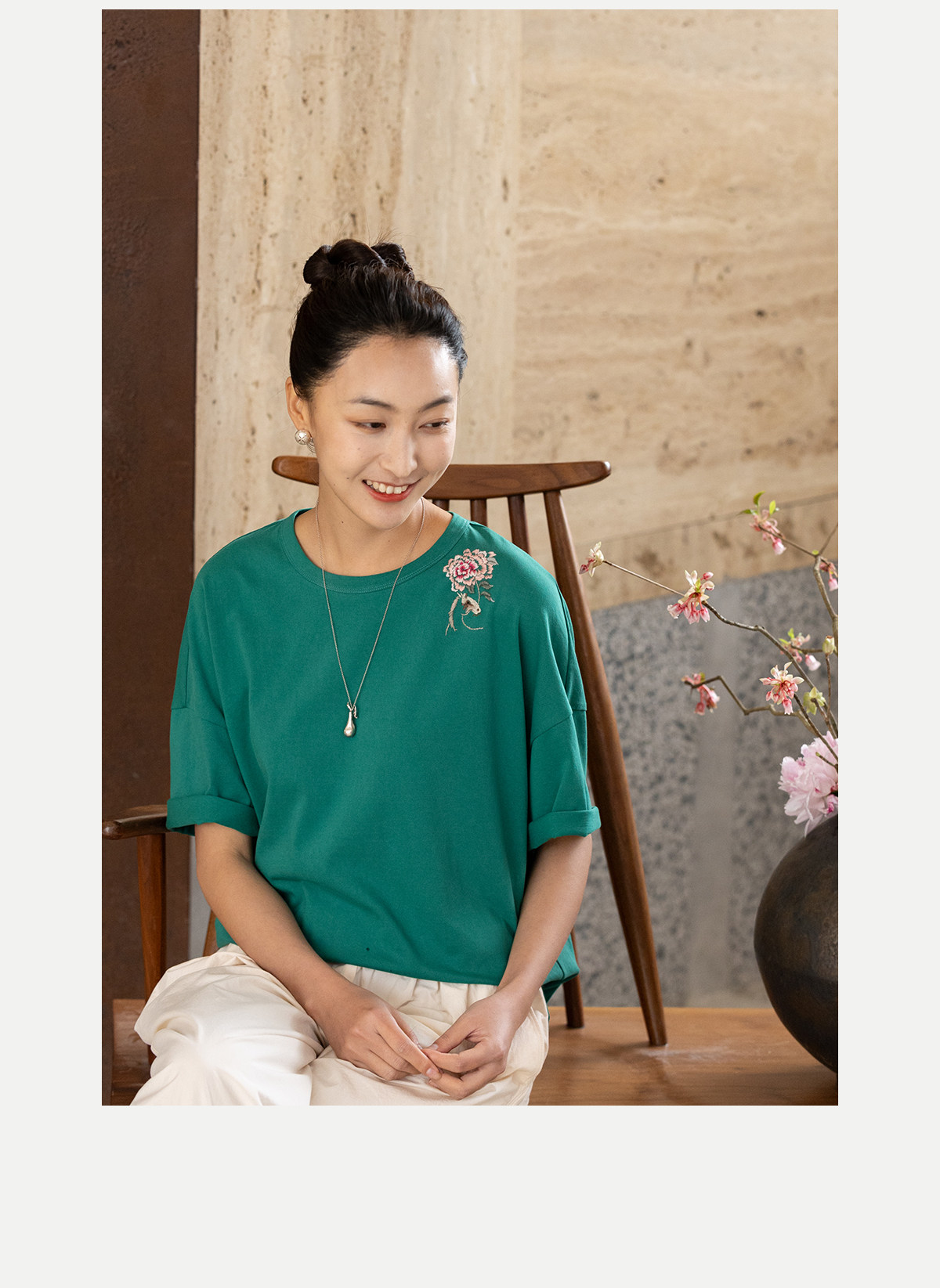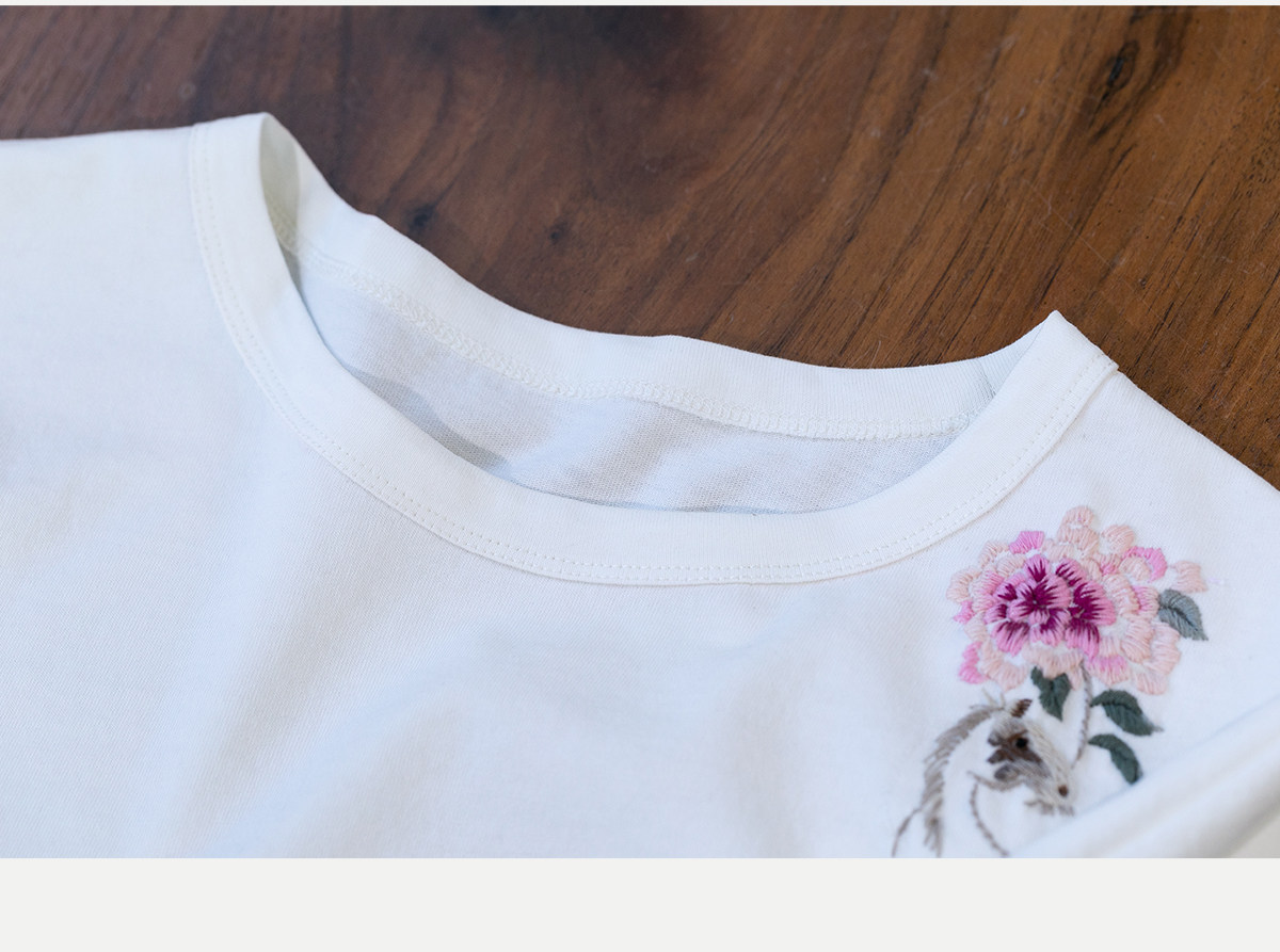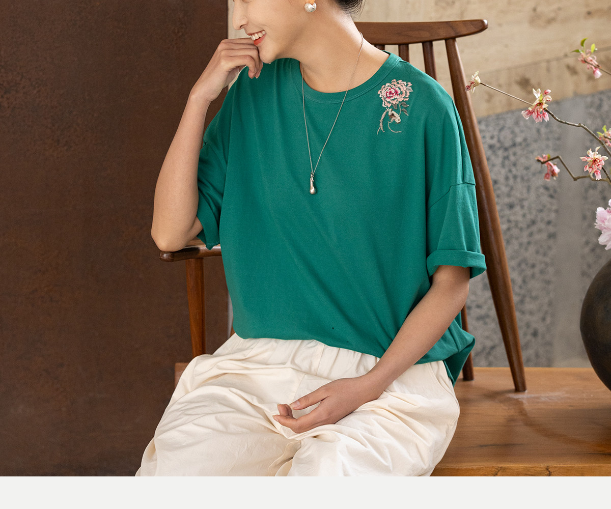 牧衣游原创20支手工刺绣棉质T恤宽松圆领纯色简约百搭短袖 迎春乐