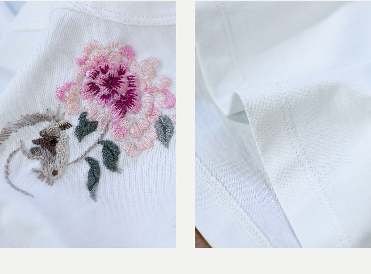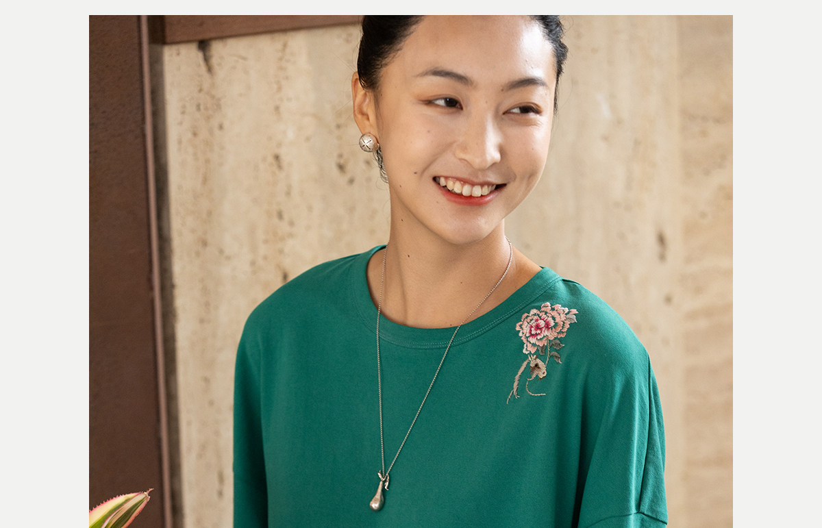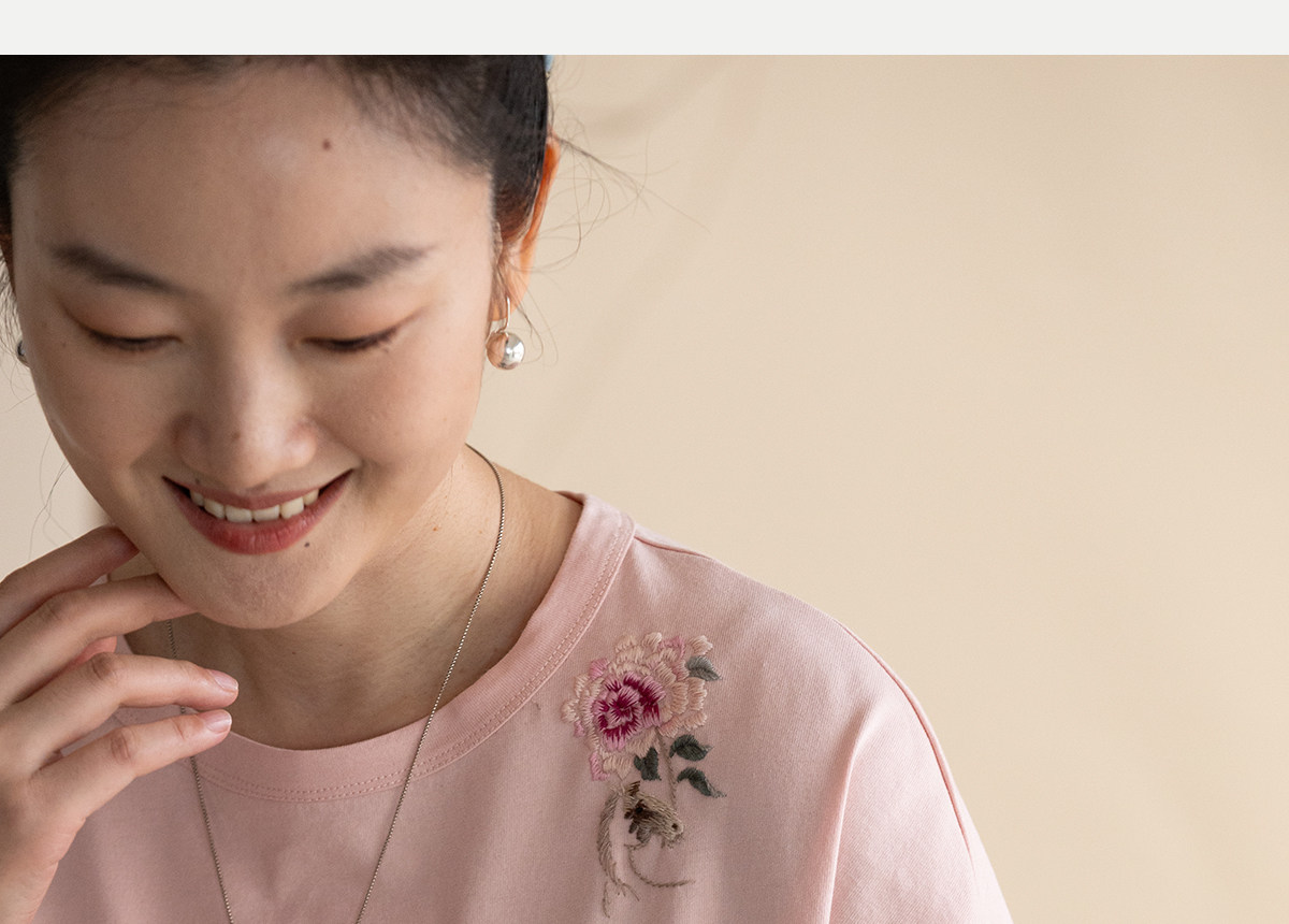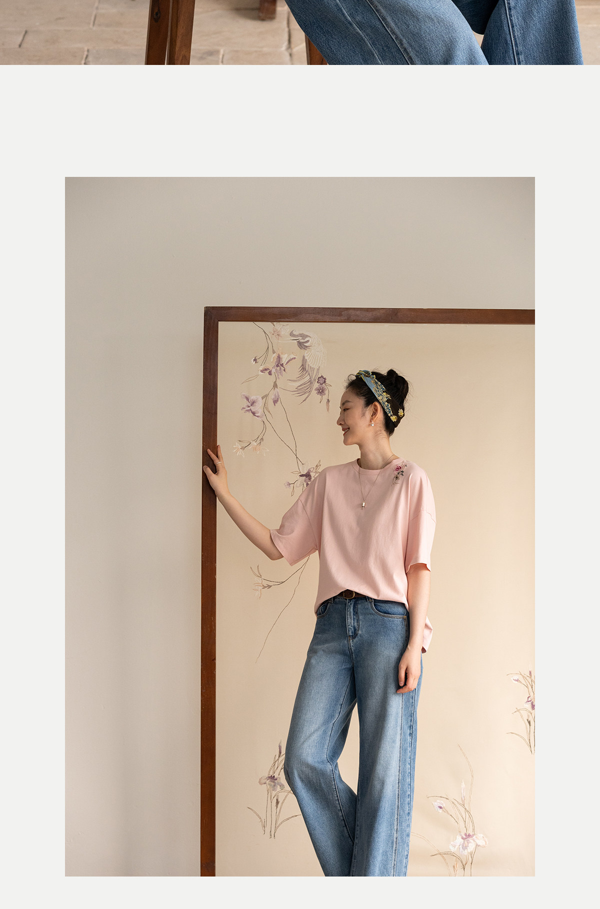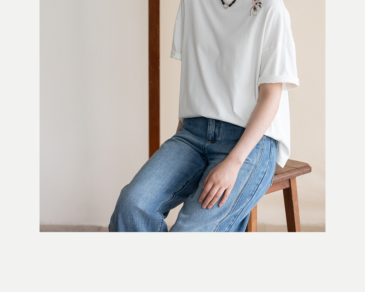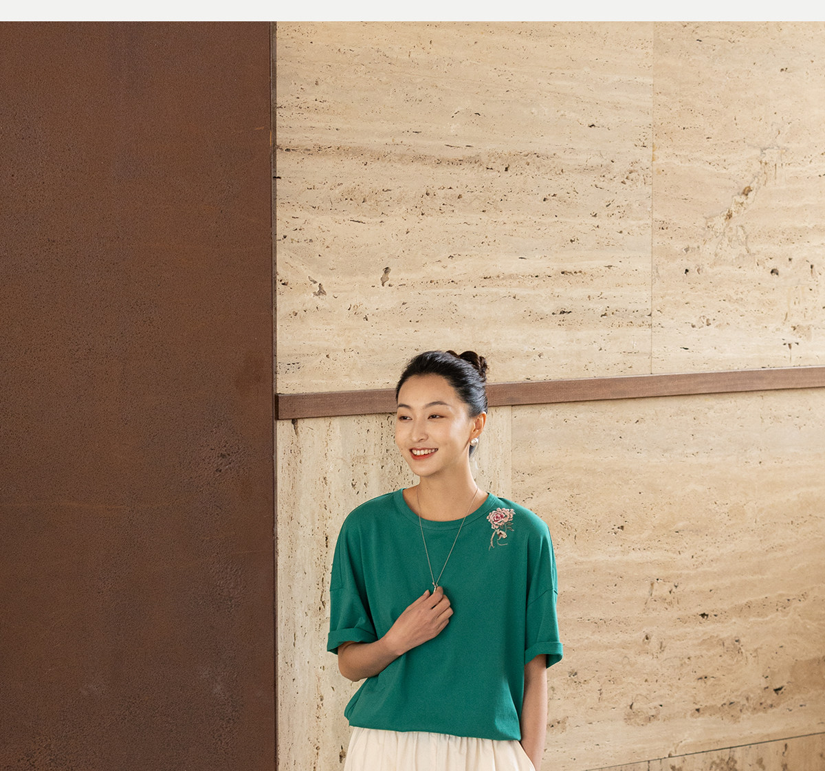 牧衣游原创20支手工刺绣棉质T恤宽松圆领纯色简约百搭短袖 迎春乐