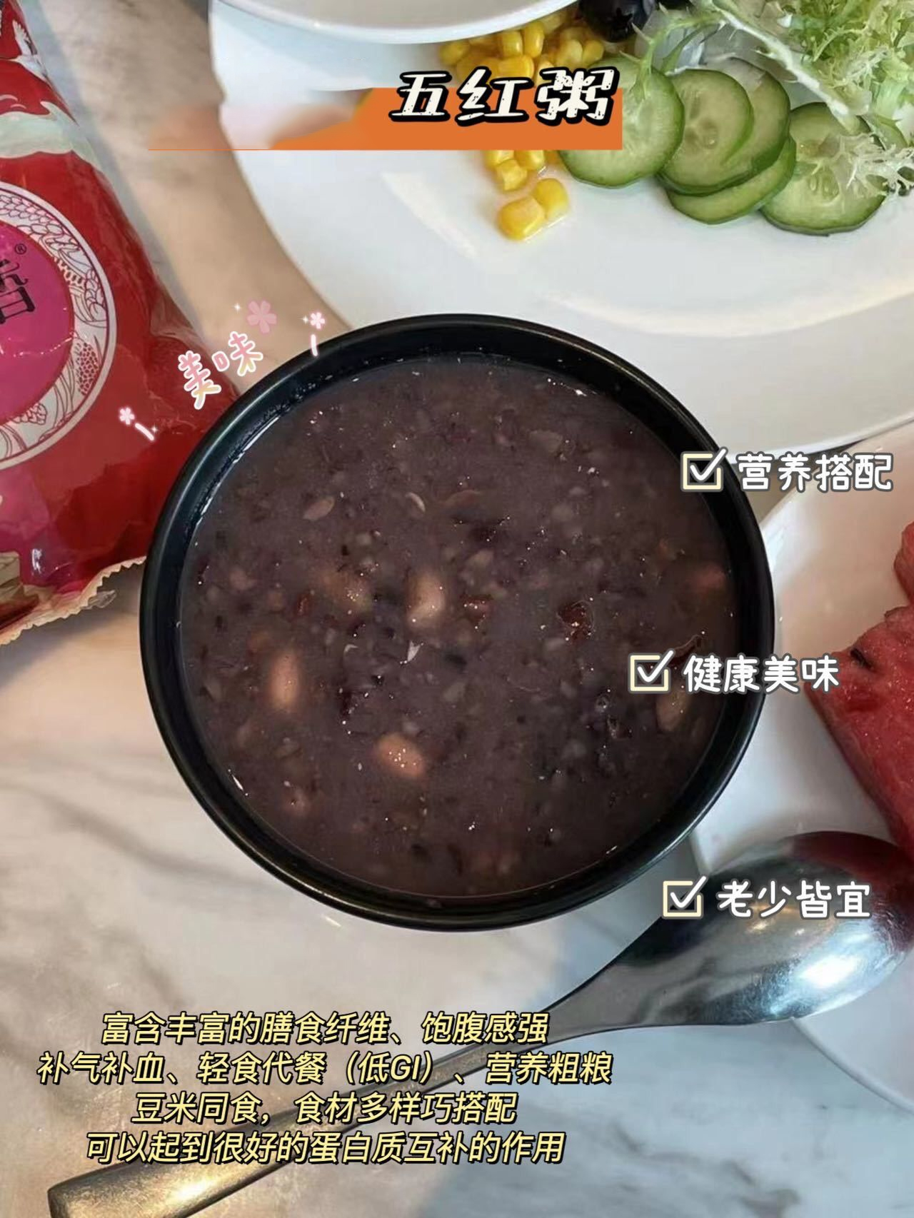 五红粥一般是指红豆、红米、血糯米、红枣、红皮花生这五种颜色偏红的食材,因为都是具有极高的医用价值,并且搭配在一起可以熬制成美味的营养粥。