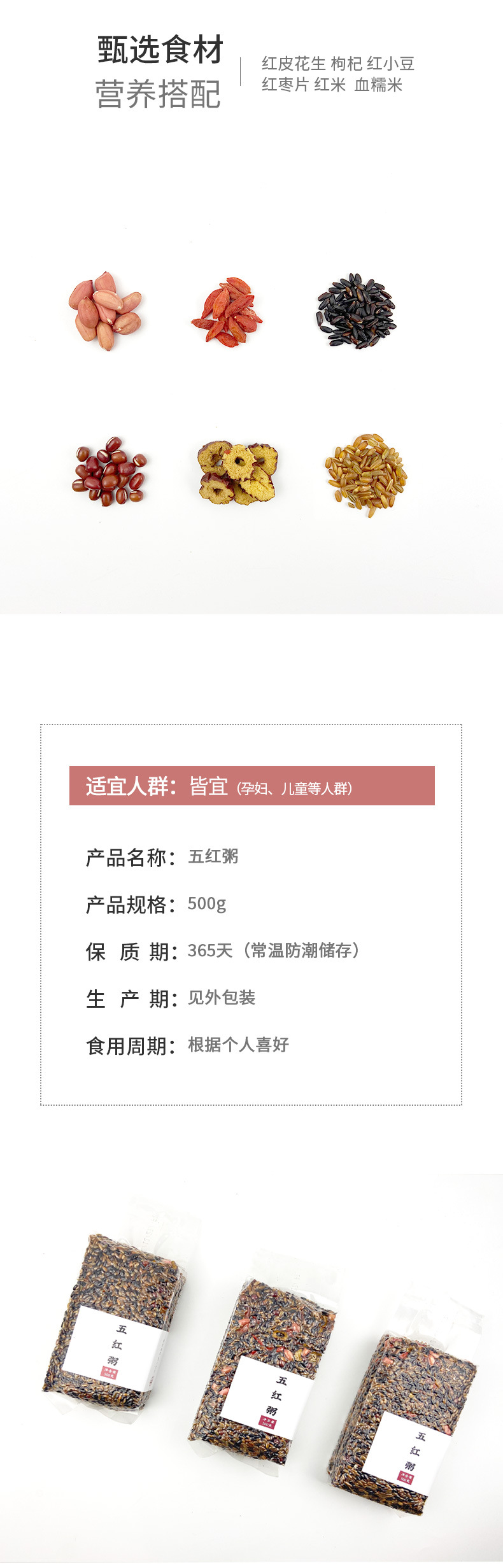 很多时候,我们需要喝一碗五红粥,一般的饭店粥店还没有买,自己去超市买的话,价格还贵,好几种食材买回去,配比不知道怎么搭配,买多了吃不完,买少了不够吃,真是难啊。而我们今天开团的【五红粥】,价格真的是捡到了,39.9元/3包,每包独立包装,1包500g,吃不完常温储存即可.最重要的是,食材配比都已搭配好,开袋直接煮就可以,省时省心更省力