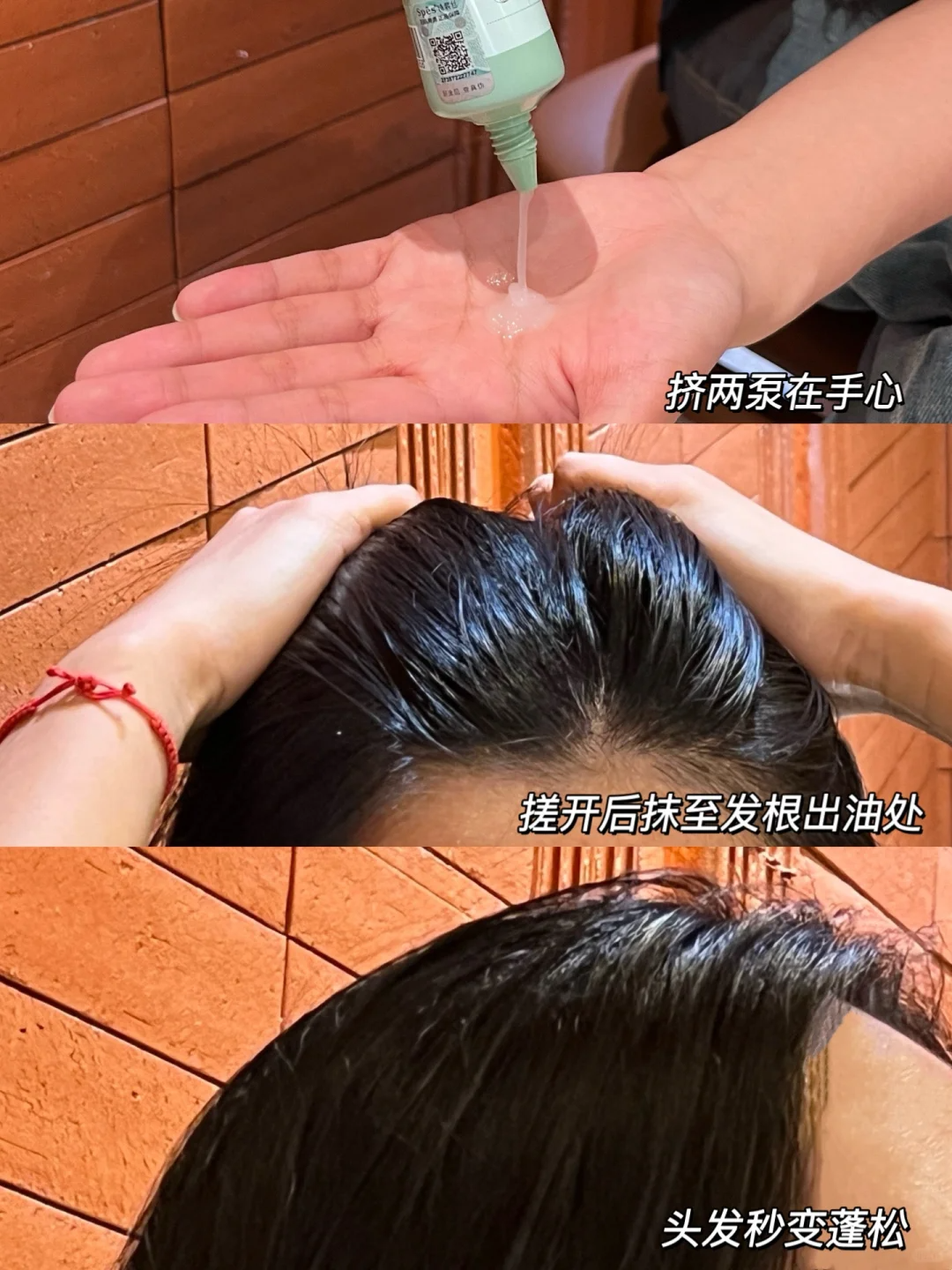✅取适量产品于掌心(一次建议1角硬币大小),揉搓均匀后均匀涂抹于发根油腻部位,需要少量多次使用。