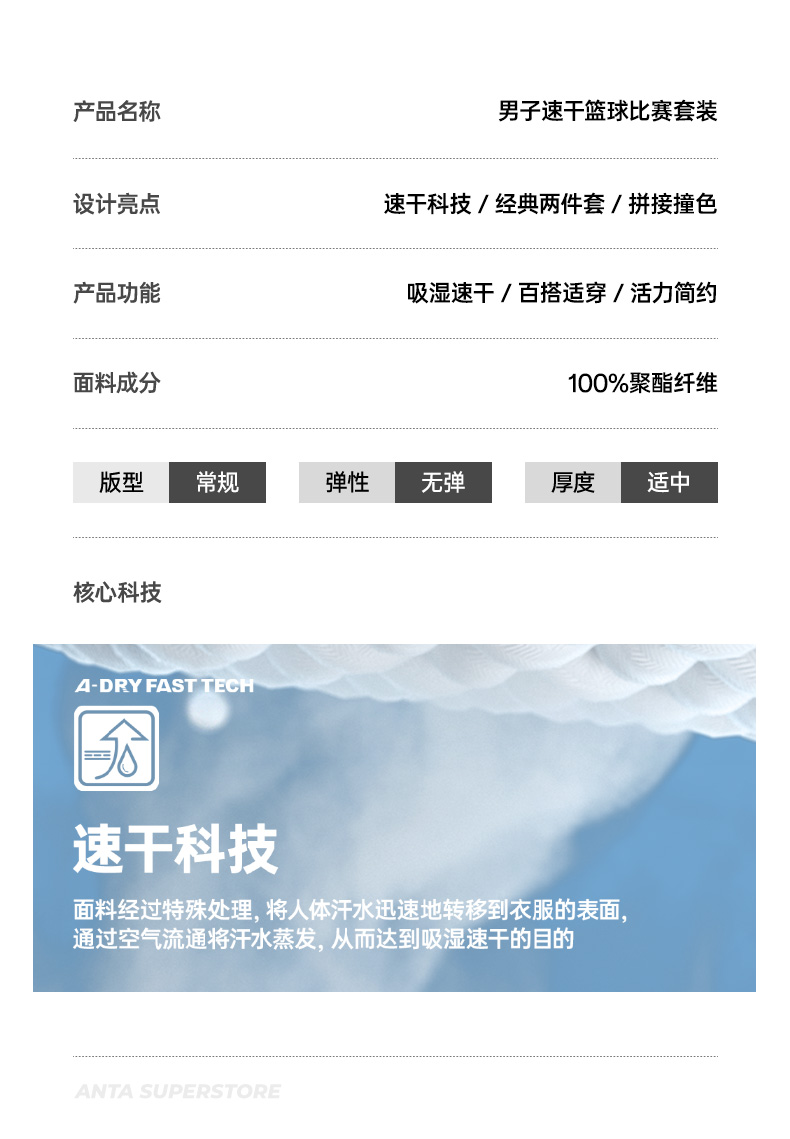 超级安踏男子速干篮球套装透气比赛服运动背心短裤T恤152541202U