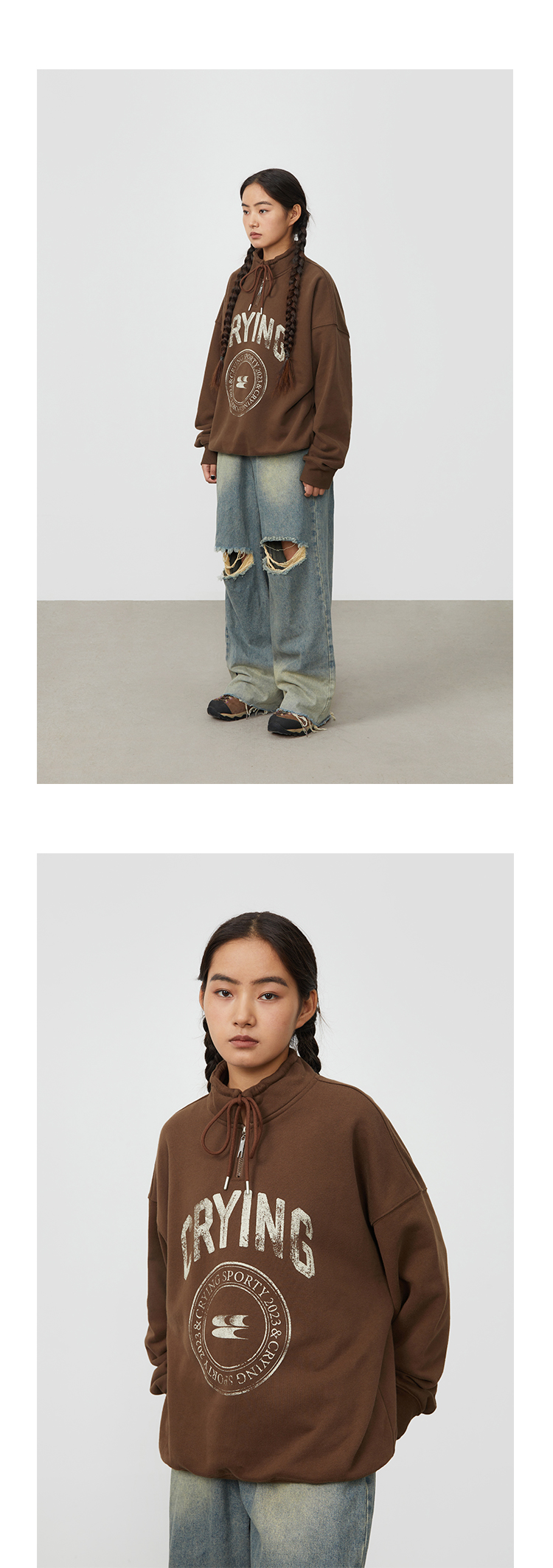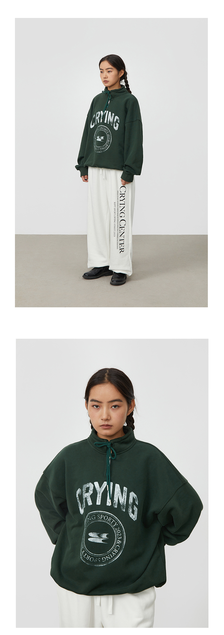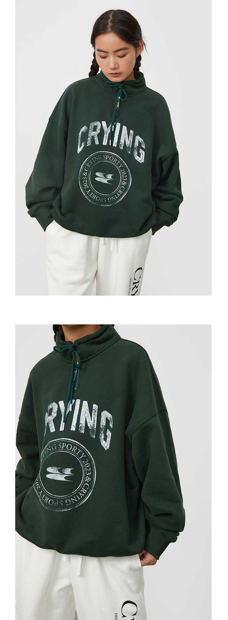 CryingCenter 复古图章高领抽绳款卫衣棕色墨绿色加绒休闲情侣