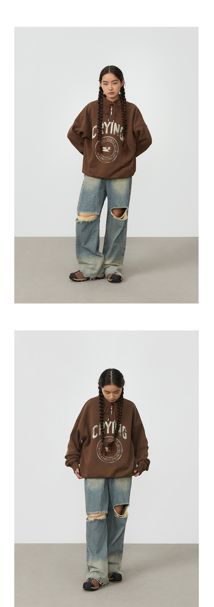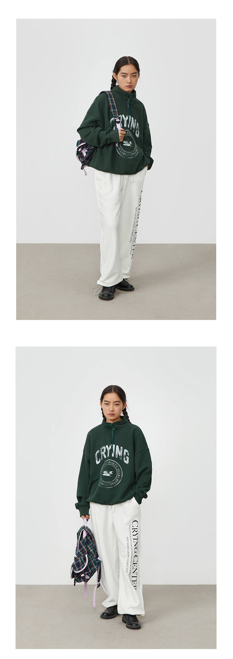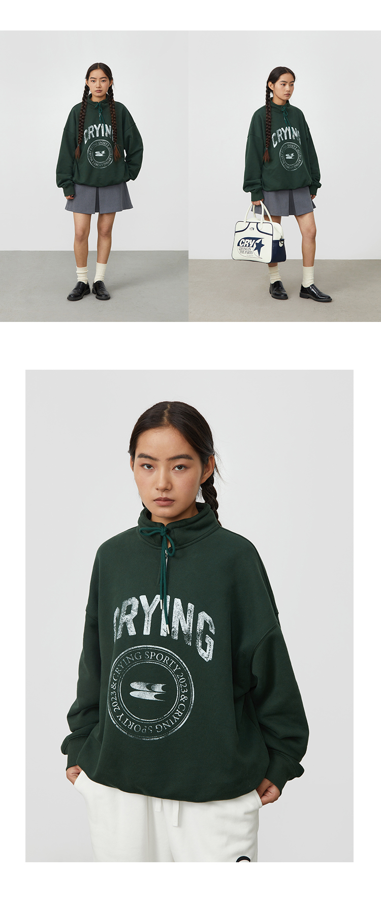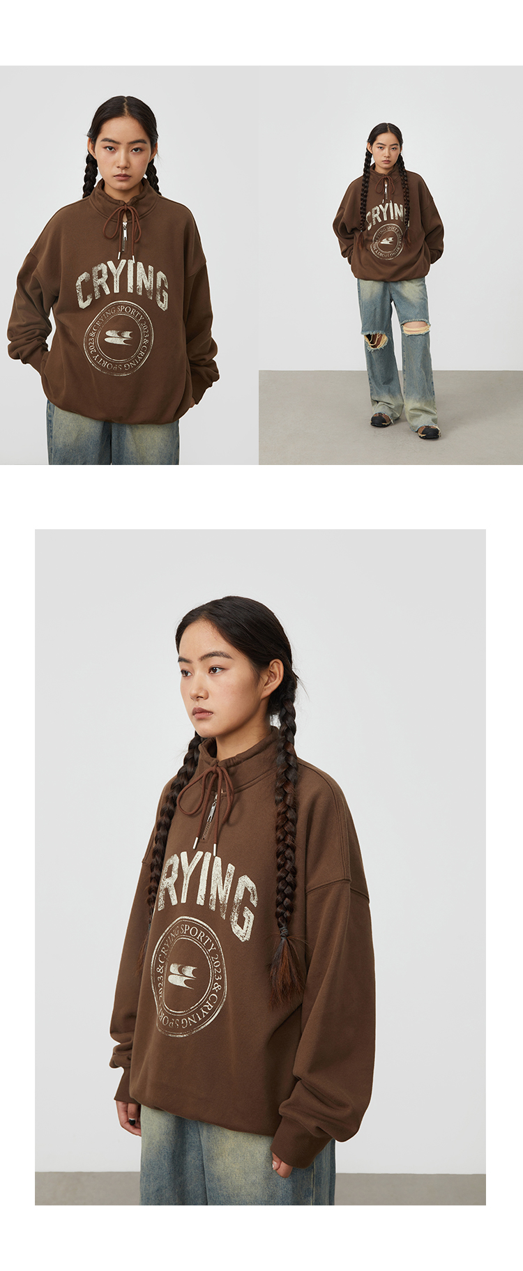 CryingCenter 复古图章高领抽绳款卫衣棕色墨绿色加绒休闲情侣