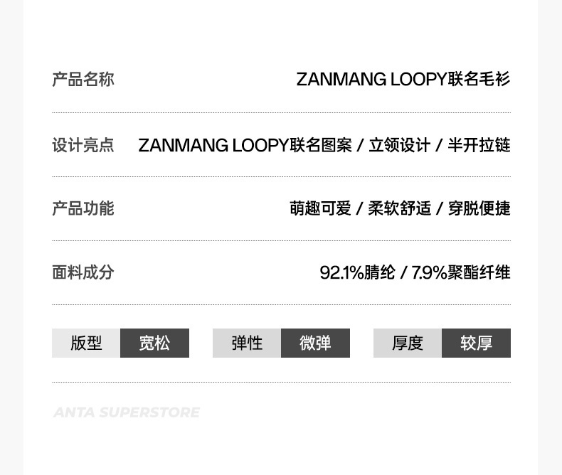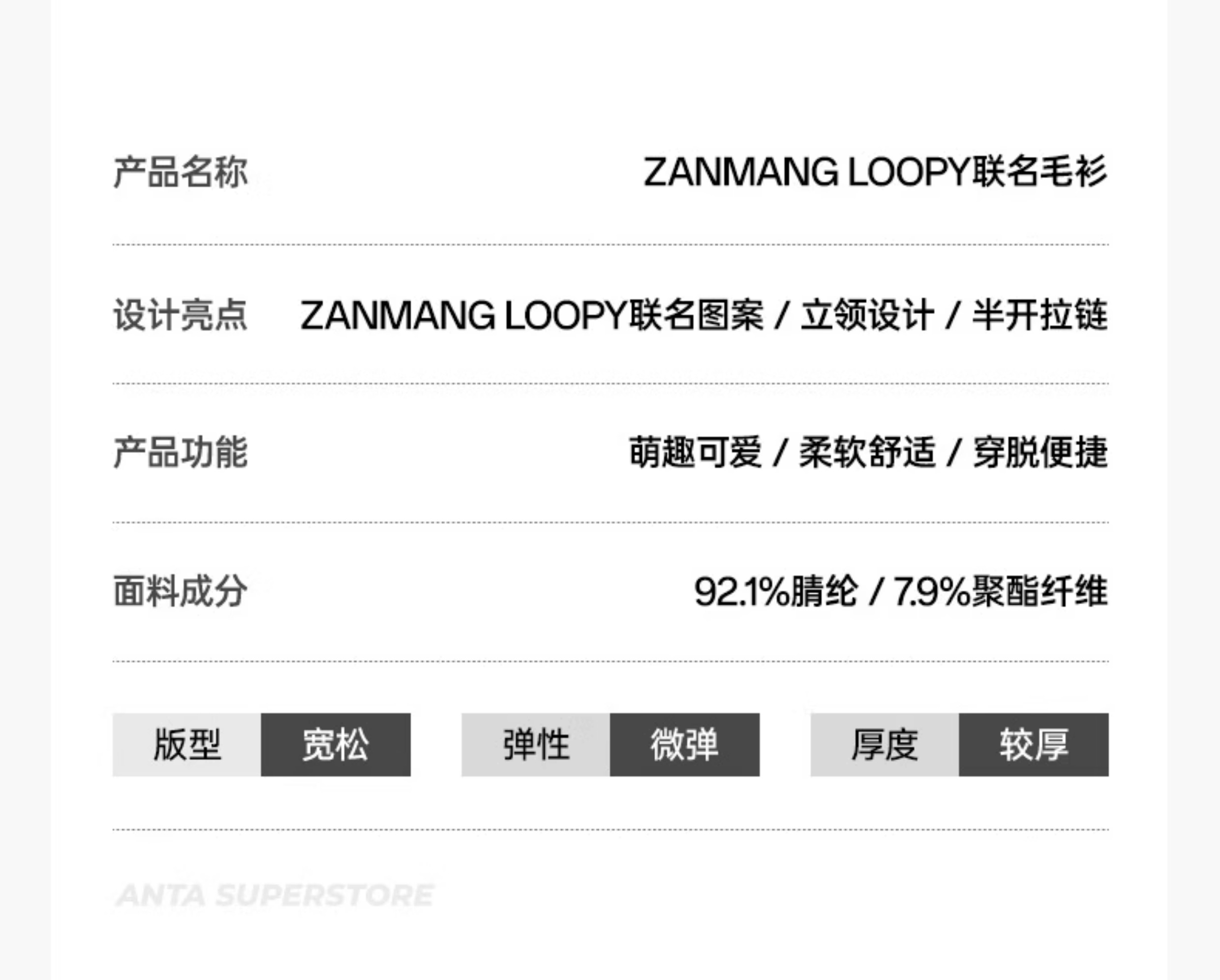 超级安踏ZANMANG LOOPY联名丨毛衣女士秋冬保暖立领宽松编织衫162548724U