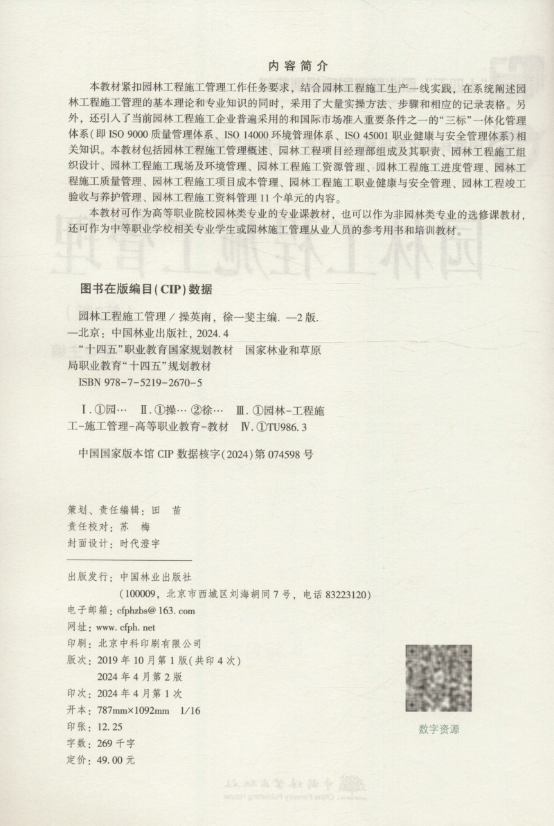 园林工程施工管理(第2版国家林业和草原局职业教育十四五规划教材) &2670
