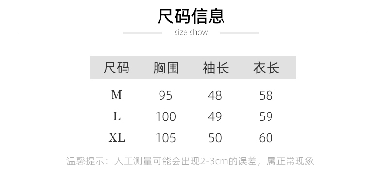 4.尺码信息以及推荐尺码数据根据平均身材得出,适用于大部分人群,仅供参考,买家也可以根据自己的穿衣喜好选择