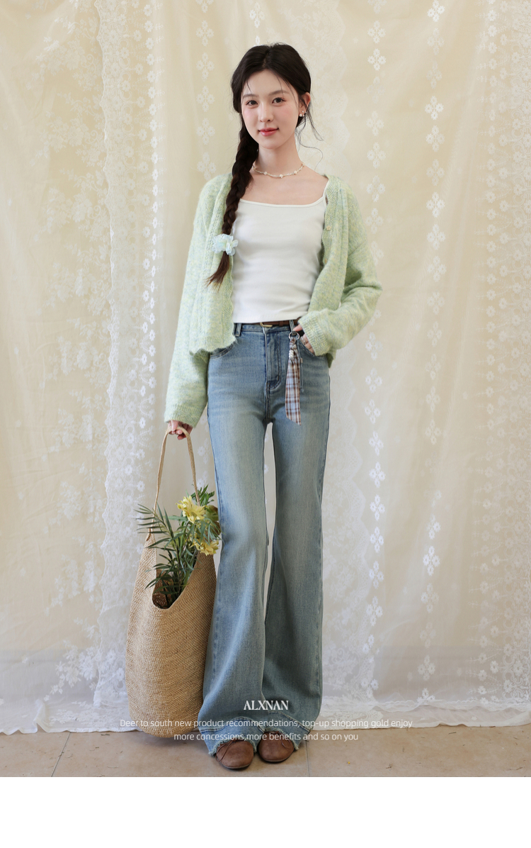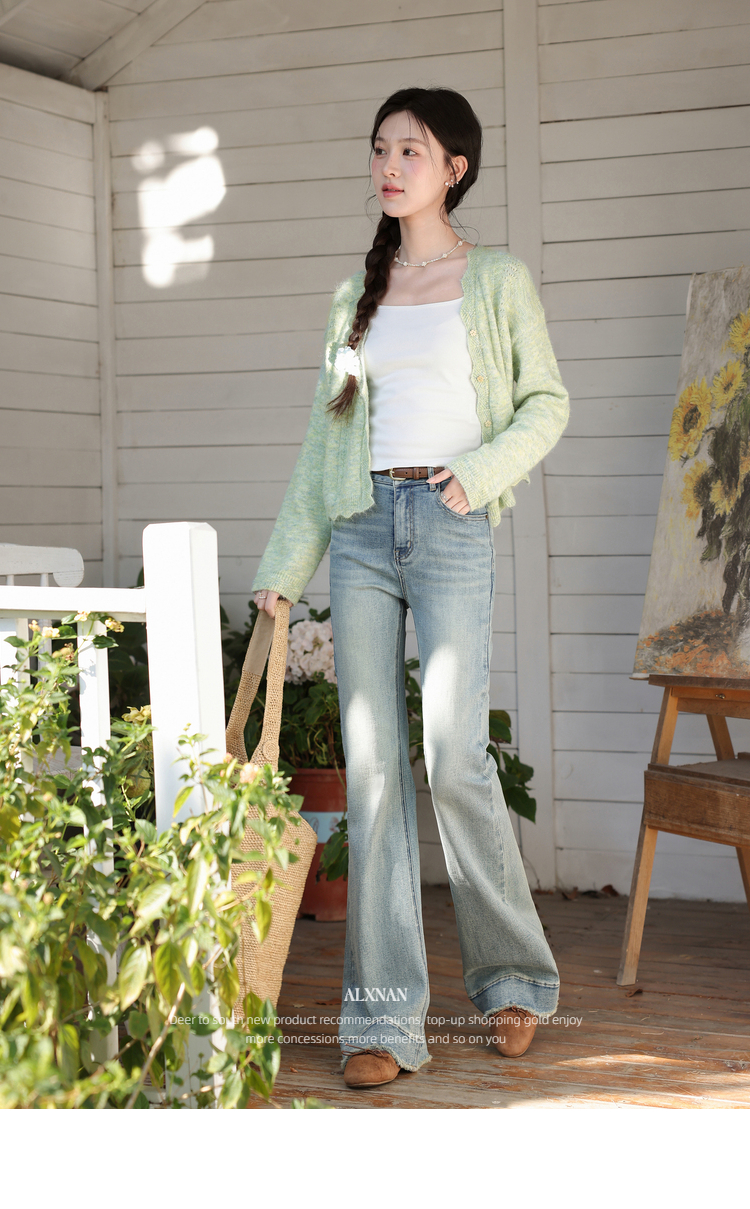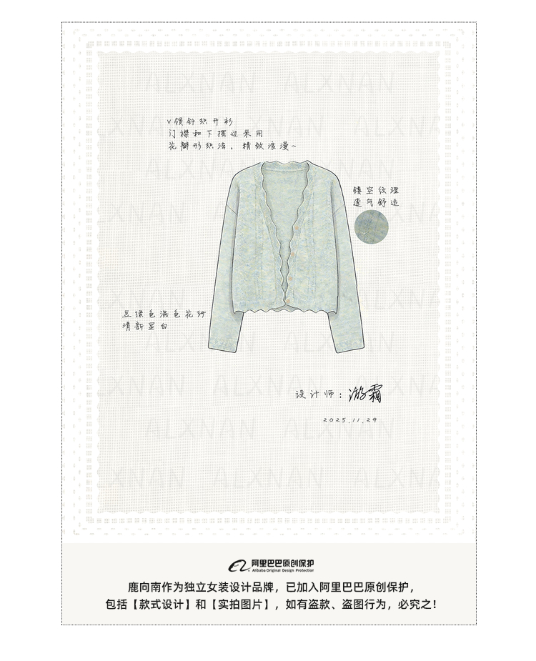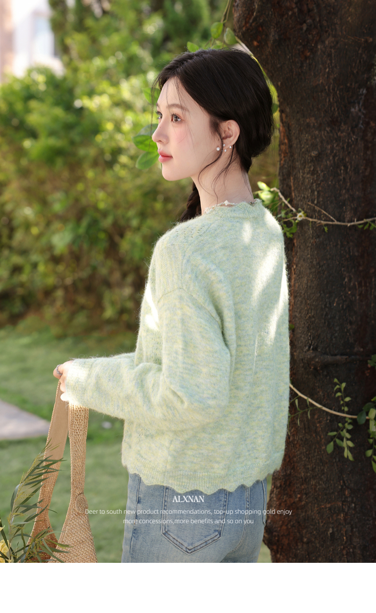 鹿向南「春芽绒暖」豆绿色长袖针织衫女春季轻薄宽松短款开衫上衣